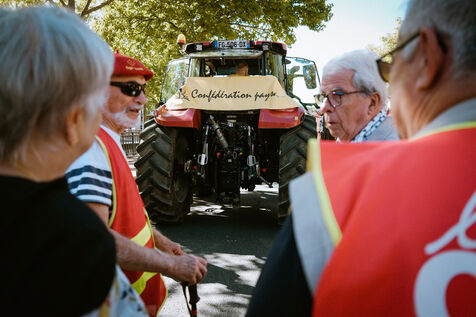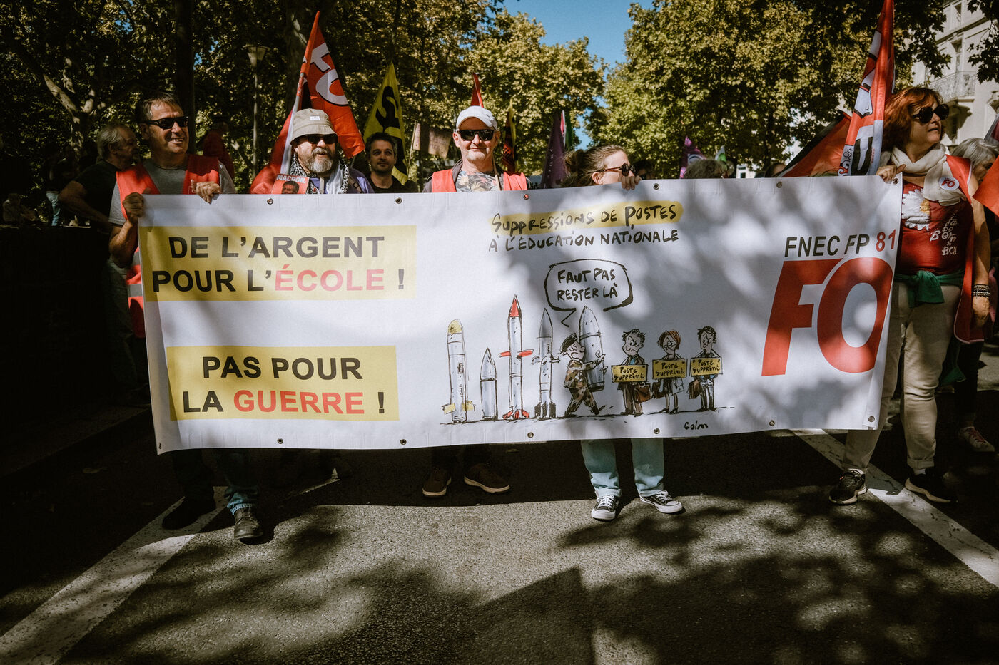 Manifestation nationale organisée par les principaux syndicats suite au refus du premier ministre de prendre en compte leurs revendications pour le prochain budget (augmentation des retraites, abrogation de la loi retraite, instauration du principe d'une taxe Zucman...) à Albi, sud-ouest de la France, le 2 octobre 2025.