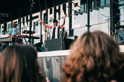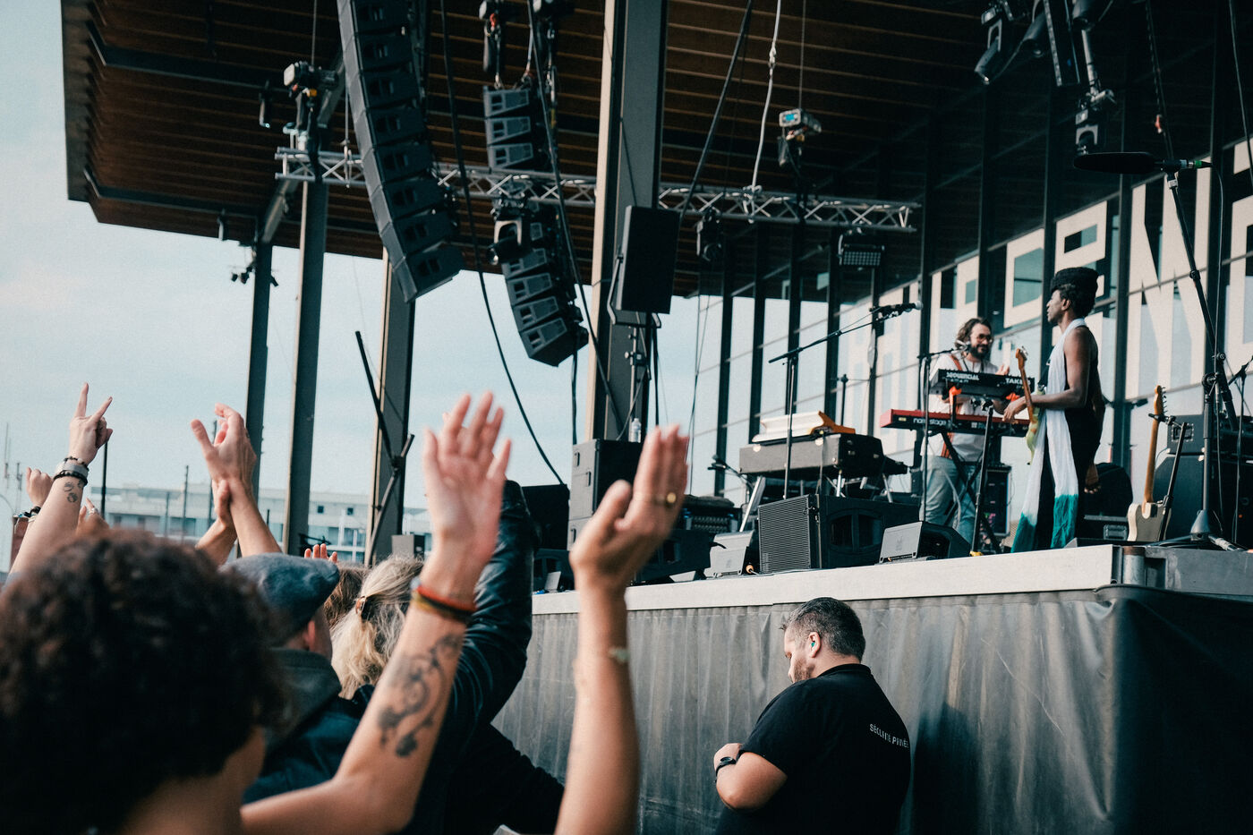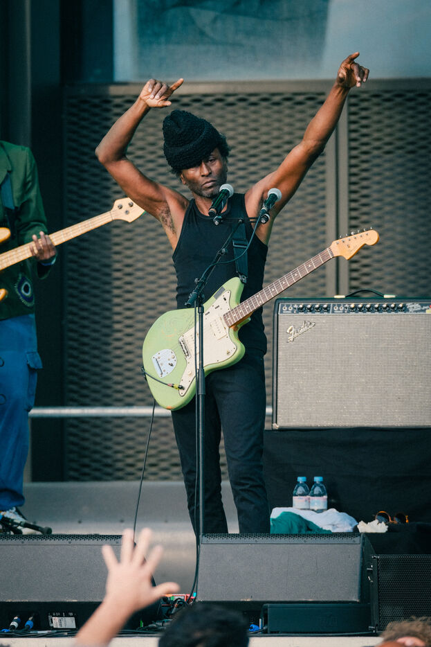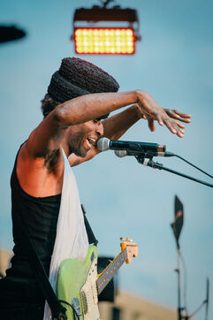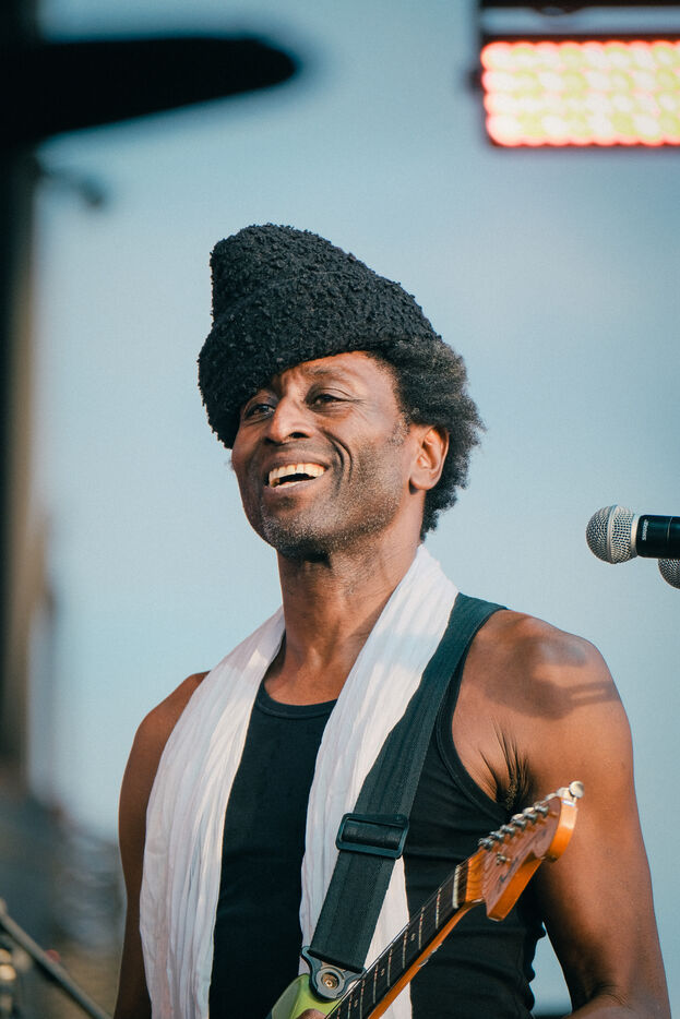 Le chanteur, compositeur et guitariste nigérian Keziah Jones créateur du blufunk sur la scène du festival Mecanik Paradize à la Halle de la Machine à Toulouse, sud-ouest de la France le 3 octobre 2025.