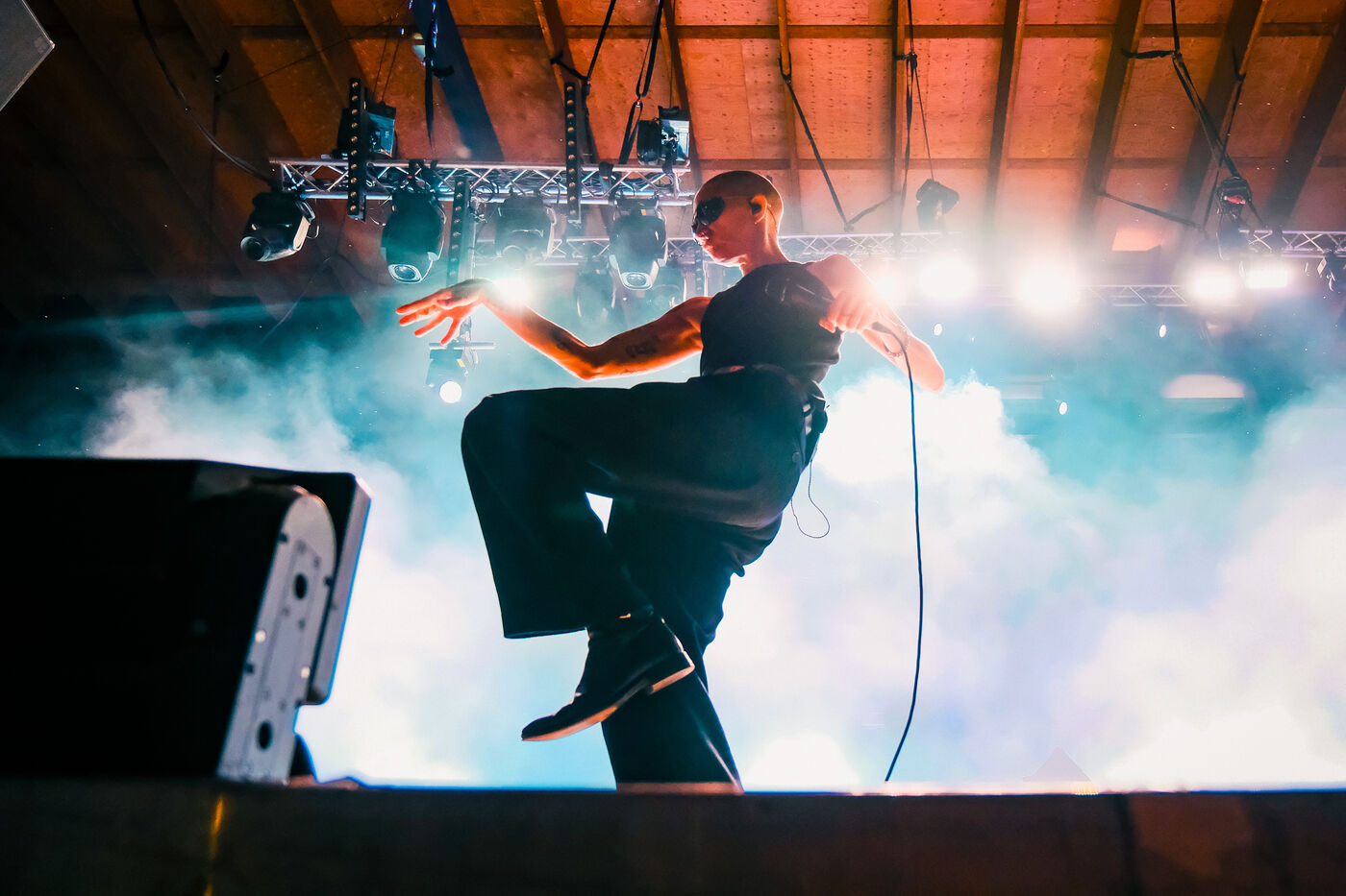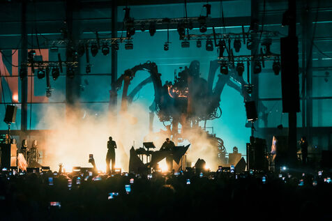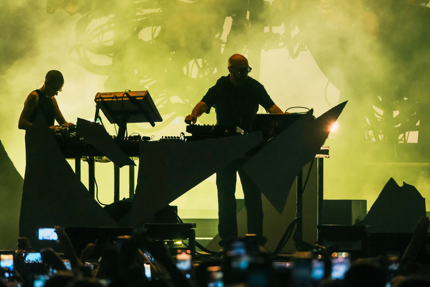 French neo-post-punk electronic music duo Kompromat on stage at the Mecanik Paradize festival at the Halle de la Machine in Toulouse, southwestern France, on October 4, 2025.