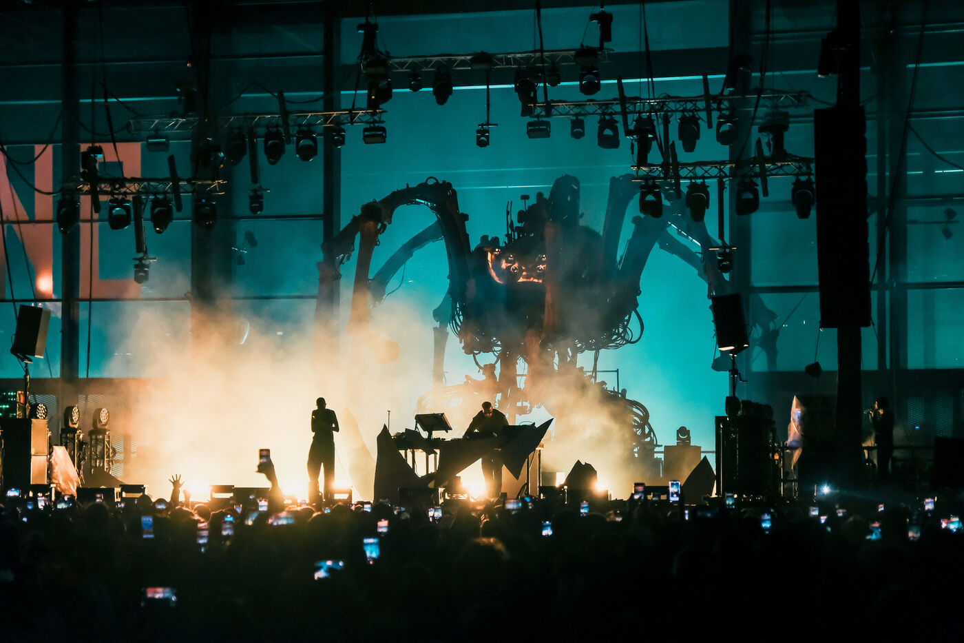 Le duo français de musique électronique néo-post punk Kompromat sur la scène du festival Mecanik Paradize à la Halle de la Machine à Toulouse, sud-ouest de la France le 4 octobre 2025.