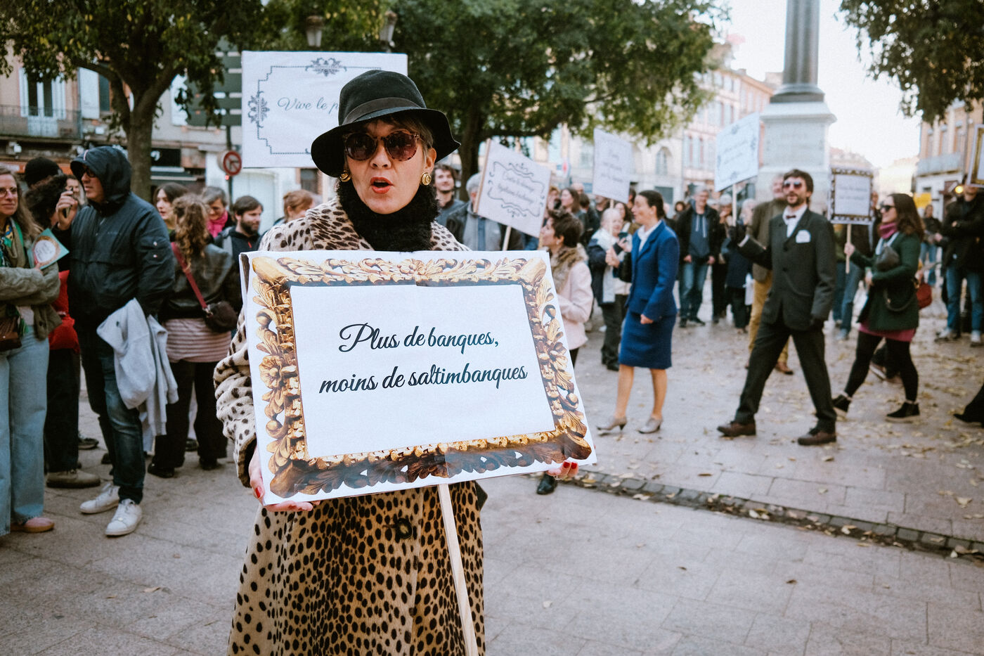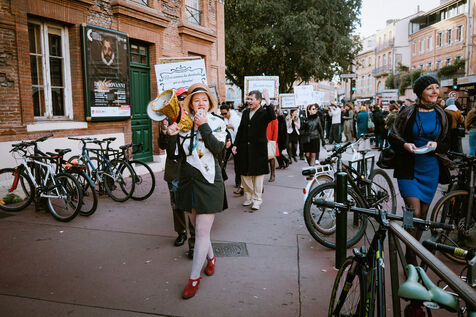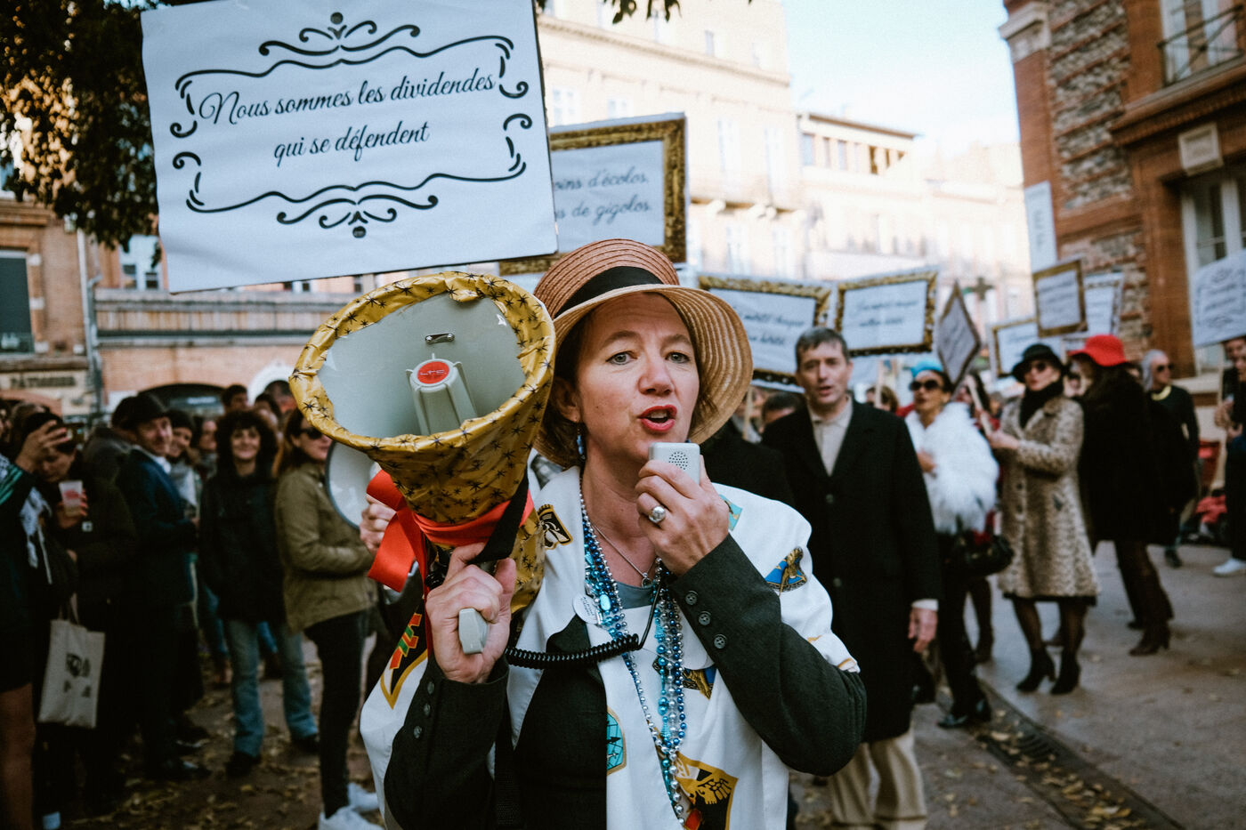 Manifestation satirique sur les ultra-riches (Manif Des Millionnaires) par des partis de gauche et associations de la culture à l'occasion de l'enregistrement de l'émission humoristique La Dernière sur Radio Nova à Toulouse, sud-ouest de la France, le 9 novembre 2025.