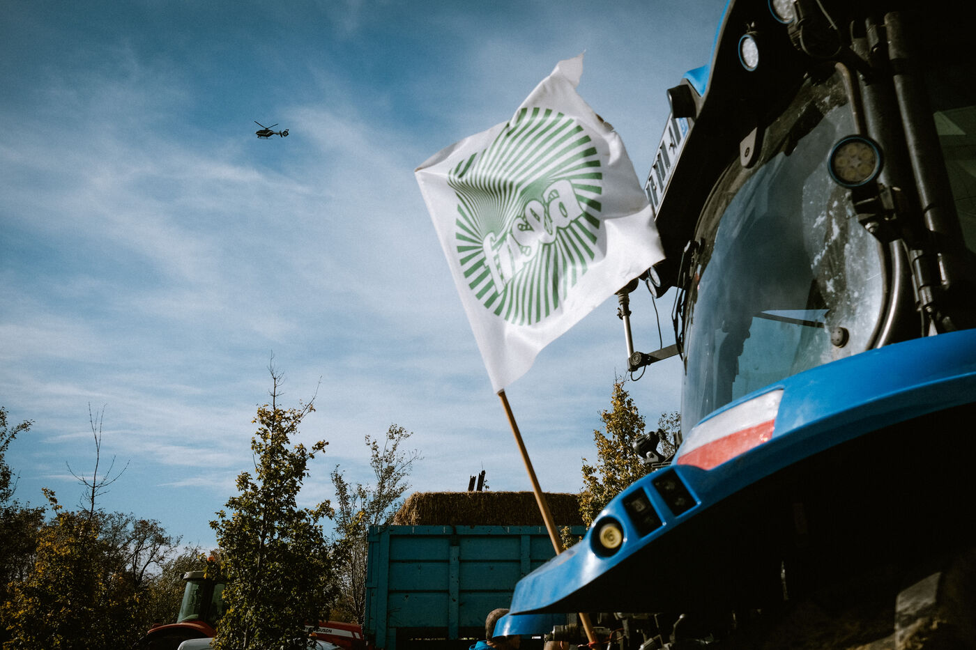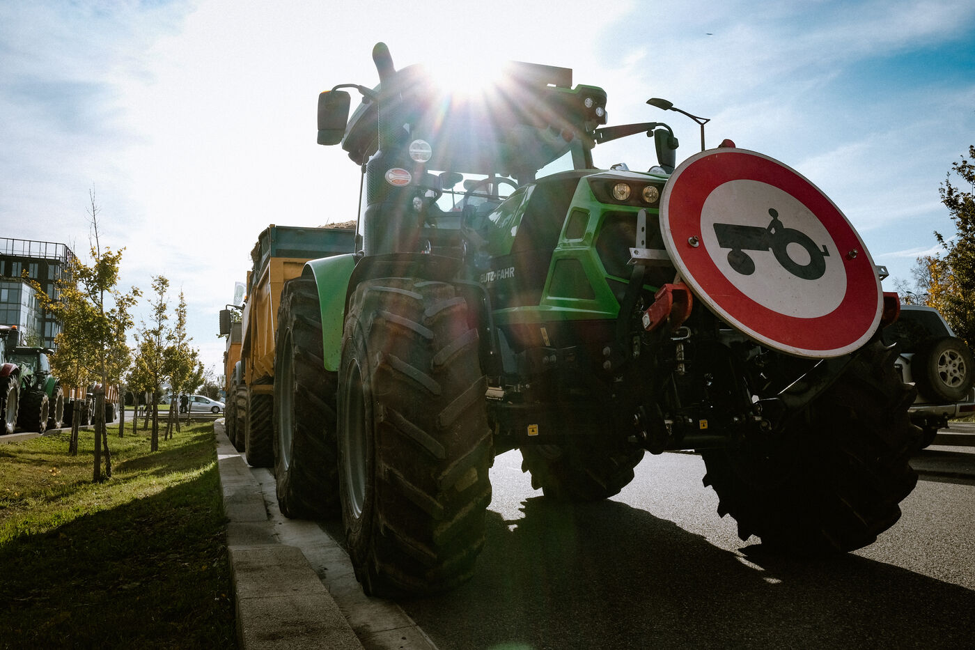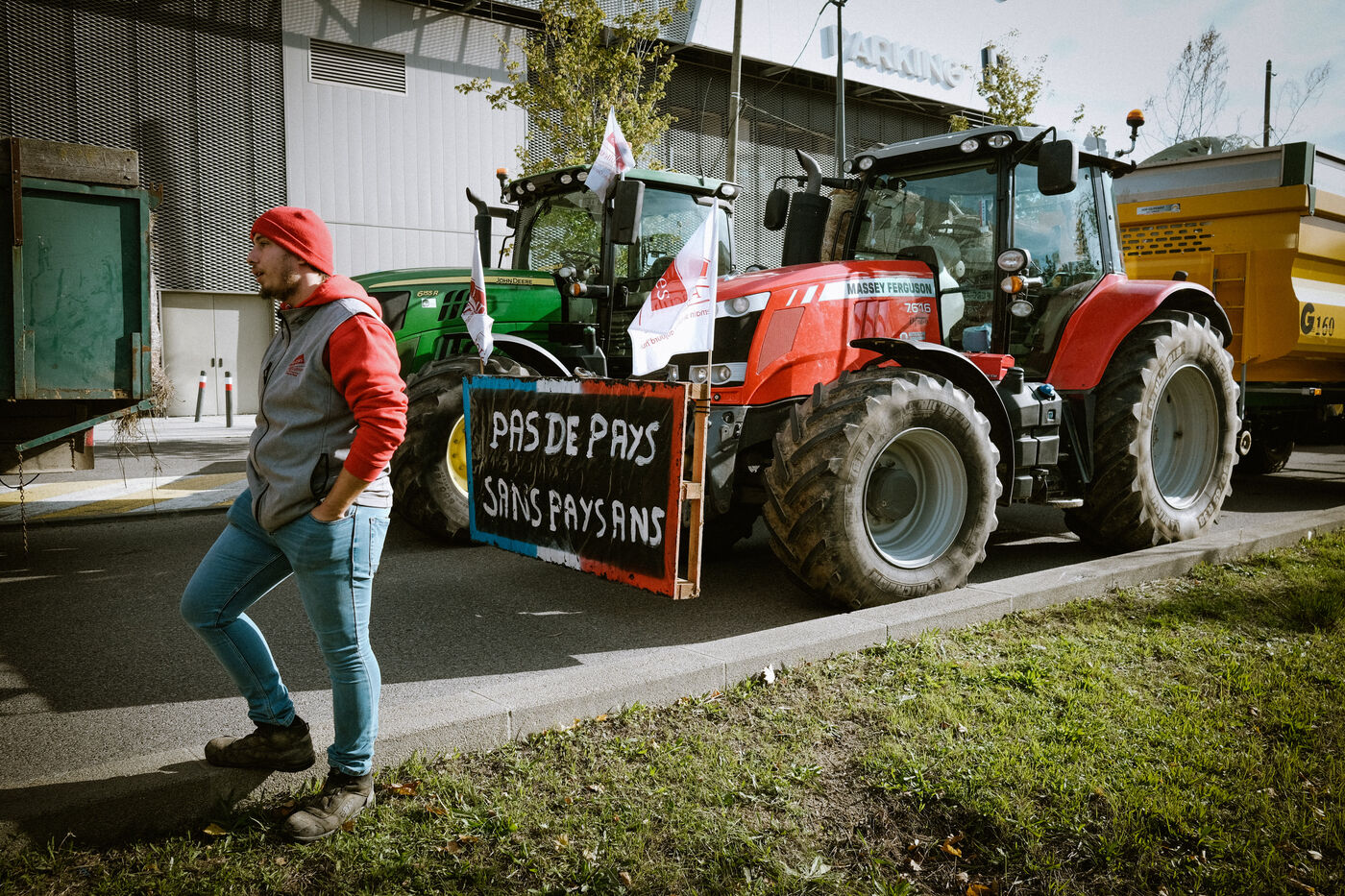 Gathering of farmers with their tractors on the sidelines of President Emmanuel Macron's visit to express their dissatisfaction with his support for the Mercosur free trade agreement with South America in Toulouse, southwestern France, on November 12, 2025.