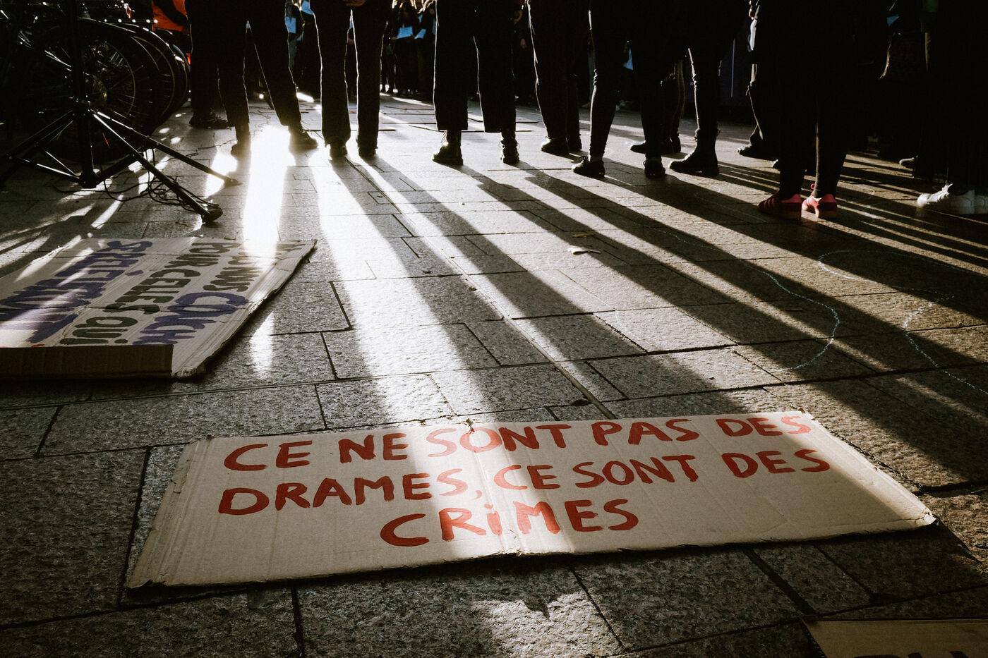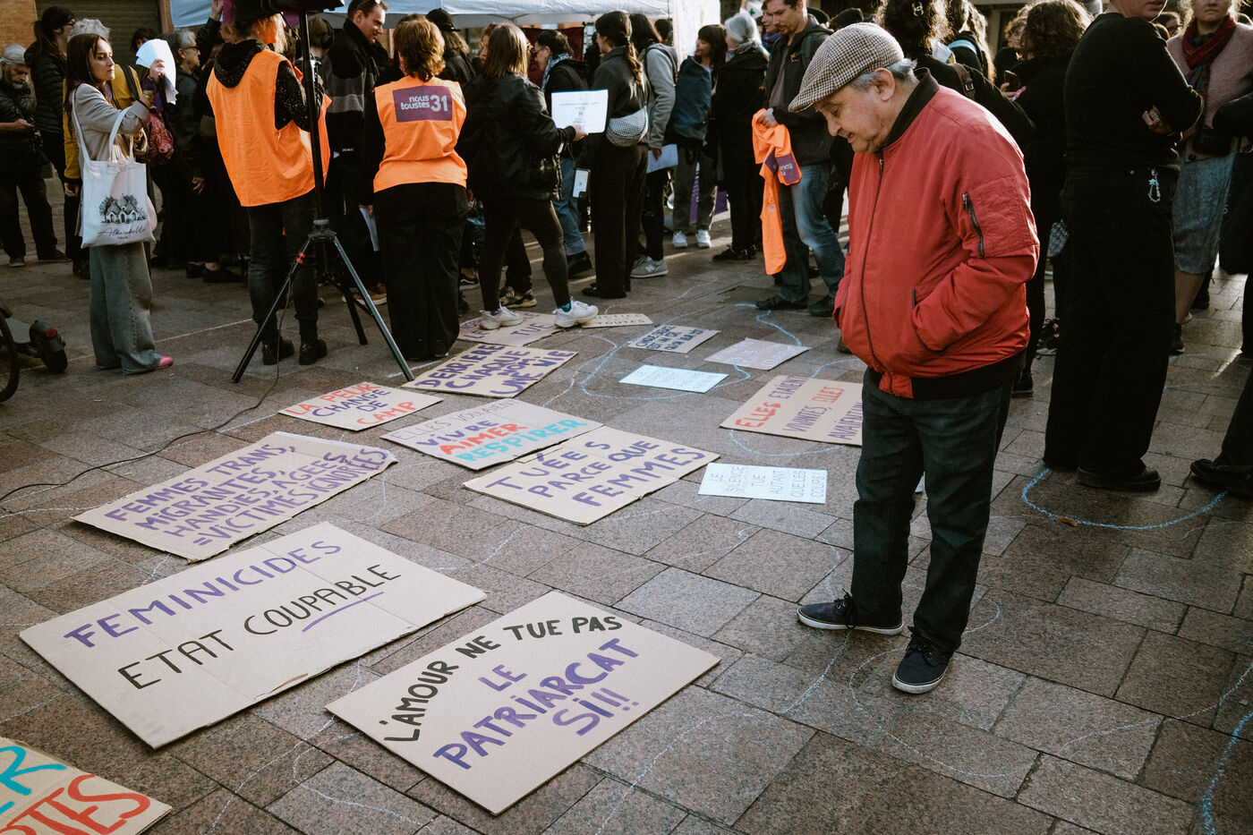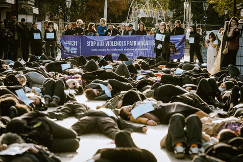 Manifestation et Die-in organisés par l'association NousToutes 31 en hommage à toutes les femmes victimes de féminicides à Toulouse, sud-ouest de la France, le 16 novembre 2025.