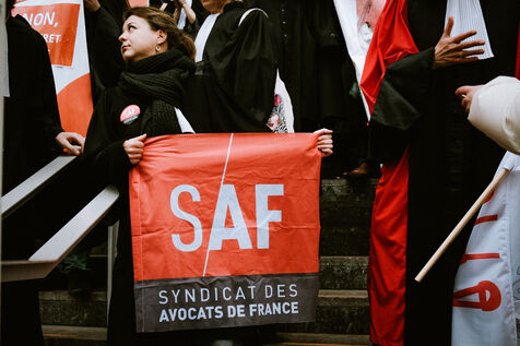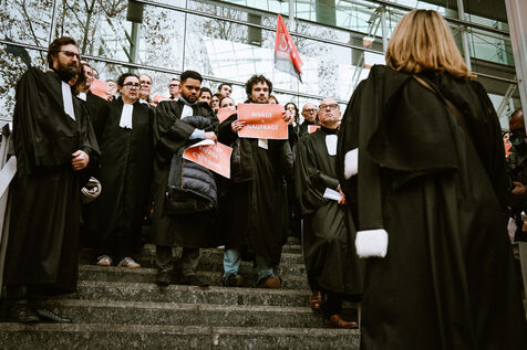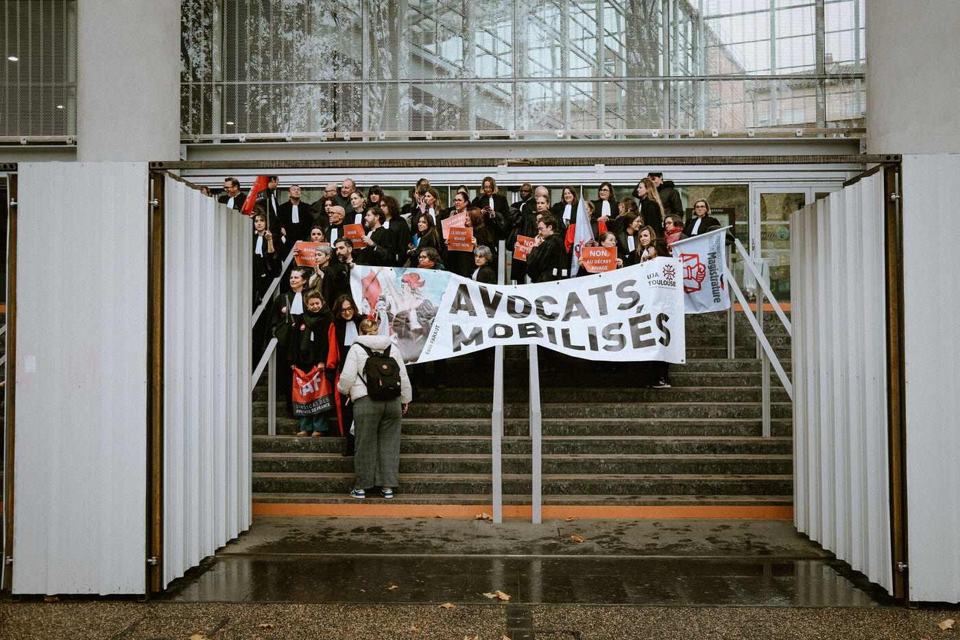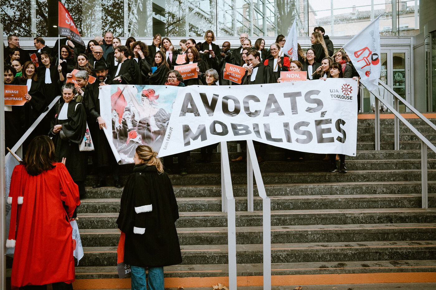 Mobilisation du Barreau des avocats contre le projet de décret "RIVAGE" (Rationalisation des Instances en Voie d’Appel pour en Garantir l’Efficience) initié par le Ministère de la Justice visant selon eux à restreindre fortement le droit de faire appel dans les procédures civiles à Toulouse, sud-ouest de la France, le 4 décembre 2025.