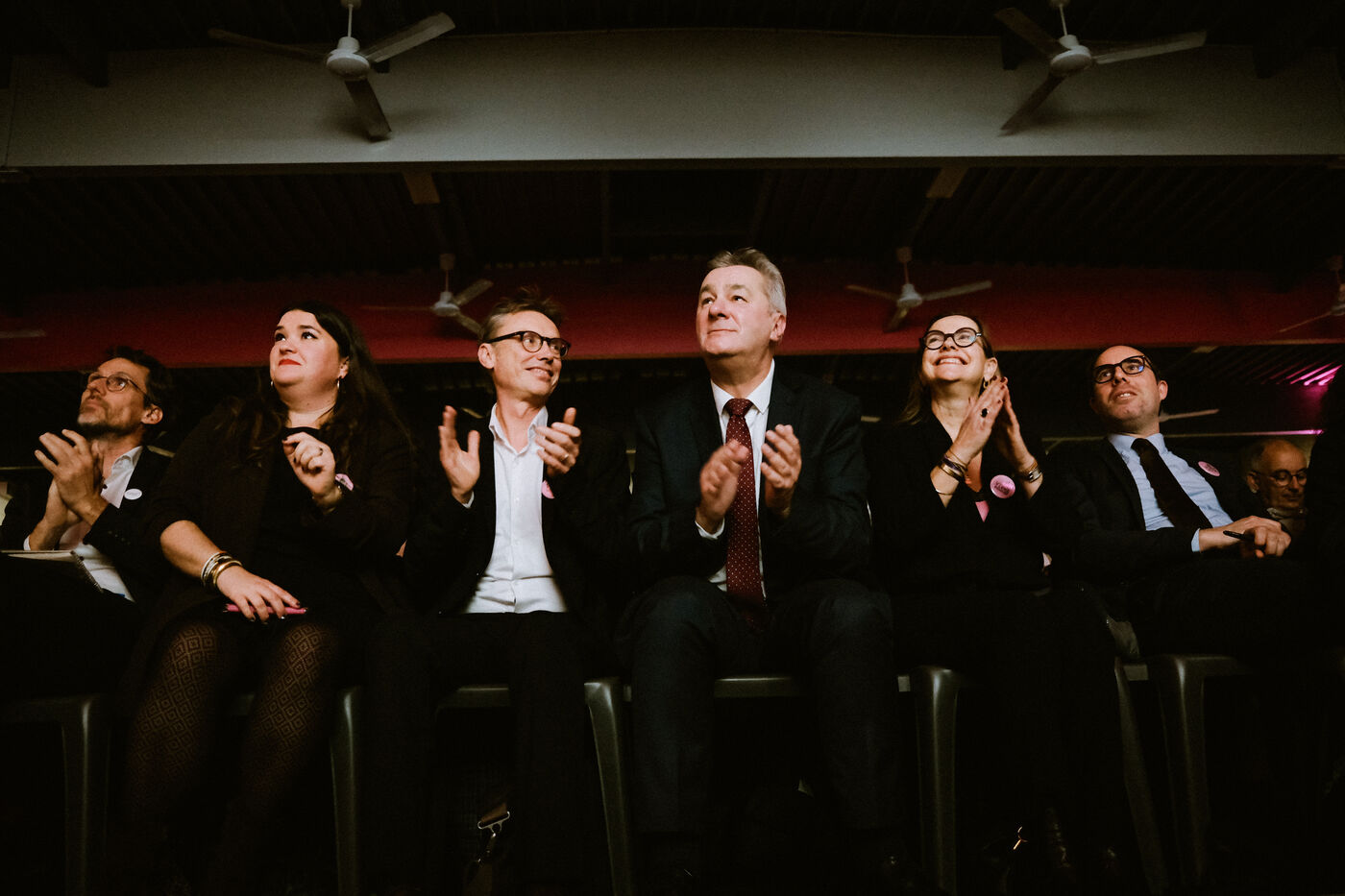 Meeting de lancement de campagne avec l'alliance des partis de gauche (Parti Socialiste PS, Ecologistes, Archipel Citoyen, Génération.s, Place Publique, Parti Communiste...) pour les prochaines élections municipales autour de la liste Vivre Mieux et les têtes de liste François Briançon (Mairie - PS) et Régis Godec (Métropole - Ecologiste) à Toulouse, sud-ouest de la France, le 15 décembre 2025.