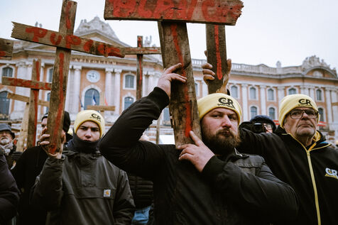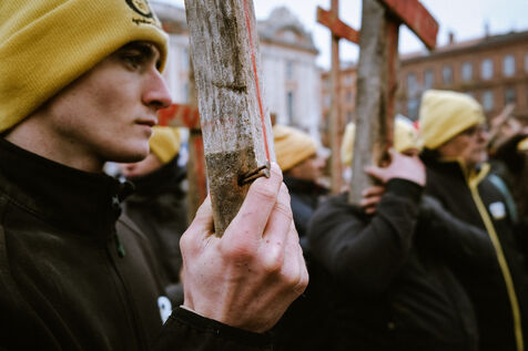 Manifestation d'agriculteurs à l'appel des principaux syndicats (Coordination Rurale, FNSEA, Jeunes Agriculteurs, Confédération Paysanne) en procession avec des croix chrétiennes symbolisant les 106 vaches abattues dans le département suite à la découverte de cas de DNC (Dermatose Nodulaire Contagieuse) à Toulouse, sud-ouest de la France, le 3 janvierr 2026.