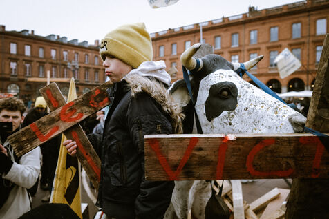 Farmers' protest organized by the main agricultural unions (Coordination Rurale, FNSEA, Jeunes Agriculteurs, Confédération Paysanne) in procession with Christian crosses symbolizing the 106 cows slaughtered in the department following the discovery of cases of CND (Contagious Nodular Dermatosis) in Toulouse, southwestern France, on January 3, 2026.