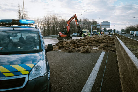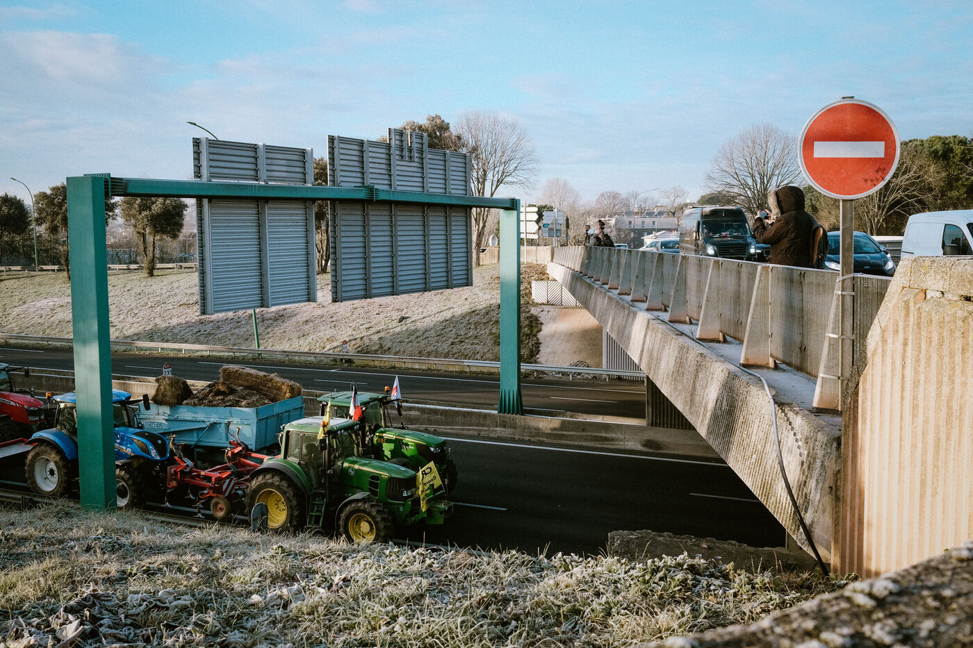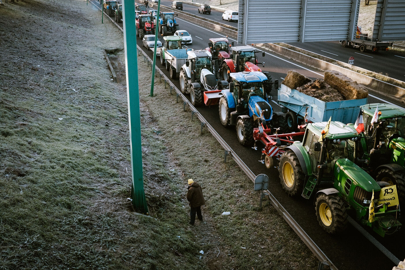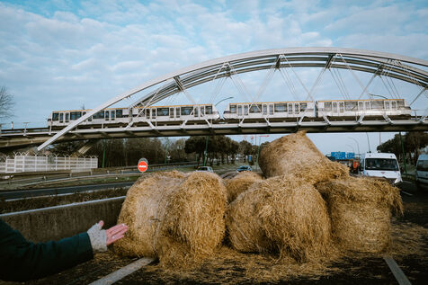 Tentative de blocage du périphérique de la ville, malgré l'arrêté préfectoral d'interdiction de circulation des tracteurs et de manifestation en ville, au niveau de Balma par des agriculteurs en colère contre la gestion de la DNC (Dermatose Nodulaire Contagieuse) par le gouvernement et de la signature des accords européens du Mercosur à Toulouse, sud-ouest de la France, le 7 janvier 2026.
