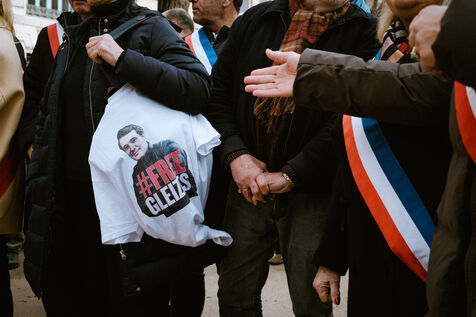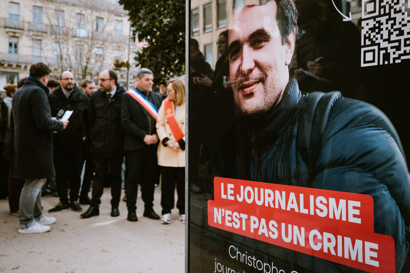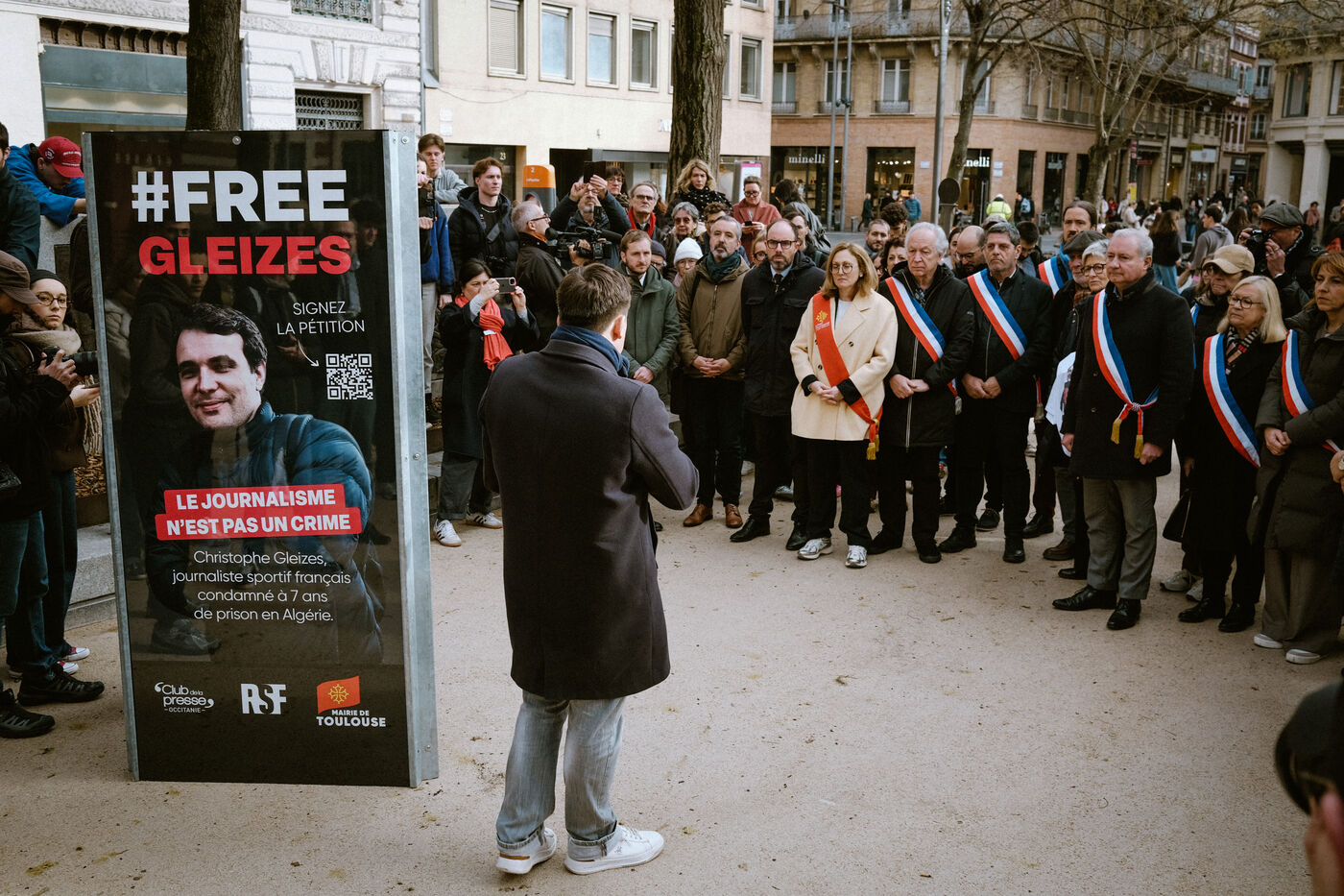 Rassemblement organisé par le Club de la presse Occitanie et Reporters sans frontières (RSF) en soutien au journaliste Christophe Gleizes emprisonné depuis juin 2024 en Algérie et condamné à sept ans de prison (pour Apologie du terrorisme et Possession de publications dans un but de propagande nuisant à l'intérêt national) à Toulouse, sud-ouest de la France, le 29 janvier 2026.