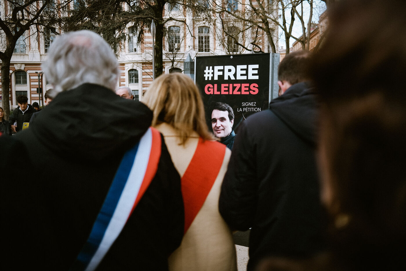 Rally organized by the Occitanie Press Club and Reporters Without Borders (RSF) in support of journalist Christophe Gleizes imprisoned since June 2024 in Algeria and sentenced to seven years in prison (for condoning terrorism and possessing publications for propaganda purposes harmful to the national interest) in Toulouse, southwestern France, on January 29, 2026.