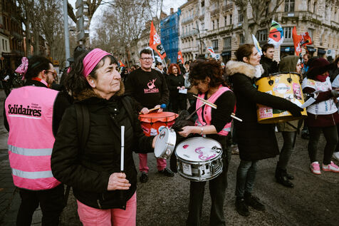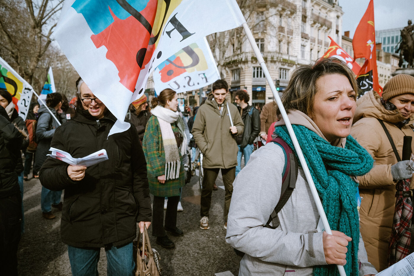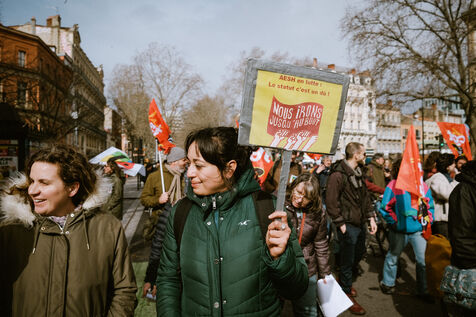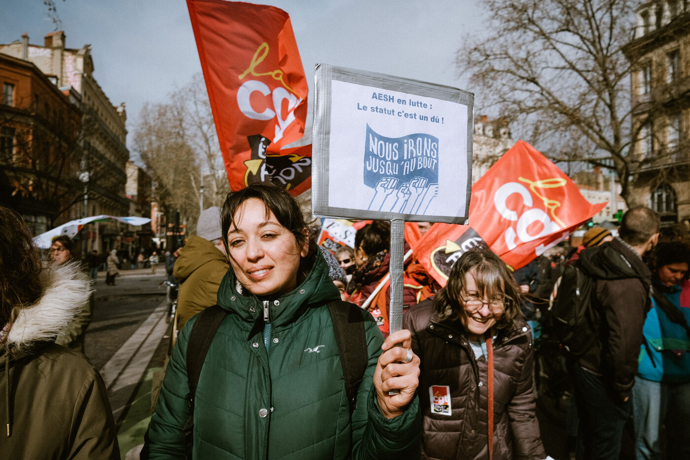 Manifestation et grève des personnels AESH (Accompagnants des Elèves en Situation de Handicap) qui luttent depuis plusieurs mois pour une reconnaissance de statut et des revalorisations salariales à Toulouse, sud-ouest de la France, le 12 février 2026.