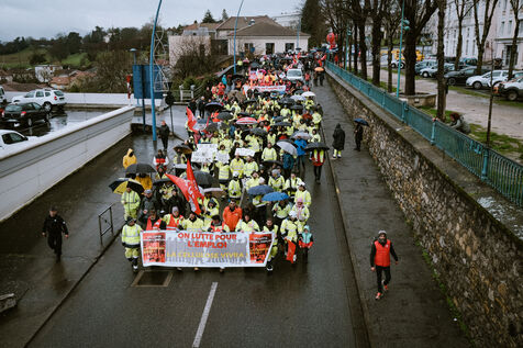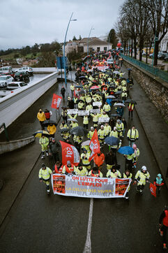 Manifestation des salariés de l'entreprise industrielle de pâte à papier Fibre Excellente, leader dans son secteur mais menacé de fermeture de ses deux usines françaises (Saint-Gaudens 31 et Tarascon 13) à cause notamment d'un coût de rachat par EDF trop faible de l'électricité produite grâce à ses centrales bio-masse à Saint-Gaudens, sud-ouest de la France, le 14 février 2026.