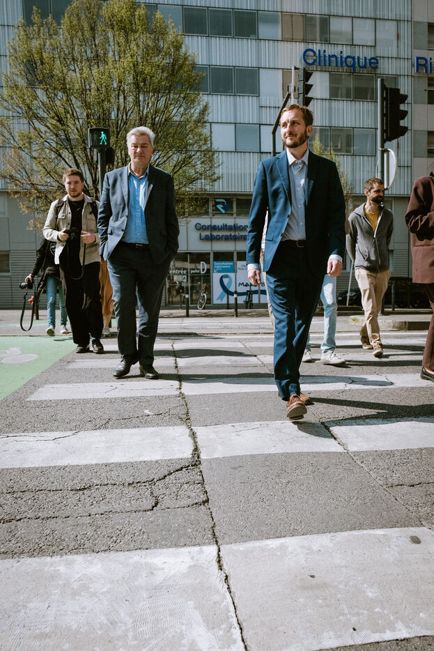 Déambulation dans les rues de la ville et autour d'un café avec les candidats de la liste commune de gauche François Piquemal (L - La France Insoumise LFI) et François Briançon (R - Parti Socialiste PS) le jour de vote du second tour qui les oppose au maire sortant de droite pour les prochaines élections municipales à Toulouse, sud-ouest de la France, le 22 mars 2026.