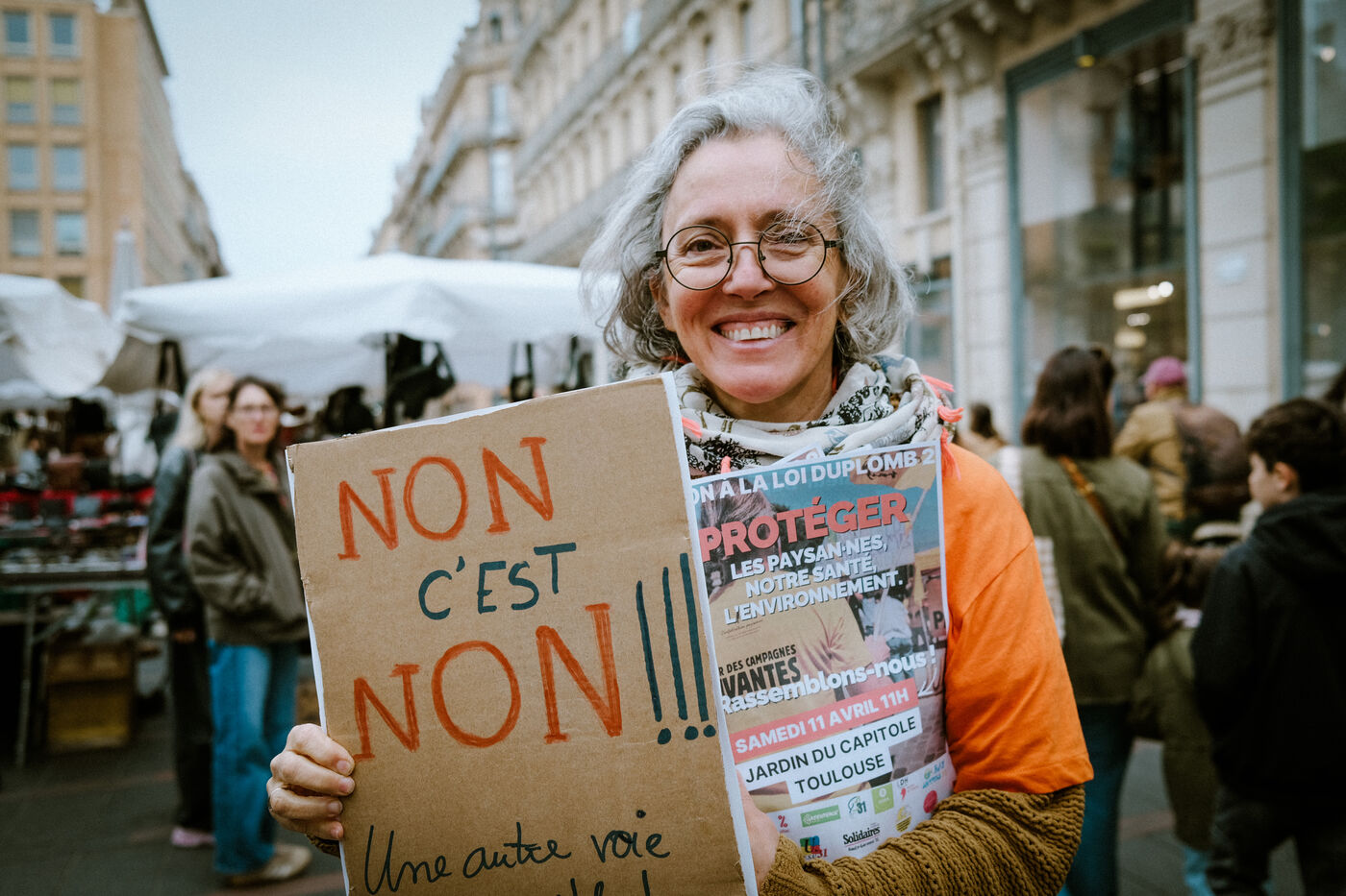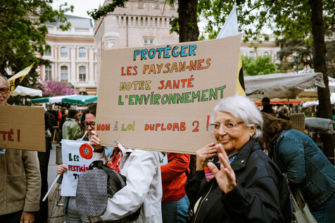 A rally organized by NGOs and labor unions (Friends of the Earth, Attac, Greenpeace, Générations Futures, Oxfam...) against a bill proposed by Senator and farmer Laurent Duplomb seeking to reauthorize two pesticides banned (acetamiprid and flupyradifurone) in Toulouse, southwestern France, on April 11, 2026. When this same bill was proposed a few months earlier, incorporating several demands from the FNSEA (the major agricultural union in favor of intensive farming), a citizens’ petition with over 2 million signatures led to the Constitutional Council striking down the main controversial provision.