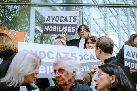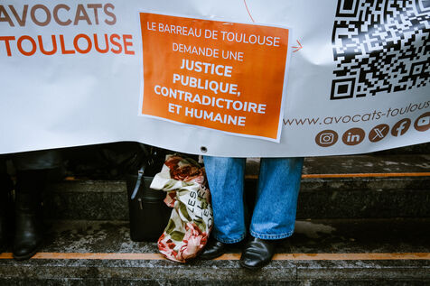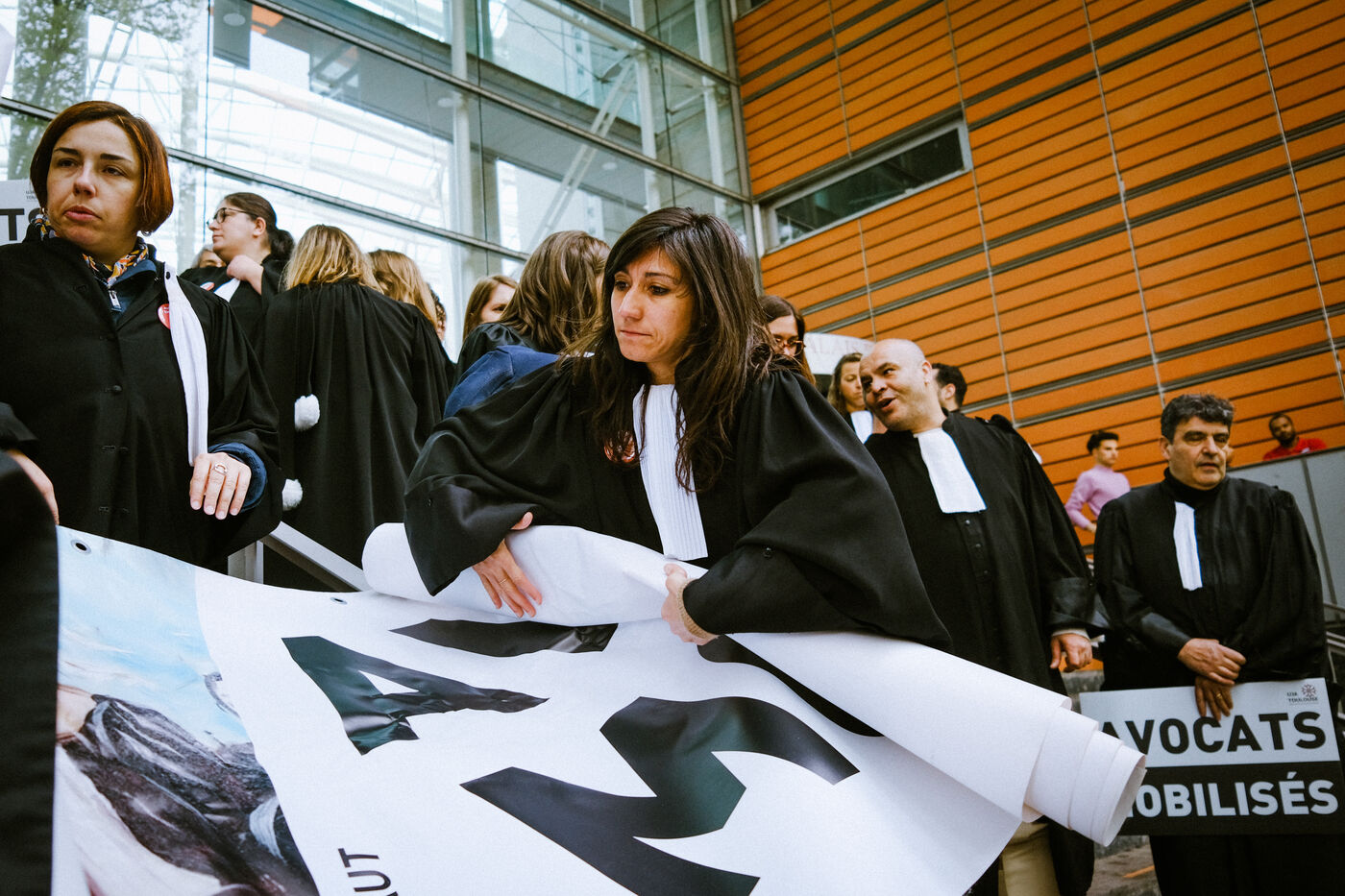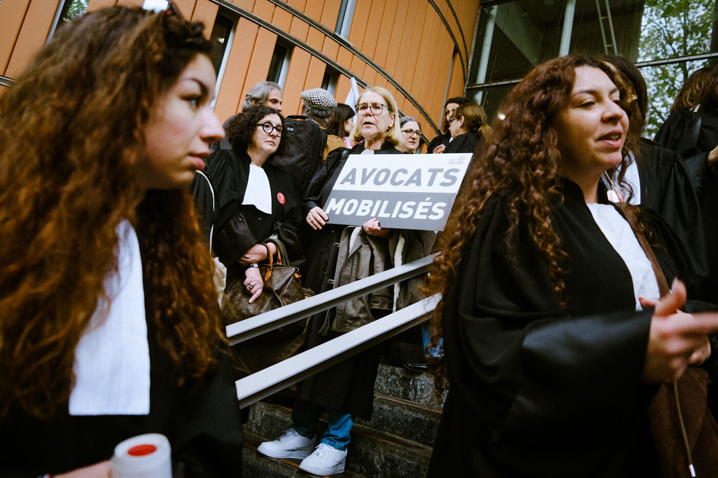 Journée Justice Morte organisée par le barreau des avocats au moment de l'examen du projet de loi SURE (Sanction Utile, Rapide et Effective) porté par le ministre de la Justice Gérald Darmanin au Sénat voulant instaurer le plaider-coupable dans les affaires criminelles à Toulouse, sud-ouest de la France, le 13 avril 2026. Le plaider-coupable, jusqu'alors réservé aux délits, permettrait de se passer de procès quand un accusé reconnaîtrait son crime, avec l'accord de la victime, et réduirait considérablement le rôle des avocats de la défense.