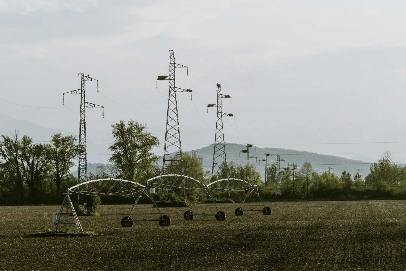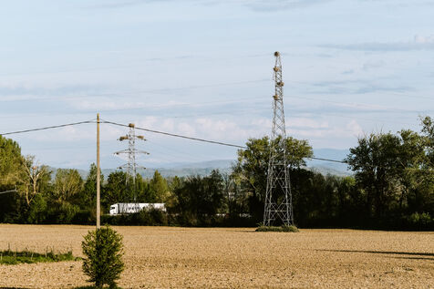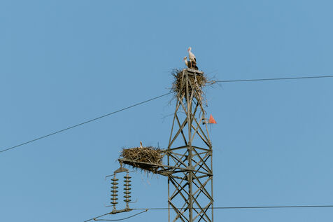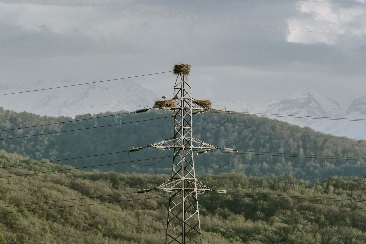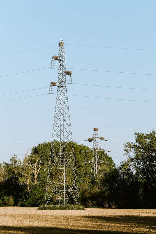 Cigognes dans leur nid installé sur des pilonnes de haute tension électrique au sud de Toulouse à Mondavezan, sud-ouest de la France, le 9 avril 2026. Réchauffement climatique rendant la migration subsaharienne moins nécessaire, alimentation abondante dans les gravières environnantes et les champs : une soixantaine de nids son visibles à trente mètres de haut dans la région.