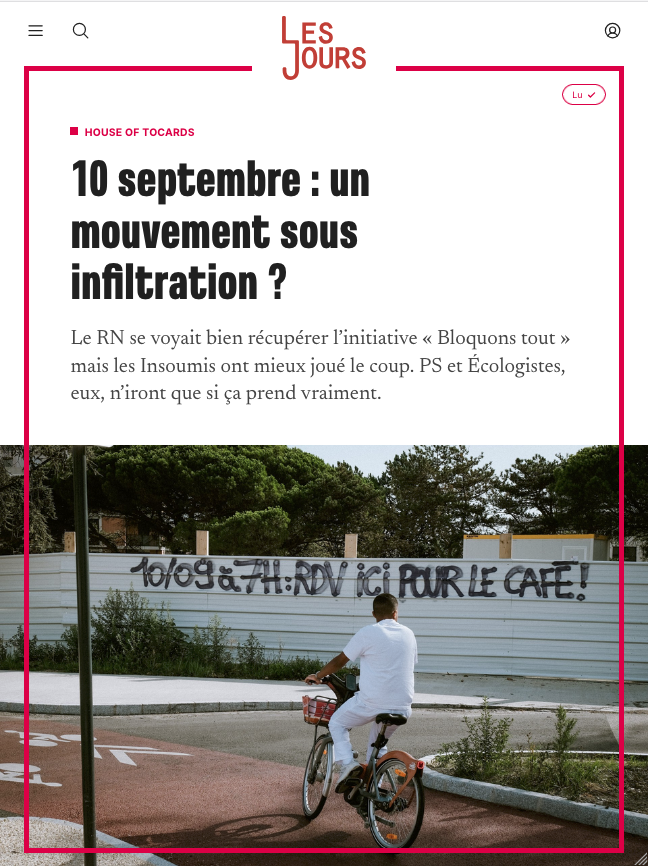 Pat Batard Publications Séries / Archive Creative — Culture — Environnement — Guerre et conflits — Occitanie — Politique — Société — Spiritualité — Sport — Multimedia Sélection de séries Libération - 19/11/2025 Médiapart - 7/11/2025 Nouvel Obs - 6/11/2025 Humanité - 20/10/2025 Libération - 17/10/2025 Libération - 14/10/2025 Le Figaro - 1/10/2025 Time.com - 29/09/2025 Le Figaro - 29/09/2025 Médiapart - 27/09/2025 La Tribune Dimanche - 21/09/2025 Libération - Couverture du 20/09/2025 Madame Figaro - 19/09/2025 ELLE - 18/09/2025 Humanité - 18/09/2025 Bloomberg - 17/09/2025 Les Jours - 09/09/2025 L'Humanité magazine - 2025/09/11 La Croix - 12/08/2025 Télérama - 16/07/2025