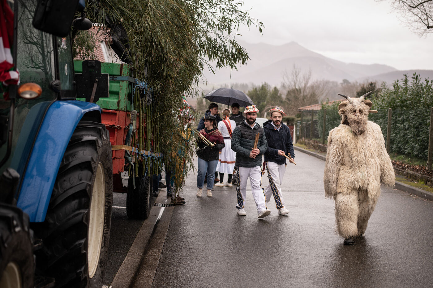 The procession is led by the bear emerging from hibernation, followed by the kaskarots, zirtzils, ponpierra, kotilun gorri, and musicians.
