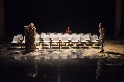 PLACE texte et mise en scene de Tamara Al Saadi avec David Chausse, Yasmine Nadifi, Francoise Thuries, Ismael Tifouche Nieto, Roland Tilsit, Marie Torment, Maya Sanbar et Sophie Schlienger a Avignon au Gymnase du lycée Saint-Joseph le 18 juillet 2019.