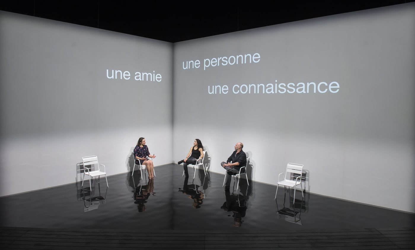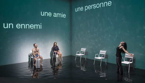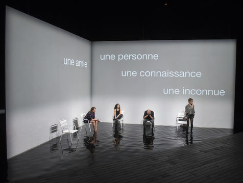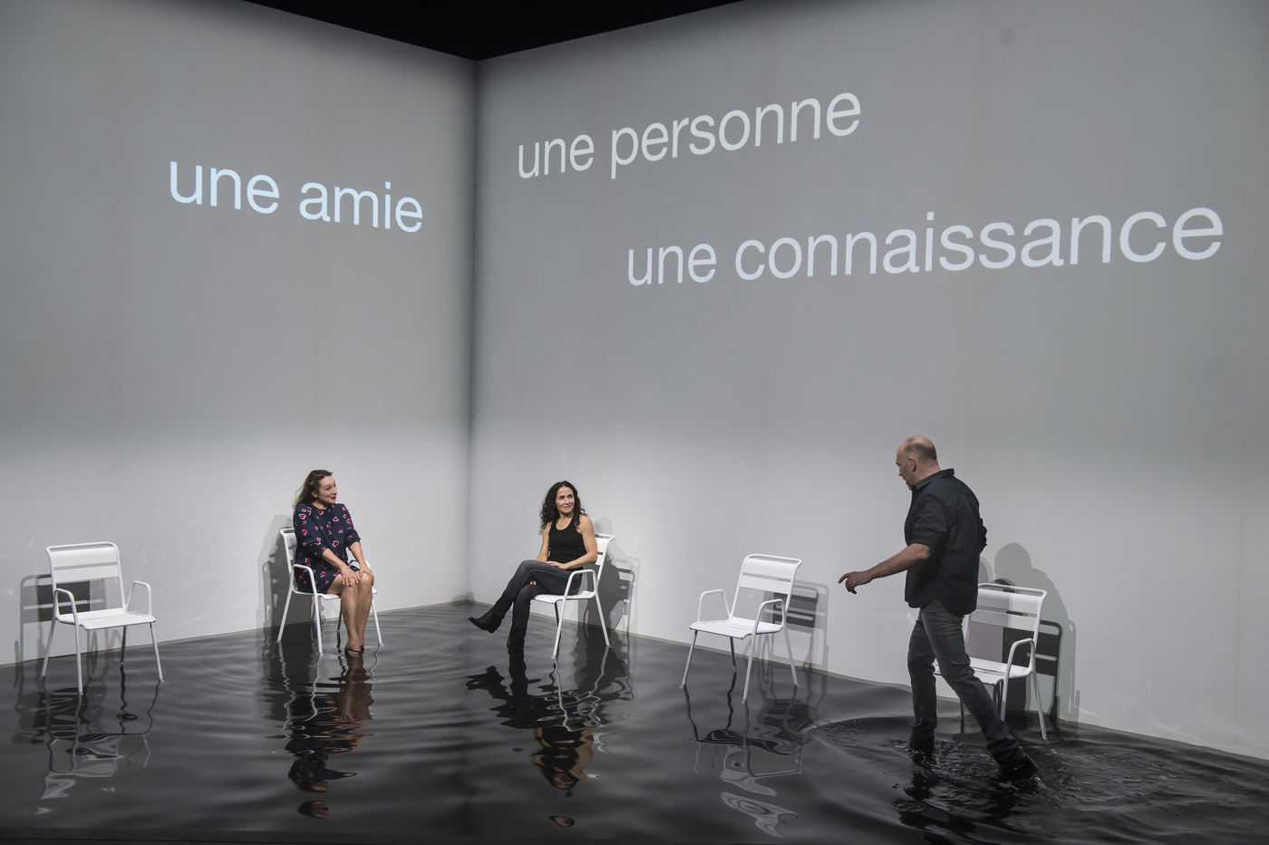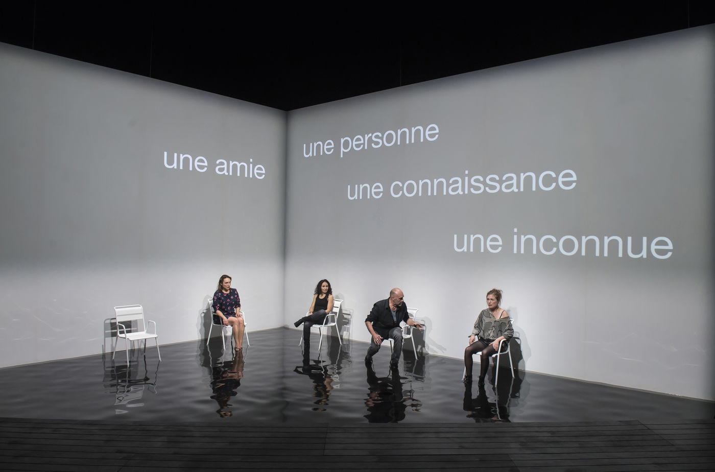 NOUS POUR UN MOMENT written by Arne Lygre, french text by Stephane Braunschweig and Astrid Schenka, directed by Stephane Braunschweig with Anne Cantineau, Virginie Colemyn, Cecile Coustillac, Glenn Marausse, Pierric Plathier, Chloe Rejon and Jean-Philippe Vidal at the Odeon Theatre de l Europe in Paris on November 9, 2019.