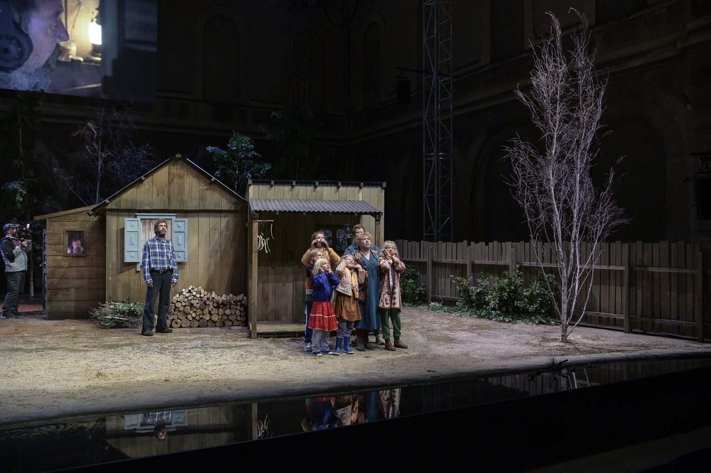 KINGDOM according to Braguino by Clement Cogitore text and directed by Anne-Cecile Vandalem with Arnaud Botman, Laurent Caron, Philippe Grand Henry, Epona Guillaume, Zoe Kovac and Federico D Ambrosio, Leonor Malamatenios (video team) at Cour du Lycee Saint Joseph. Photography by Pascal Gely / Hans Lucas
