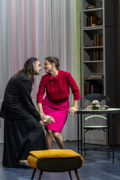 TARTUFFE THEOREME texte de Moliere mise en scene de Macha Makeieff avec Xavier Gallais : Tartuffe, Vincent Winterhalter : Orgon, Jeanne-Marie Levy : madame Pernelle, Helene Bressiant : Elmire, Jin Xuan Mao : Cleante, Loic Mobihan : Damis, Nacima Bekhtaoui : Mariane, Jean-Baptiste Le Vaillant : Valere, Irina Solano : Dorine, Luis Fernando Perez : Laurent et Pascal Ternisien : Flipote au Theatre National de la Criee Marseille. Photographie de Pascal Gely / Hans Lucas