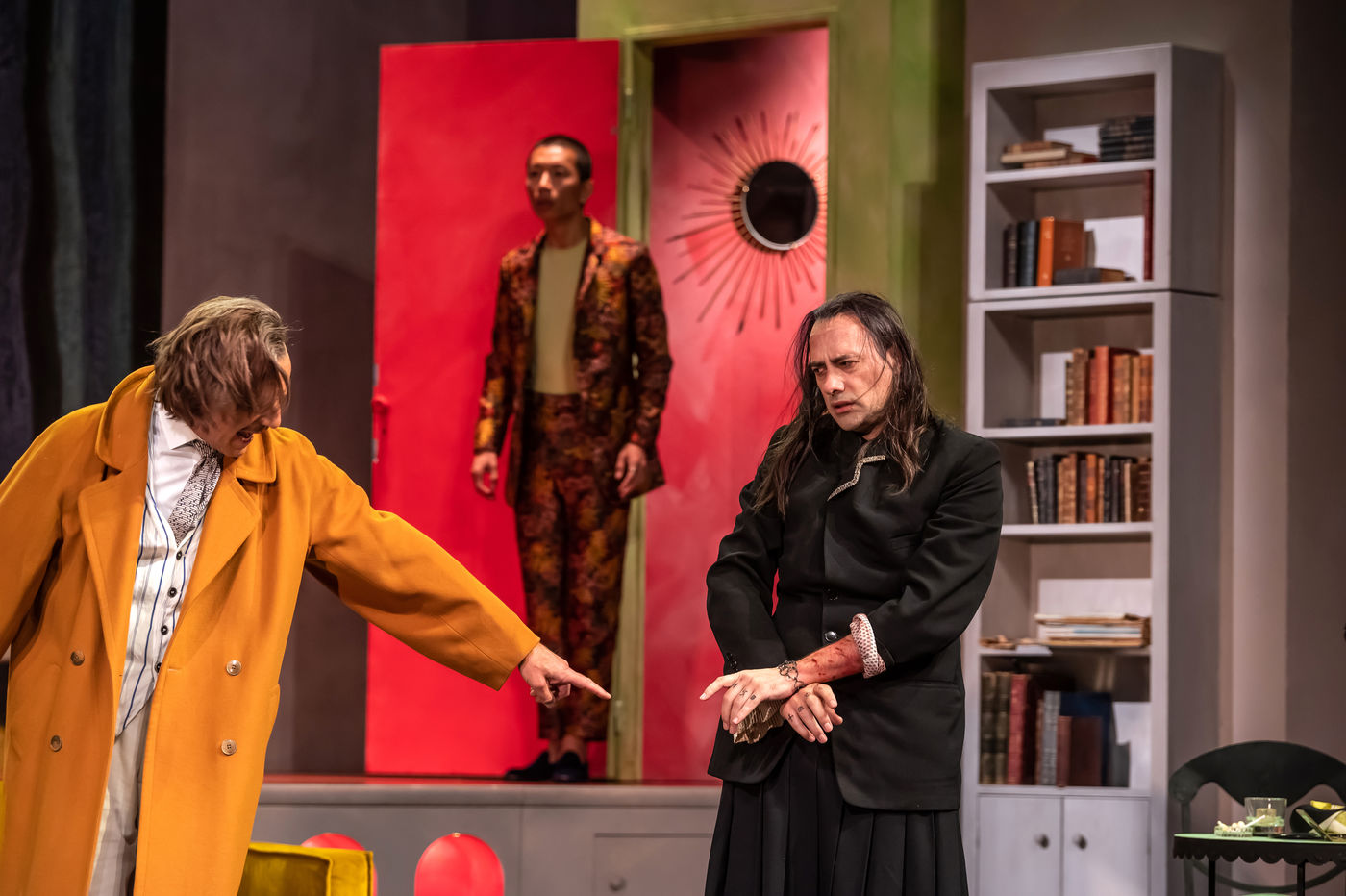 TARTUFFE THEOREME text by Moliere directed by Macha Makeieff with Xavier Gallais : Tartuffe, Vincent Winterhalter : Orgon, Jeanne-Marie Levy : madame Pernelle, Helene Bressiant : Elmire, Jin Xuan Mao : Cleante, Loic Mobihan : Damis, Nacima Bekhtaoui : Mariane, Jean-Baptiste Le Vaillant : Valere, Irina Solano : Dorine, Luis Fernando Perez : Laurent and Pascal Ternisien : Flipote at the Theatre National de la Criee Marseille. Photograph by Pascal Gely / Hans Lucas