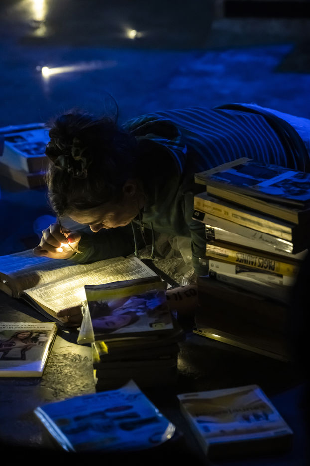 ALLOSAURUS (meme rue meme cabine) text by Jean-Christophe Dolle directed by Clotilde Morgieve and Jean-Christophe Dolle with Jean-Christophe Dolle, Yann de Monterno and Clotilde Mogieve at the salle des fetes de Cours. Photography by Pascal Gely / Hans Lucas