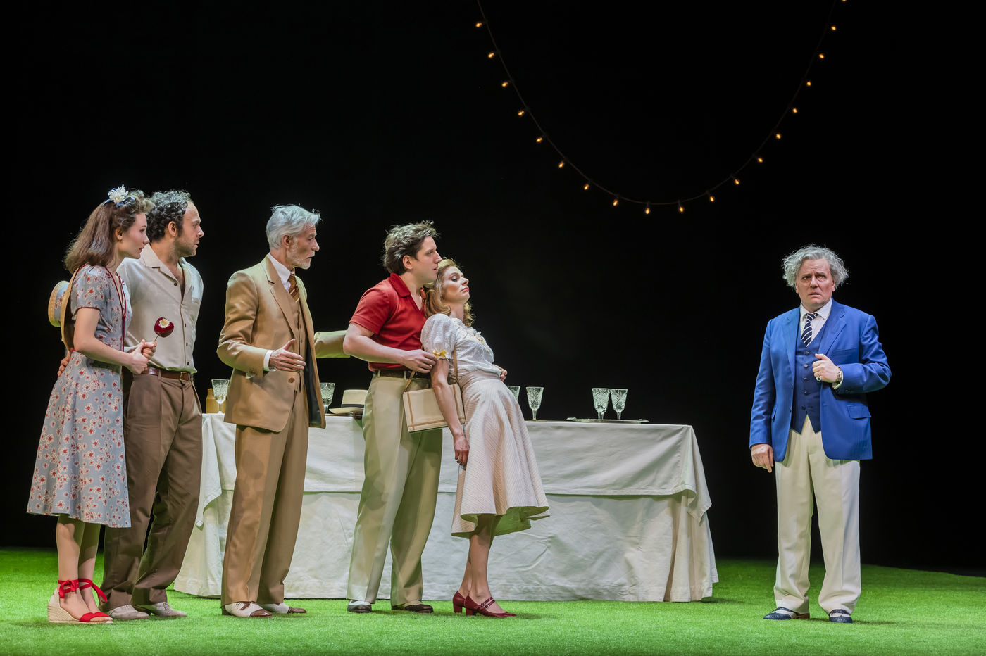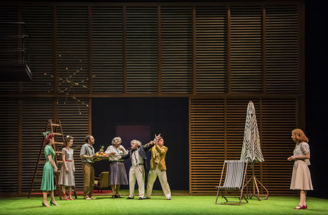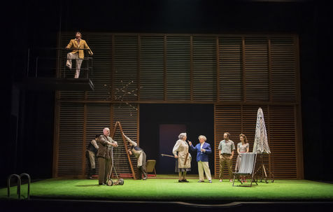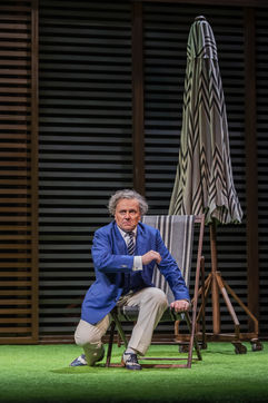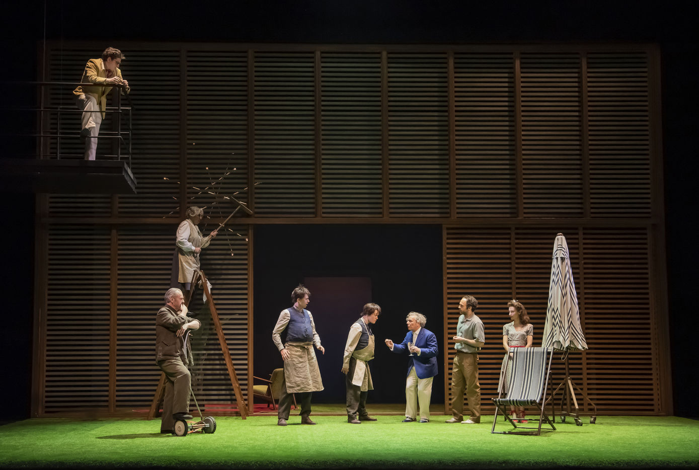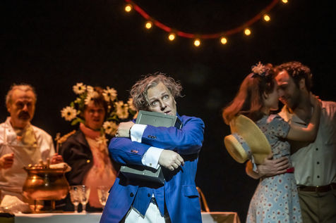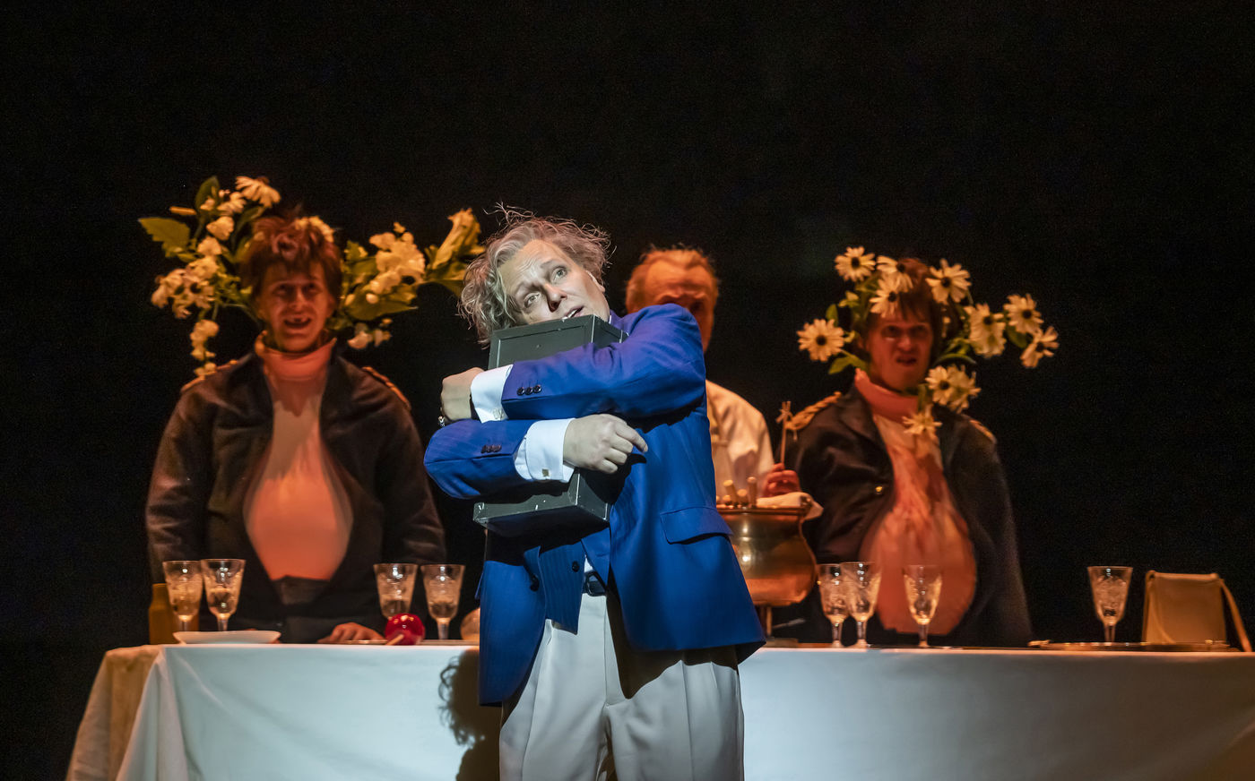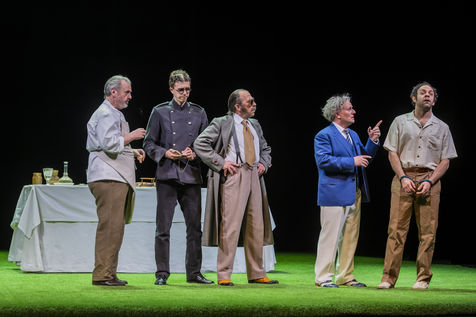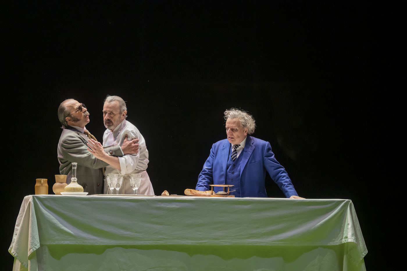 L AVARE text by Moliere directed by Lilo Baur with Alain Lenglet (Anselme), Francoise Gillard (Frosine), Jerome Pouly (La Fleche), Laurent Stocker (Harpagon), Serge Bagdassarian (Maitre Jacques), Nicolas Lormeau (Maitre Simon), Anna Cervinka (Mariane), Jean Chevalier (Cleante), Elise Lhomeau (Elise), Clement Bresson (Valere), Adrien Simion (La Merluche) and Jeremy Berthoud comedien de l academie (Brindavoine) at the Comedie Francaise. Photograph by Pascal Gely / Hans Lucas