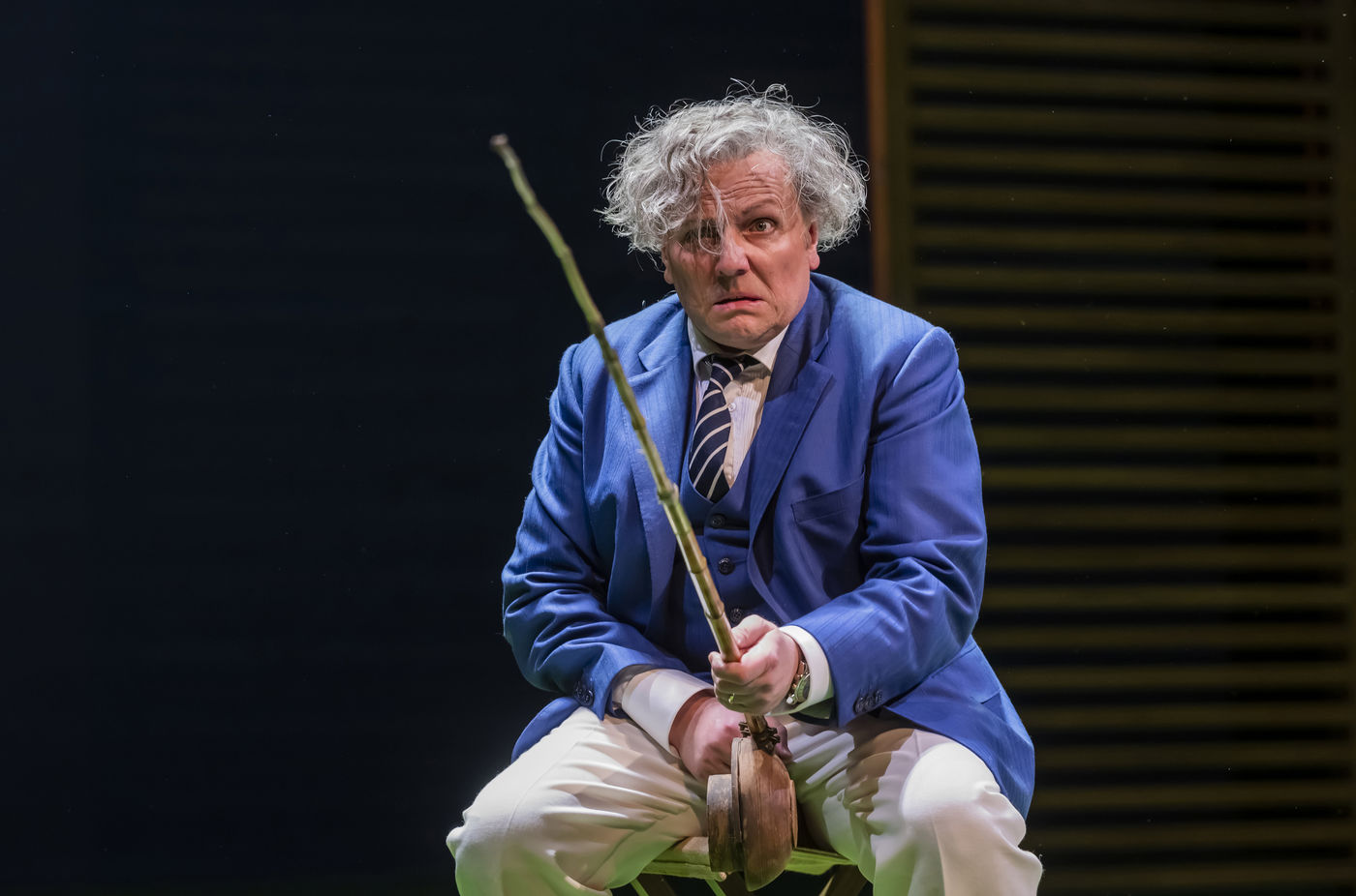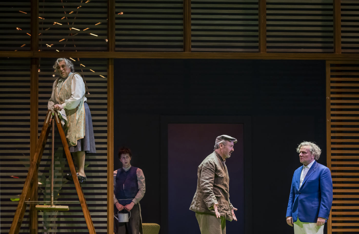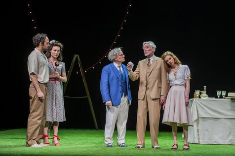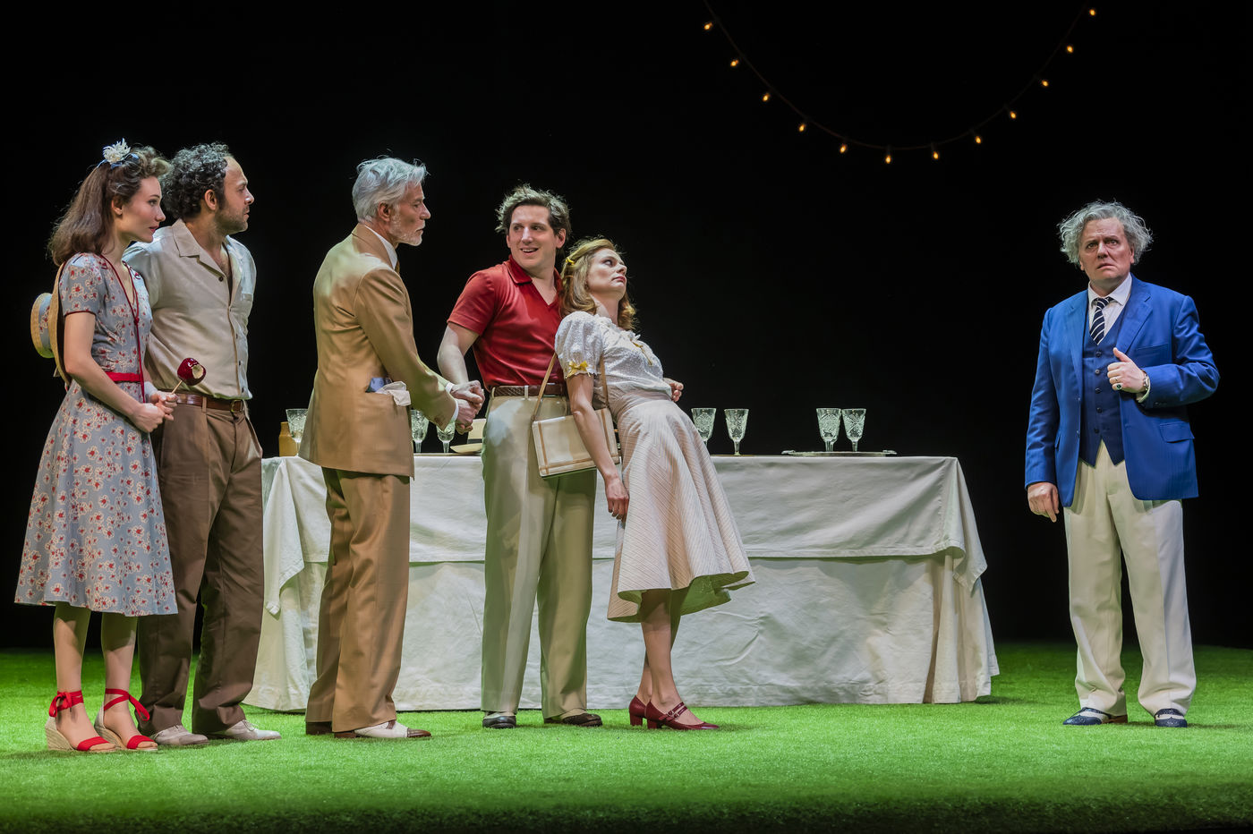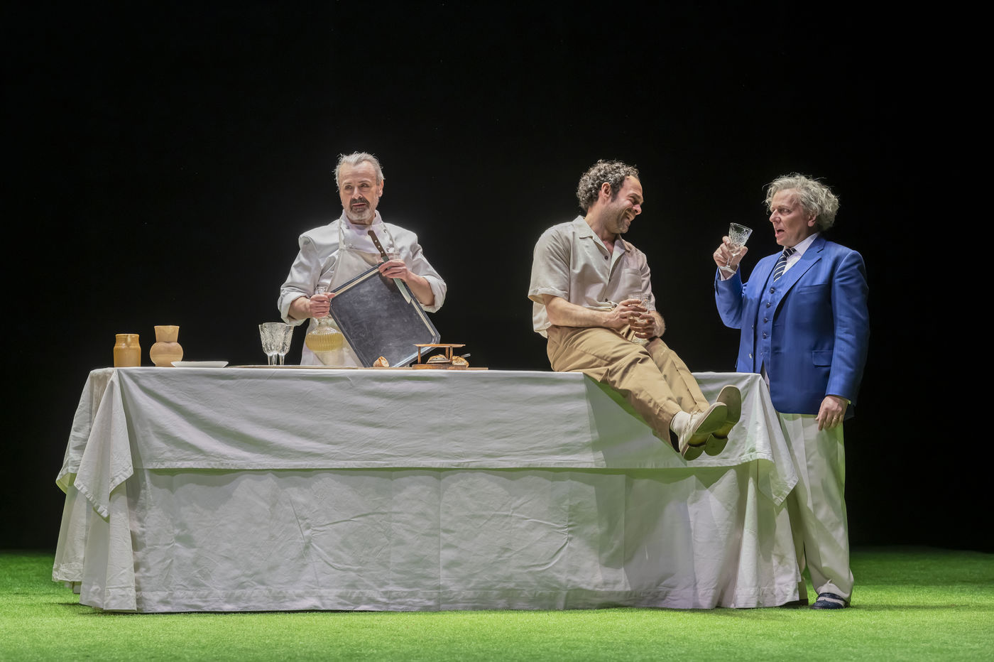 L AVARE text by Moliere directed by Lilo Baur with Alain Lenglet (Anselme), Francoise Gillard (Frosine), Jerome Pouly (La Fleche), Laurent Stocker (Harpagon), Serge Bagdassarian (Maitre Jacques), Nicolas Lormeau (Maitre Simon), Anna Cervinka (Mariane), Jean Chevalier (Cleante), Elise Lhomeau (Elise), Clement Bresson (Valere), Adrien Simion (La Merluche) and Jeremy Berthoud comedien de l academie (Brindavoine) at the Comedie Francaise. Photograph by Pascal Gely / Hans Lucas