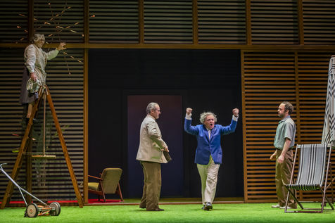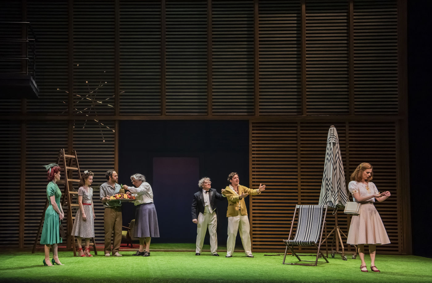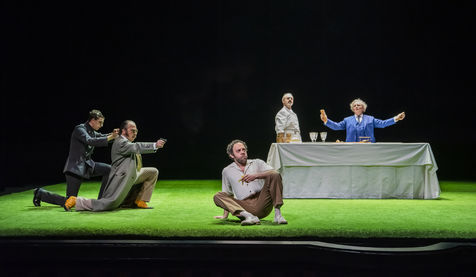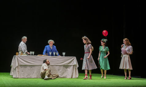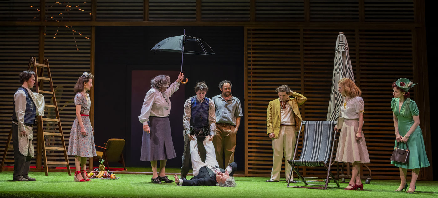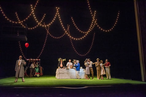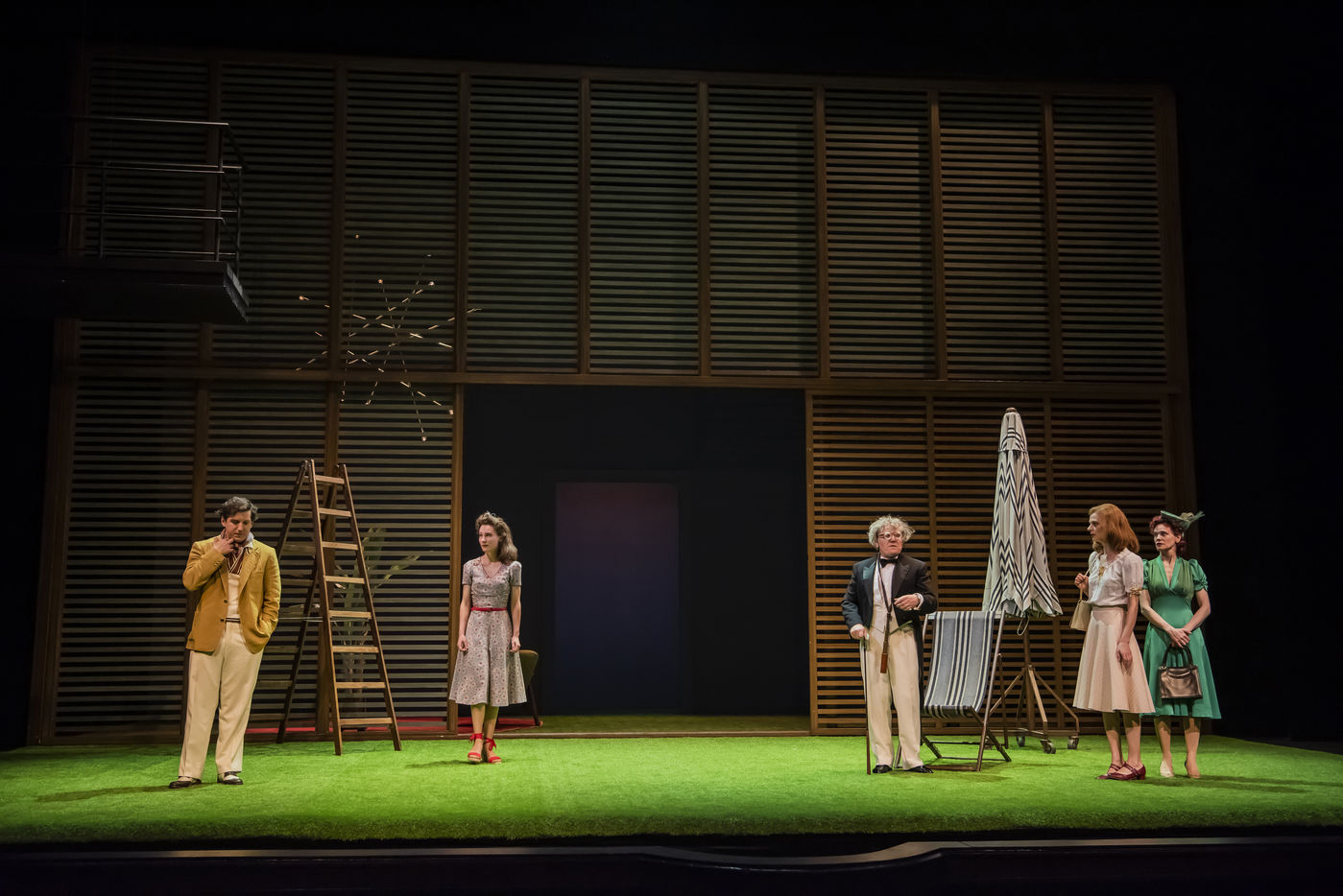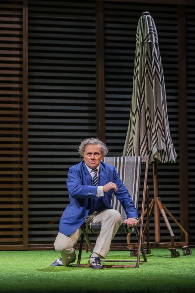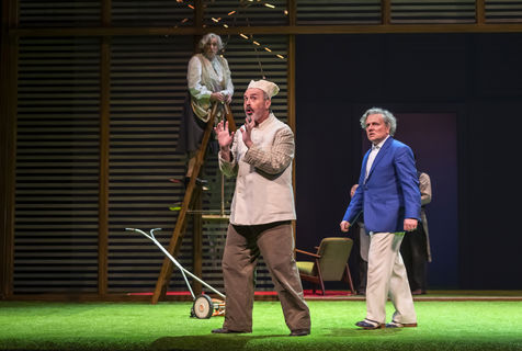 L AVARE text by Moliere directed by Lilo Baur with Alain Lenglet (Anselme), Francoise Gillard (Frosine), Jerome Pouly (La Fleche), Laurent Stocker (Harpagon), Serge Bagdassarian (Maitre Jacques), Nicolas Lormeau (Maitre Simon), Anna Cervinka (Mariane), Jean Chevalier (Cleante), Elise Lhomeau (Elise), Clement Bresson (Valere), Adrien Simion (La Merluche) and Jeremy Berthoud comedien de l academie (Brindavoine) at the Comedie Francaise. Photograph by Pascal Gely / Hans Lucas