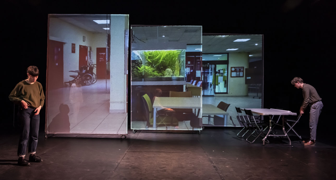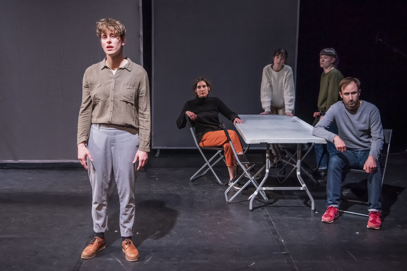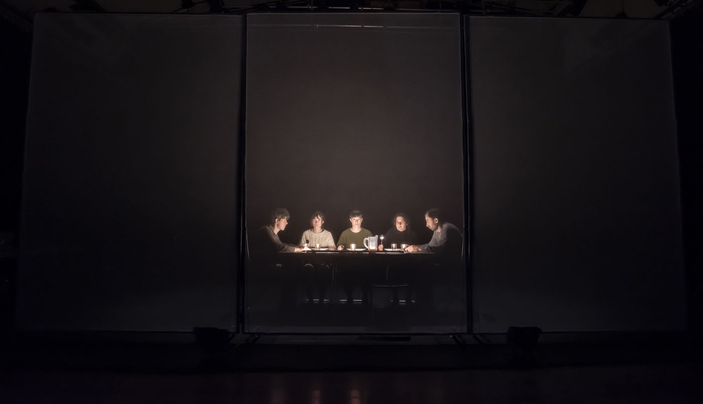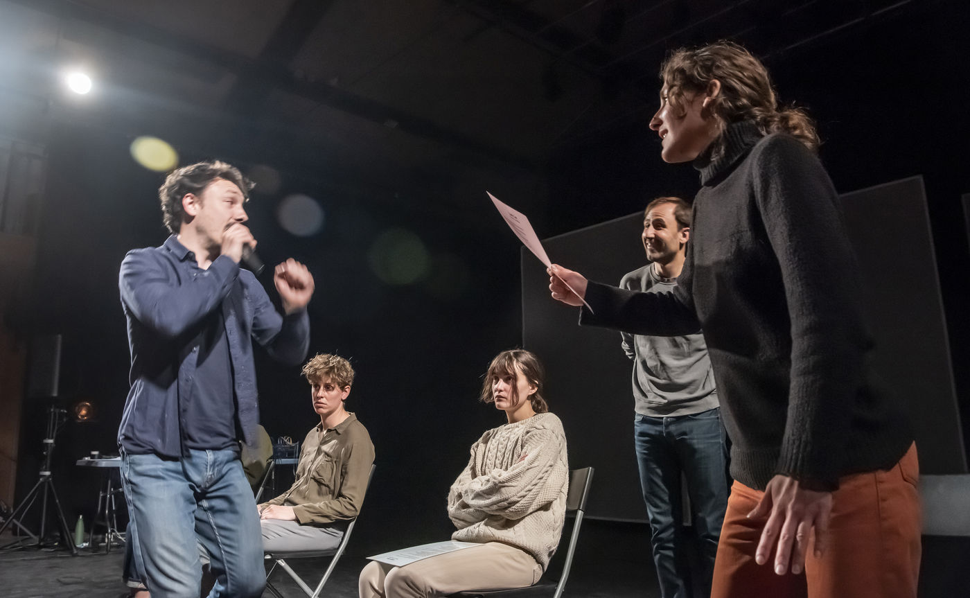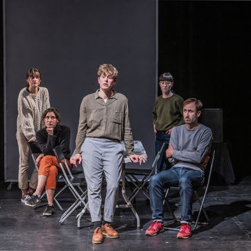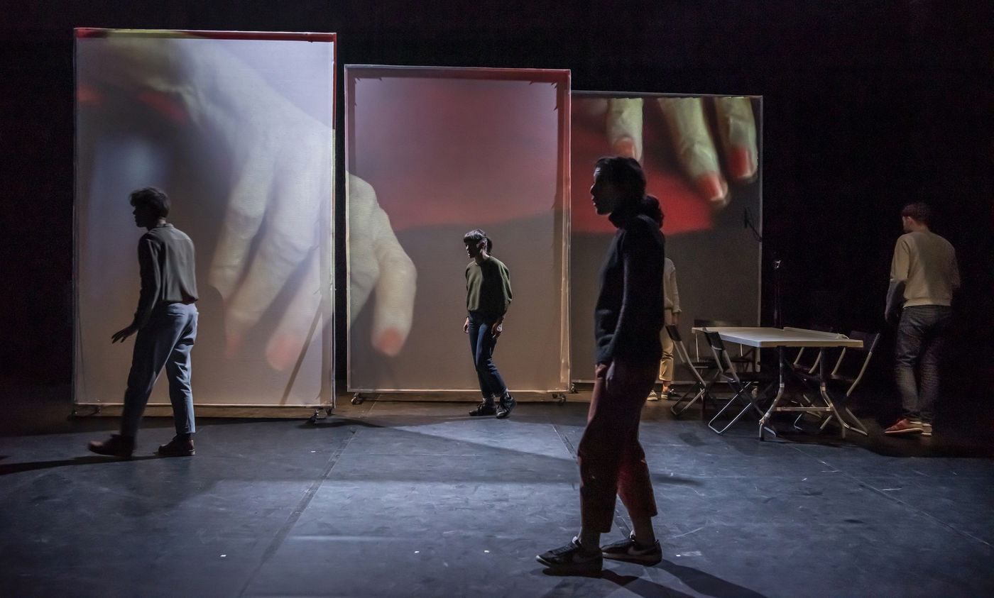 PROJET V A creation by the Diptyque Collectif with Anna Agostini, Tessa Bazin, Caroline Cristofili, Maxime Denis, Ines Fakhet and Louis Vasquez at the Nouveau Gare au Theatre. Photograph by Pascal Gely / Hans Lucas