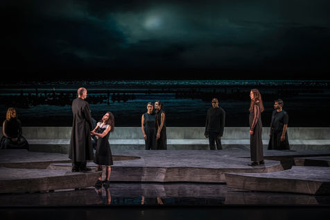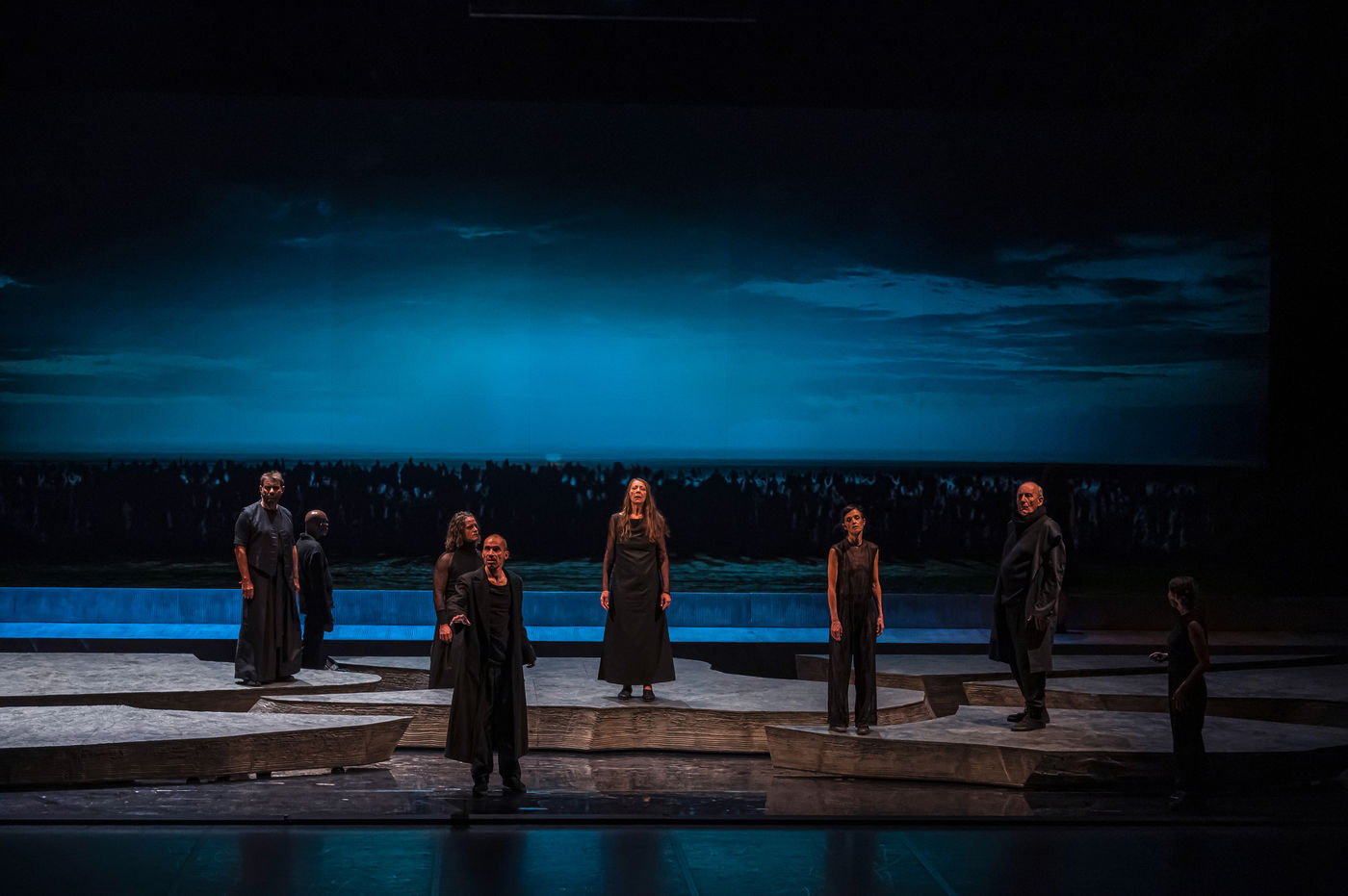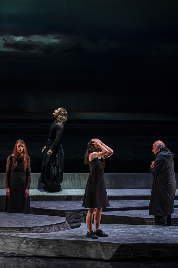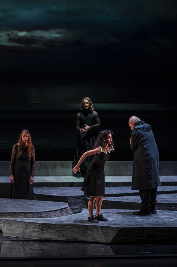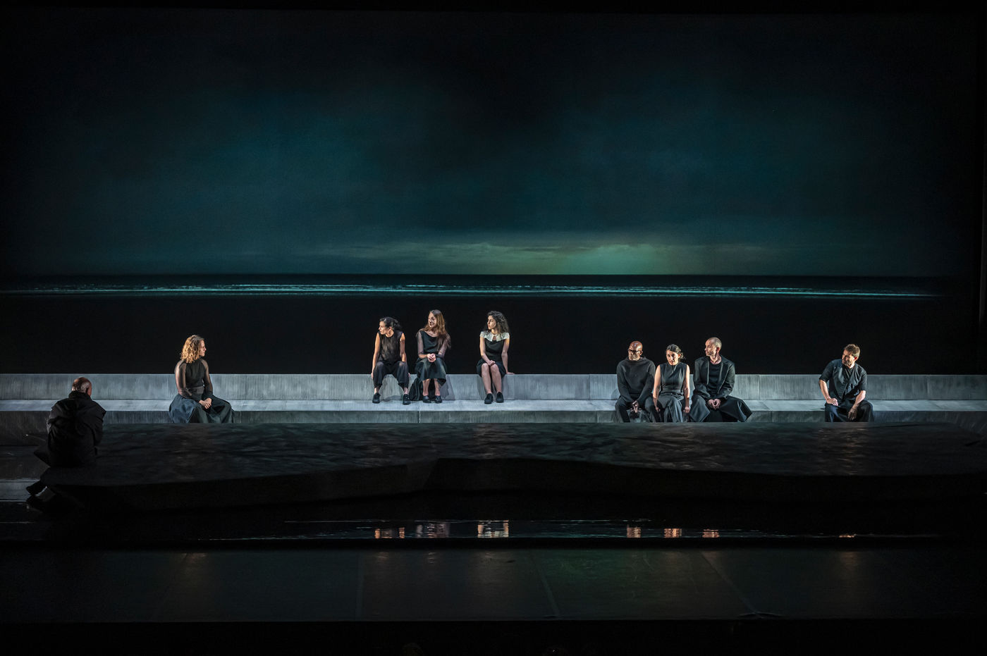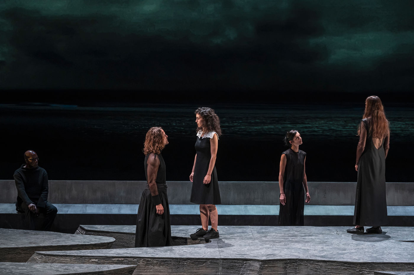 IPHIGENIE text by Tiago Rodrigues directed by Anne Theron with Carolina Amaral (Iphigenie), Fanny Avram (le Choeur), Joao Cravo Cardoso (Achille), Alex Descas (Menelas), Vincent Dissez (Agamemnon), Mireille Herbstmeyer (Clytemnestre), Julie Moreau (le Choeur), Philippe Morier-Genoud (le Messager le Vieillard le Choeur) and Richard Sammut (Ulysse) at the Opera du Grand Avignon Festival d Avignon 2022. Photograph by Pascal Gely / Hans Lucas