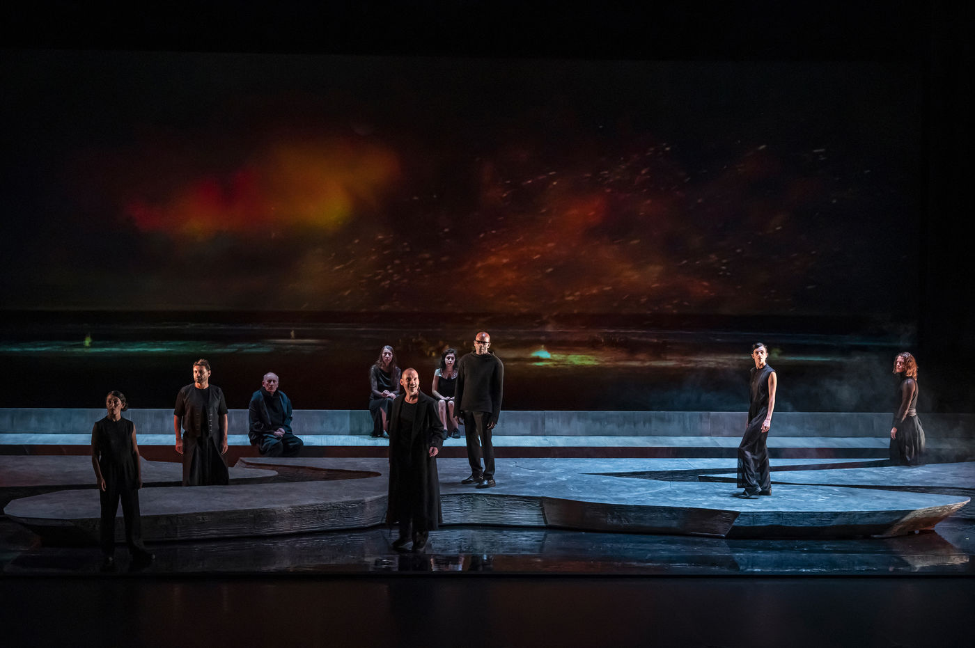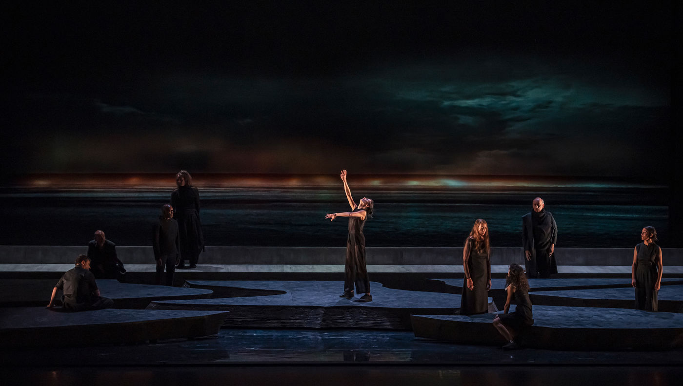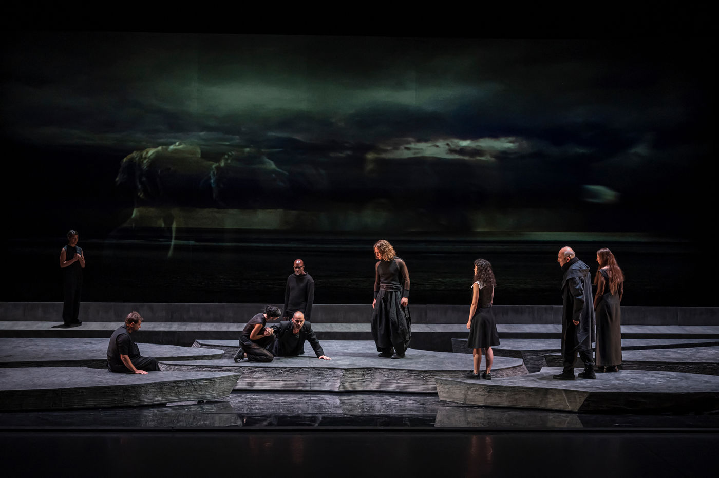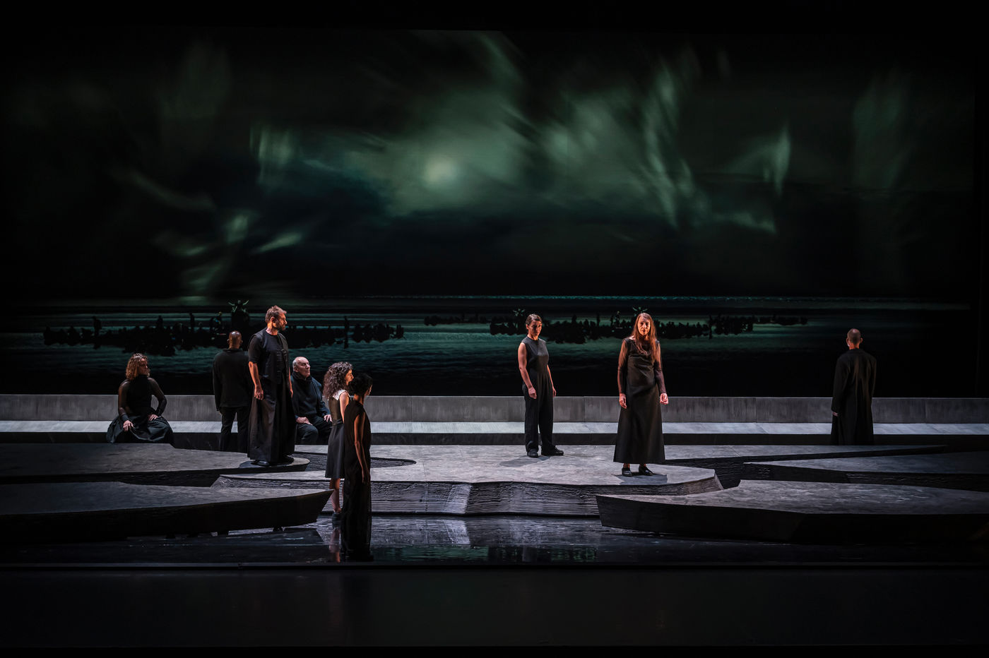 IPHIGENIE text by Tiago Rodrigues directed by Anne Theron with Carolina Amaral (Iphigenie), Fanny Avram (le Choeur), Joao Cravo Cardoso (Achille), Alex Descas (Menelas), Vincent Dissez (Agamemnon), Mireille Herbstmeyer (Clytemnestre), Julie Moreau (le Choeur), Philippe Morier-Genoud (le Messager le Vieillard le Choeur) and Richard Sammut (Ulysse) at the Opera du Grand Avignon Festival d Avignon 2022. Photograph by Pascal Gely / Hans Lucas