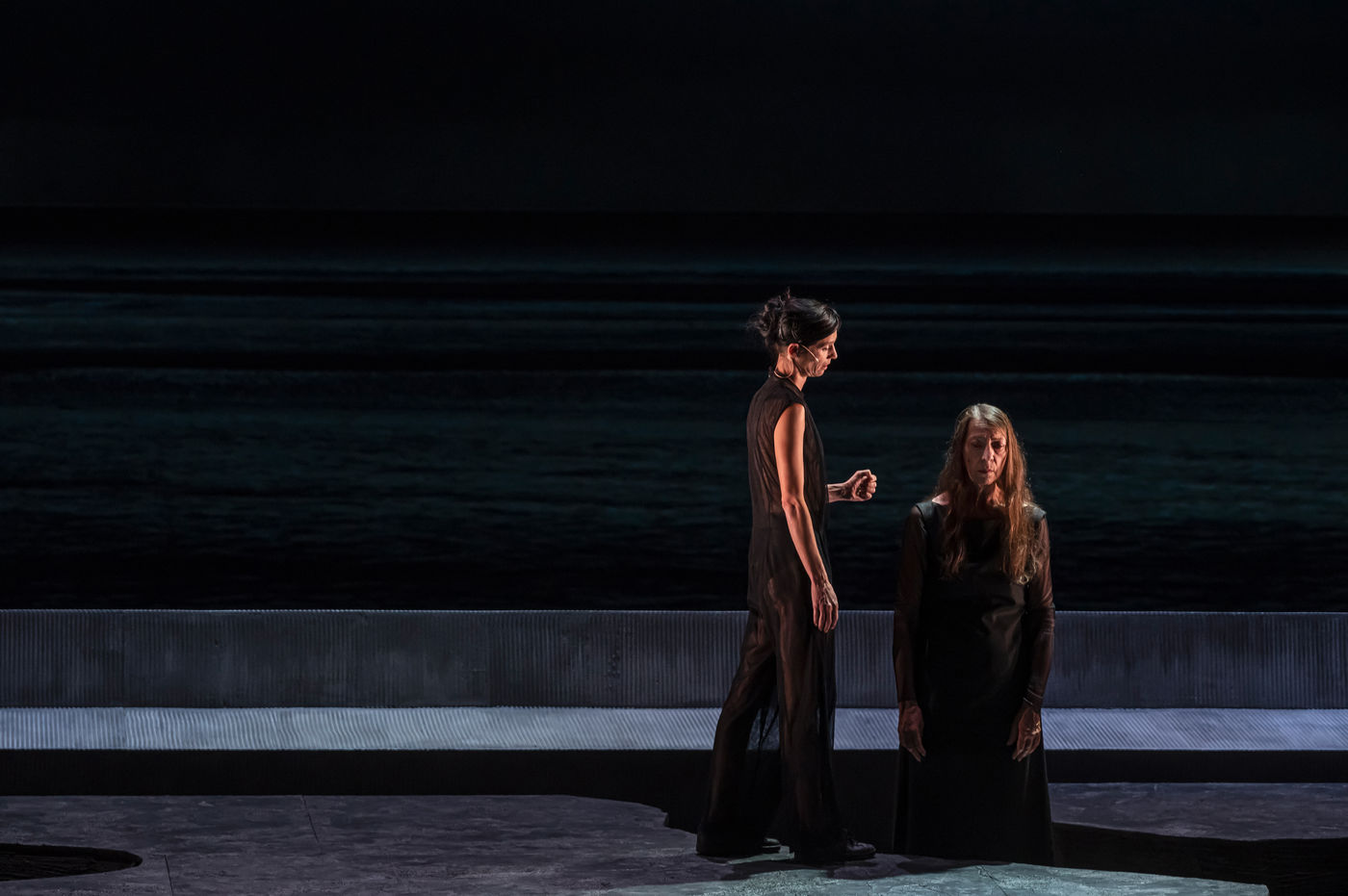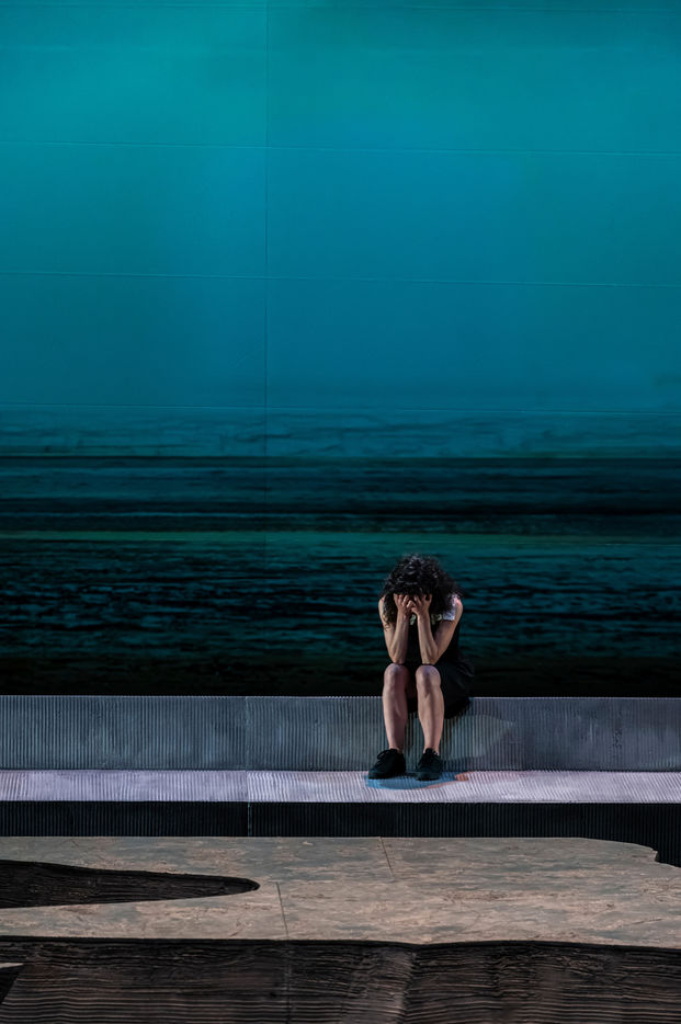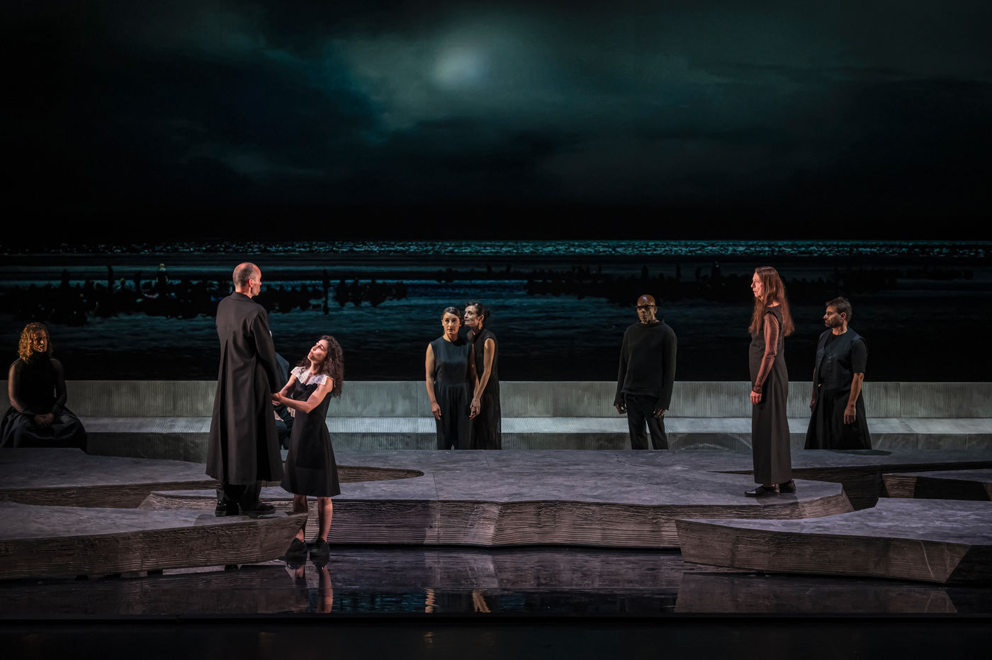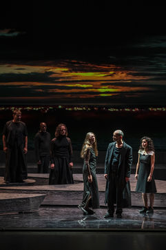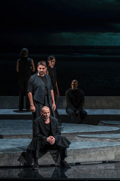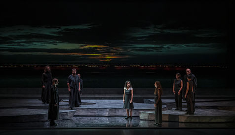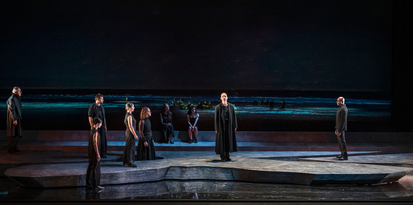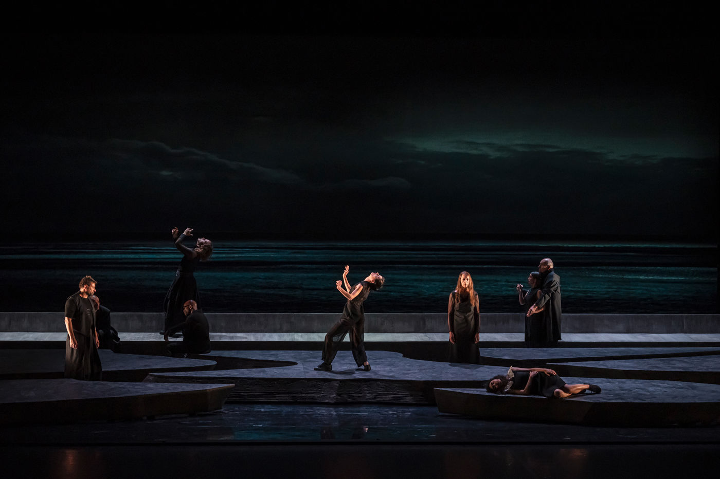 IPHIGENIE text by Tiago Rodrigues directed by Anne Theron with Carolina Amaral (Iphigenie), Fanny Avram (le Choeur), Joao Cravo Cardoso (Achille), Alex Descas (Menelas), Vincent Dissez (Agamemnon), Mireille Herbstmeyer (Clytemnestre), Julie Moreau (le Choeur), Philippe Morier-Genoud (le Messager le Vieillard le Choeur) and Richard Sammut (Ulysse) at the Opera du Grand Avignon Festival d Avignon 2022. Photograph by Pascal Gely / Hans Lucas