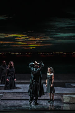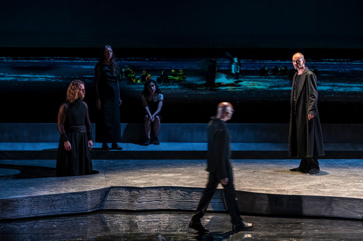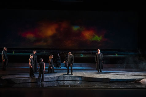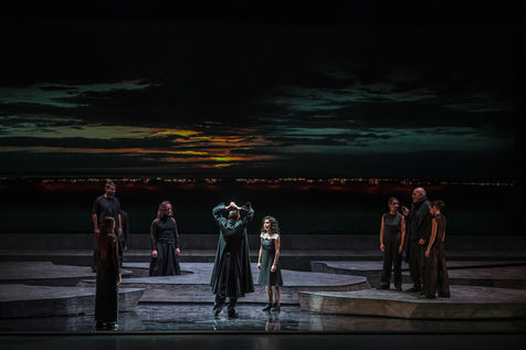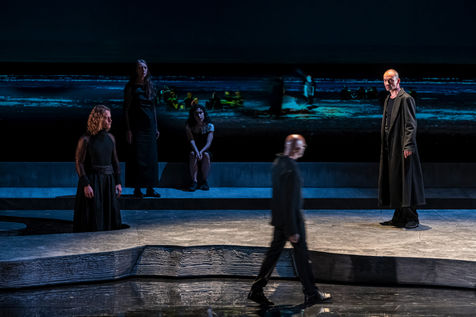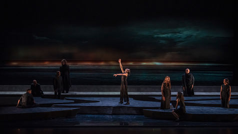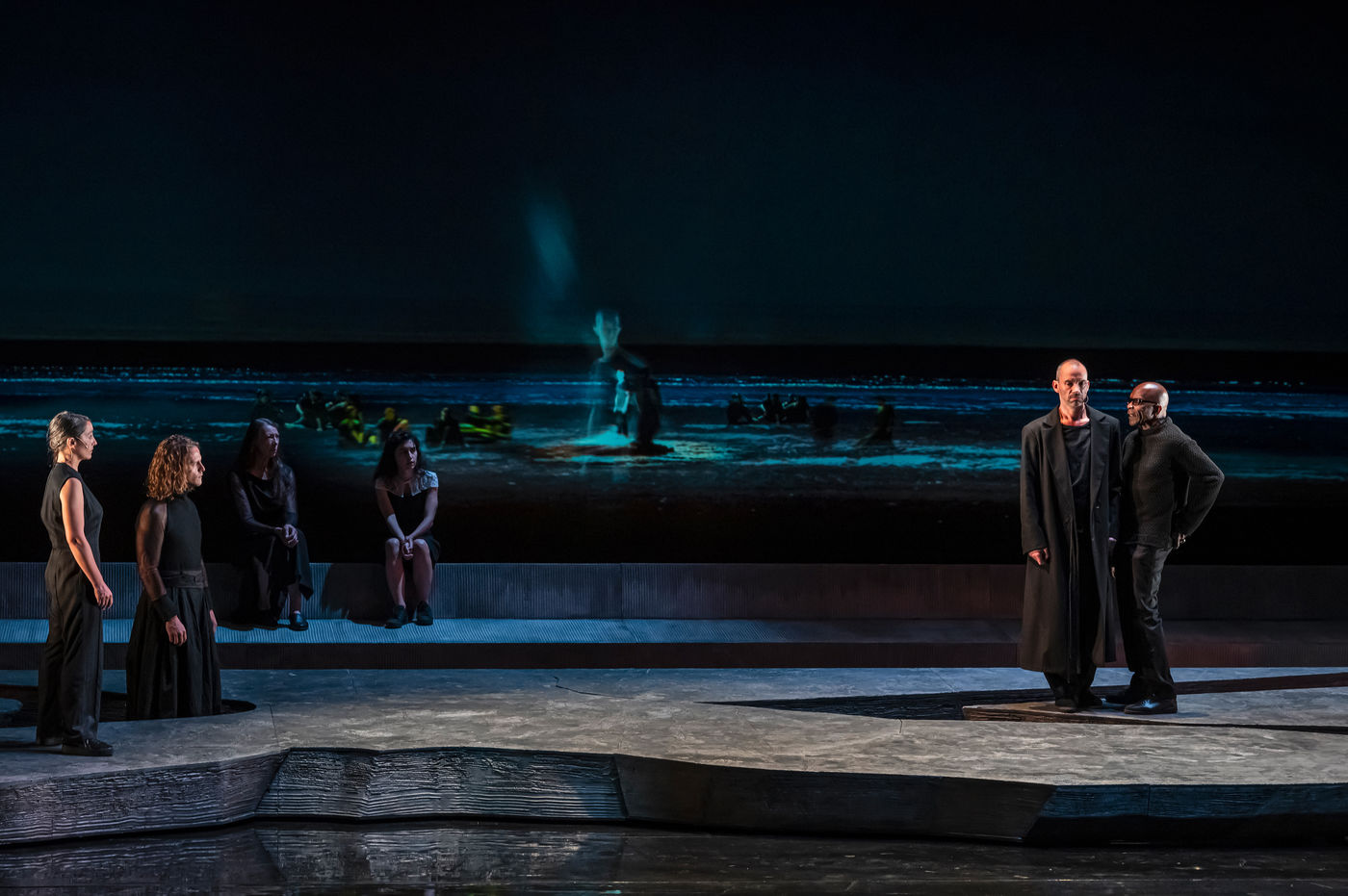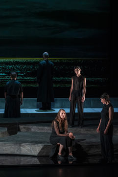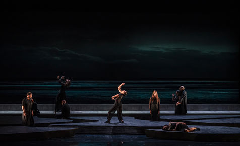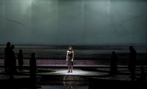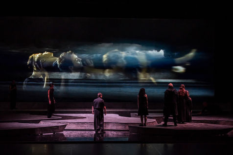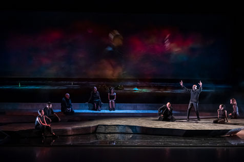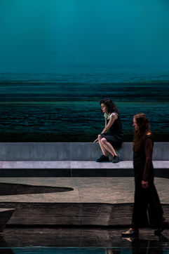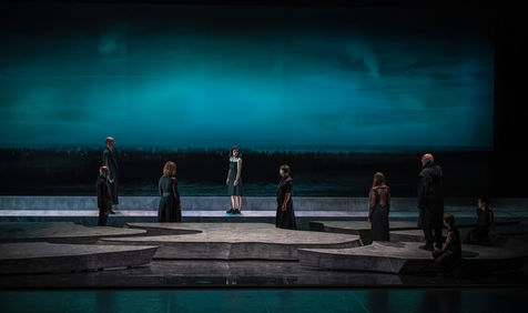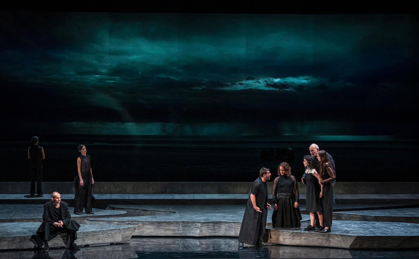 IPHIGENIE text by Tiago Rodrigues directed by Anne Theron with Carolina Amaral (Iphigenie), Fanny Avram (le Choeur), Joao Cravo Cardoso (Achille), Alex Descas (Menelas), Vincent Dissez (Agamemnon), Mireille Herbstmeyer (Clytemnestre), Julie Moreau (le Choeur), Philippe Morier-Genoud (le Messager le Vieillard le Choeur) and Richard Sammut (Ulysse) at the Opera du Grand Avignon Festival d Avignon 2022. Photograph by Pascal Gely / Hans Lucas