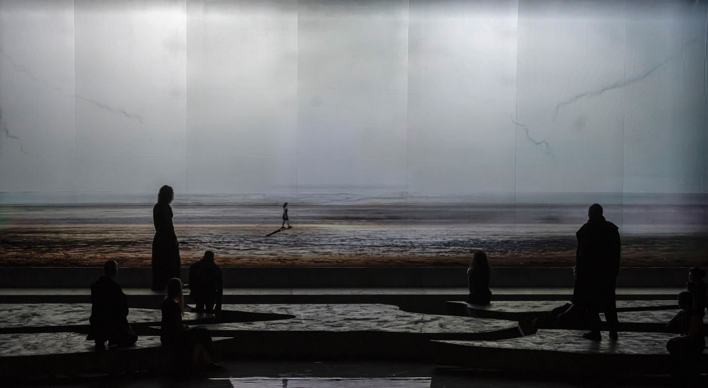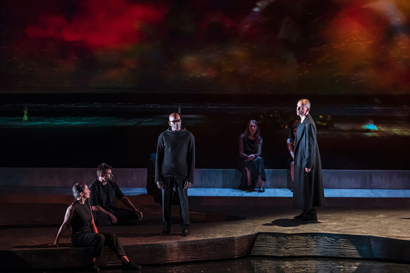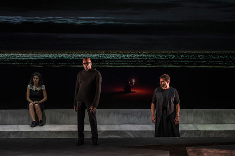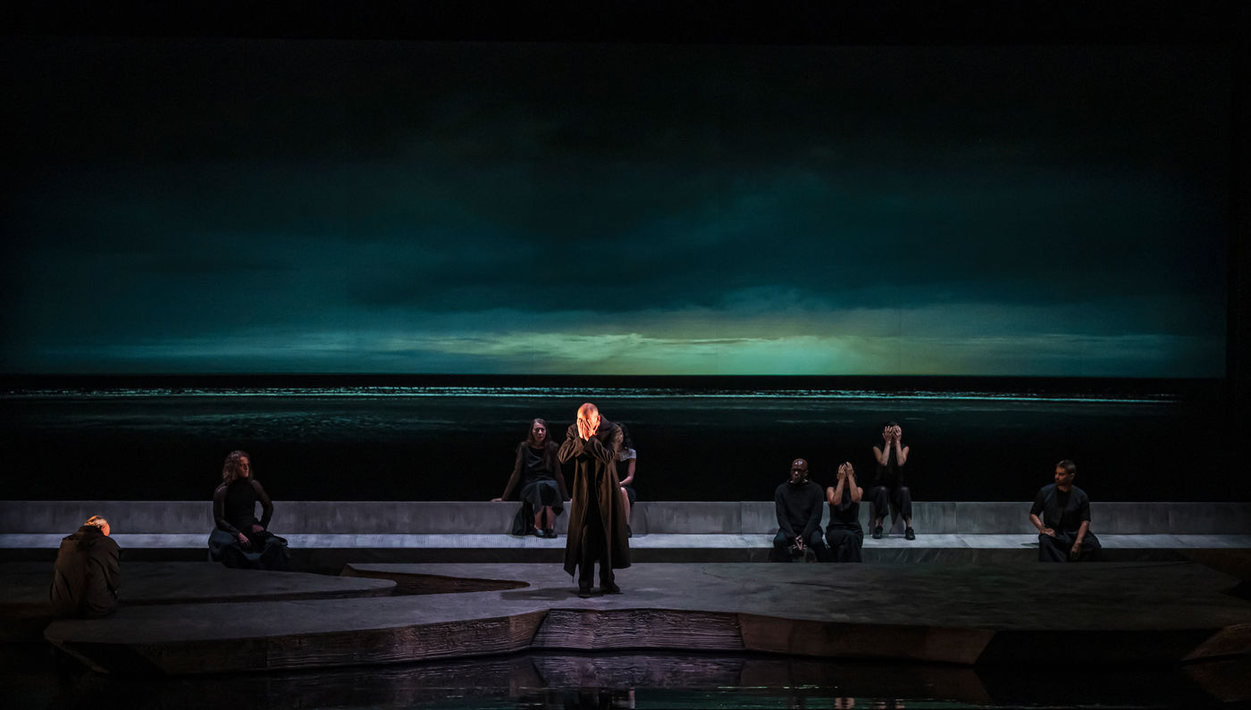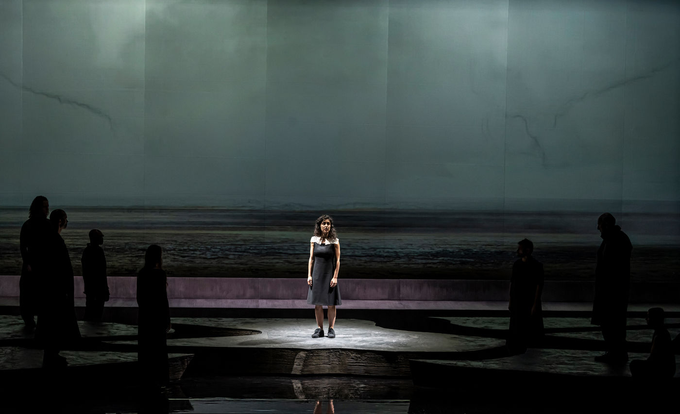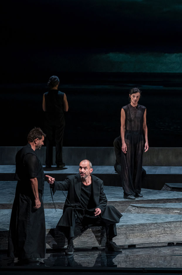 IPHIGENIE texte de Tiago Rodrigues mise en scene de Anne Theron avec Carolina Amaral (Iphigenie), Fanny Avram (le Choeur), Joao Cravo Cardoso (Achille), Alex Descas (Menelas), Vincent Dissez (Agamemnon), Mireille Herbstmeyer (Clytemnestre), Julie Moreau (le Choeur), Philippe Morier-Genoud (le Messager le Vieillard le Choeur) et Richard Sammut (Ulysse) a l Opera du Grand Avignon Festival d Avignon 2022. Photographie de Pascal Gely / Hans Lucas