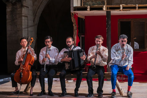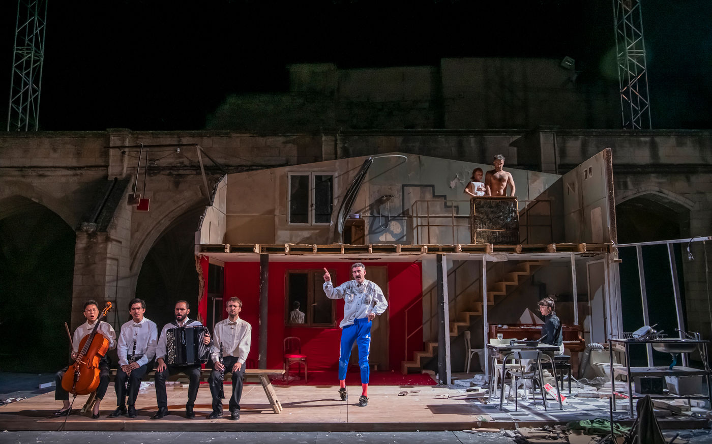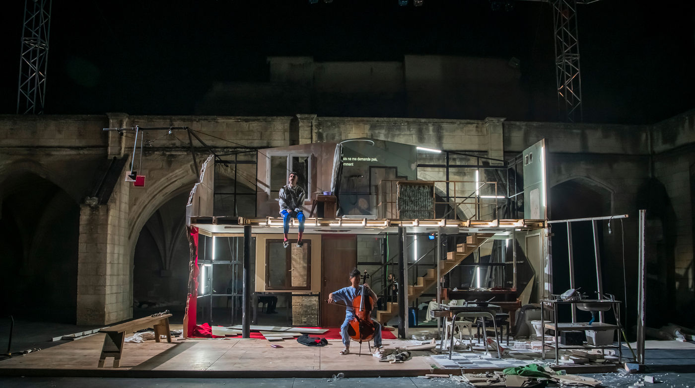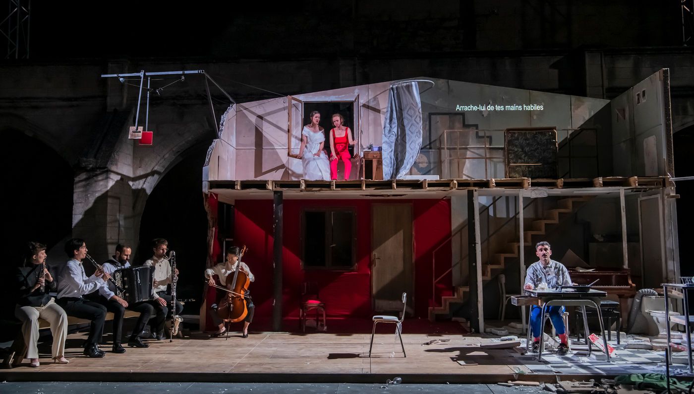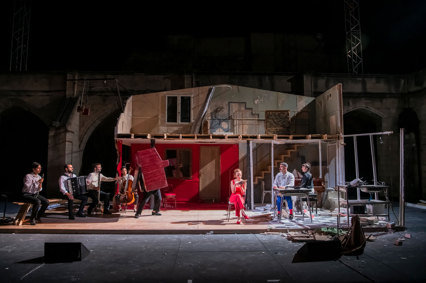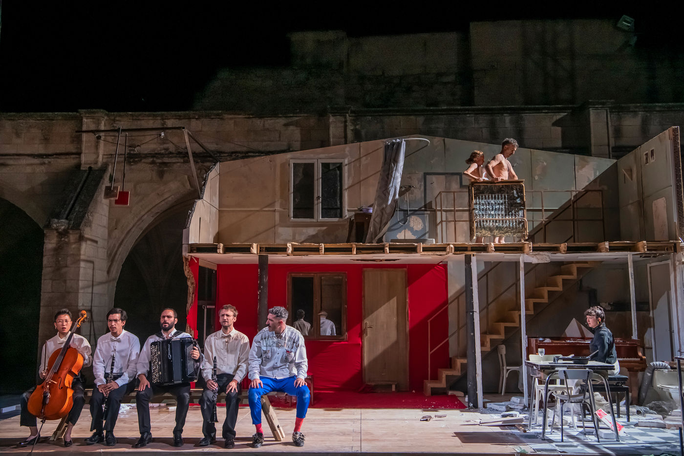 SANS TAMBOUR directed by Samuel Achache with Gulrim Choi, Lionel Dray, Antonin-Tri Hang, Florent Hubert, Sebastien Innocenti, Sarah La Picard, Leo-Antonin Lutinier, Agathe Peyrat and Eve Rissier at the Cloitre des Carmes Festival d Avignon 2022. Photograph by Pascal Gely / Hans Lucas