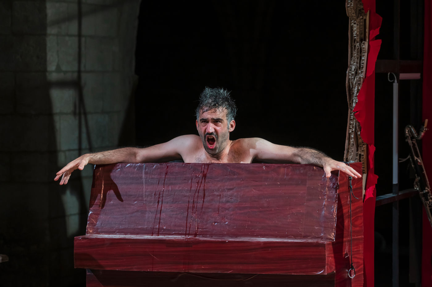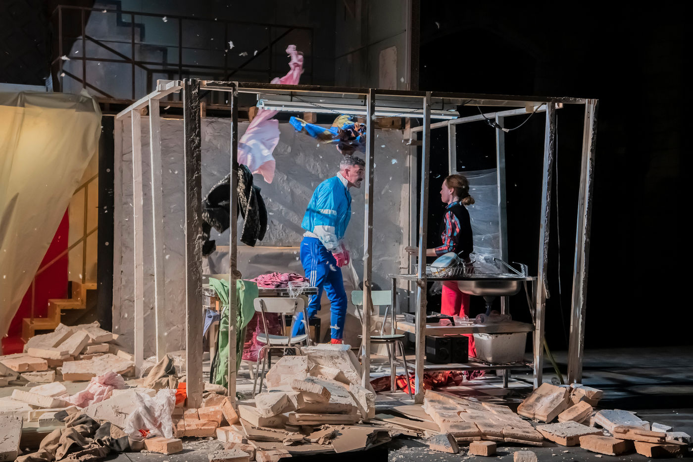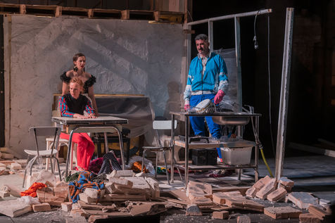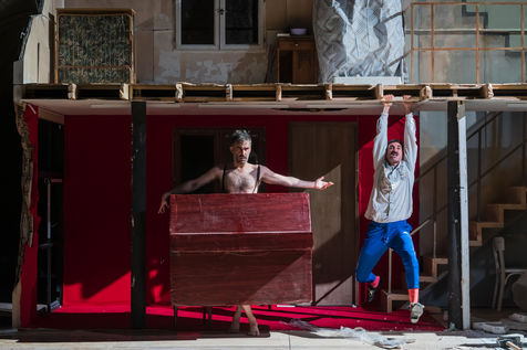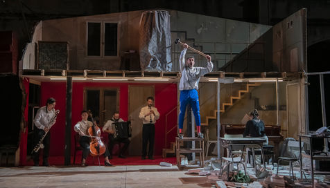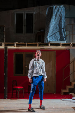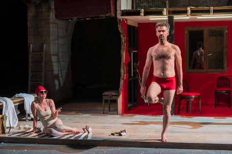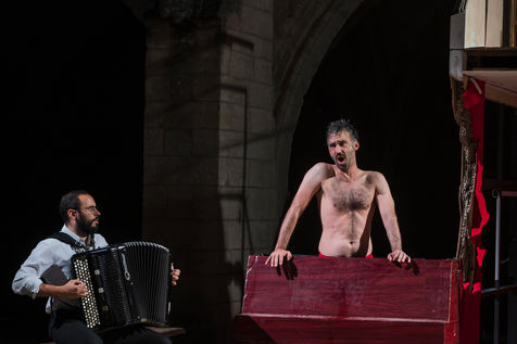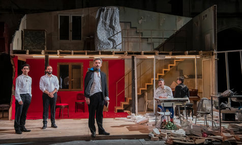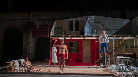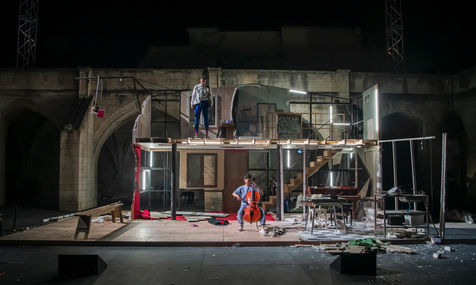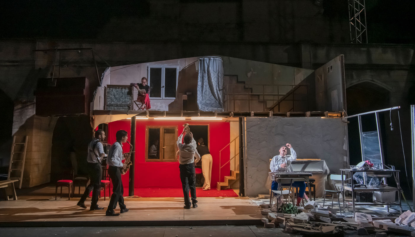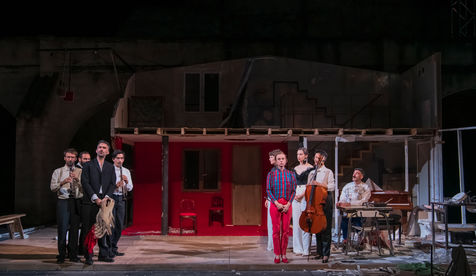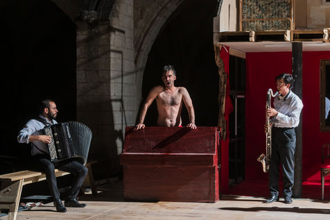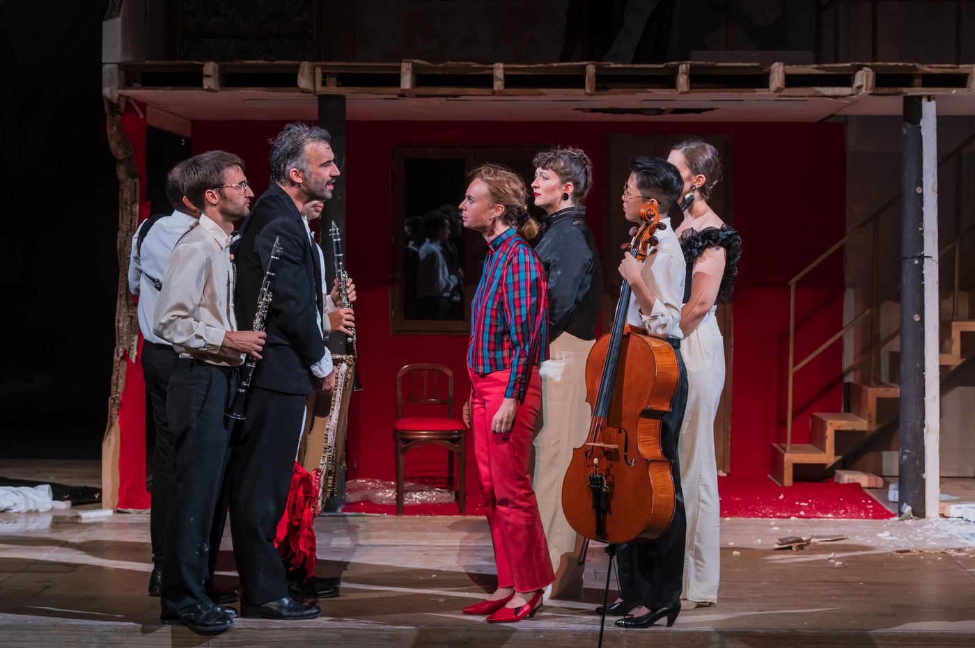 SANS TAMBOUR directed by Samuel Achache with Gulrim Choi, Lionel Dray, Antonin-Tri Hang, Florent Hubert, Sebastien Innocenti, Sarah La Picard, Leo-Antonin Lutinier, Agathe Peyrat and Eve Rissier at the Cloitre des Carmes Festival d Avignon 2022. Photograph by Pascal Gely / Hans Lucas