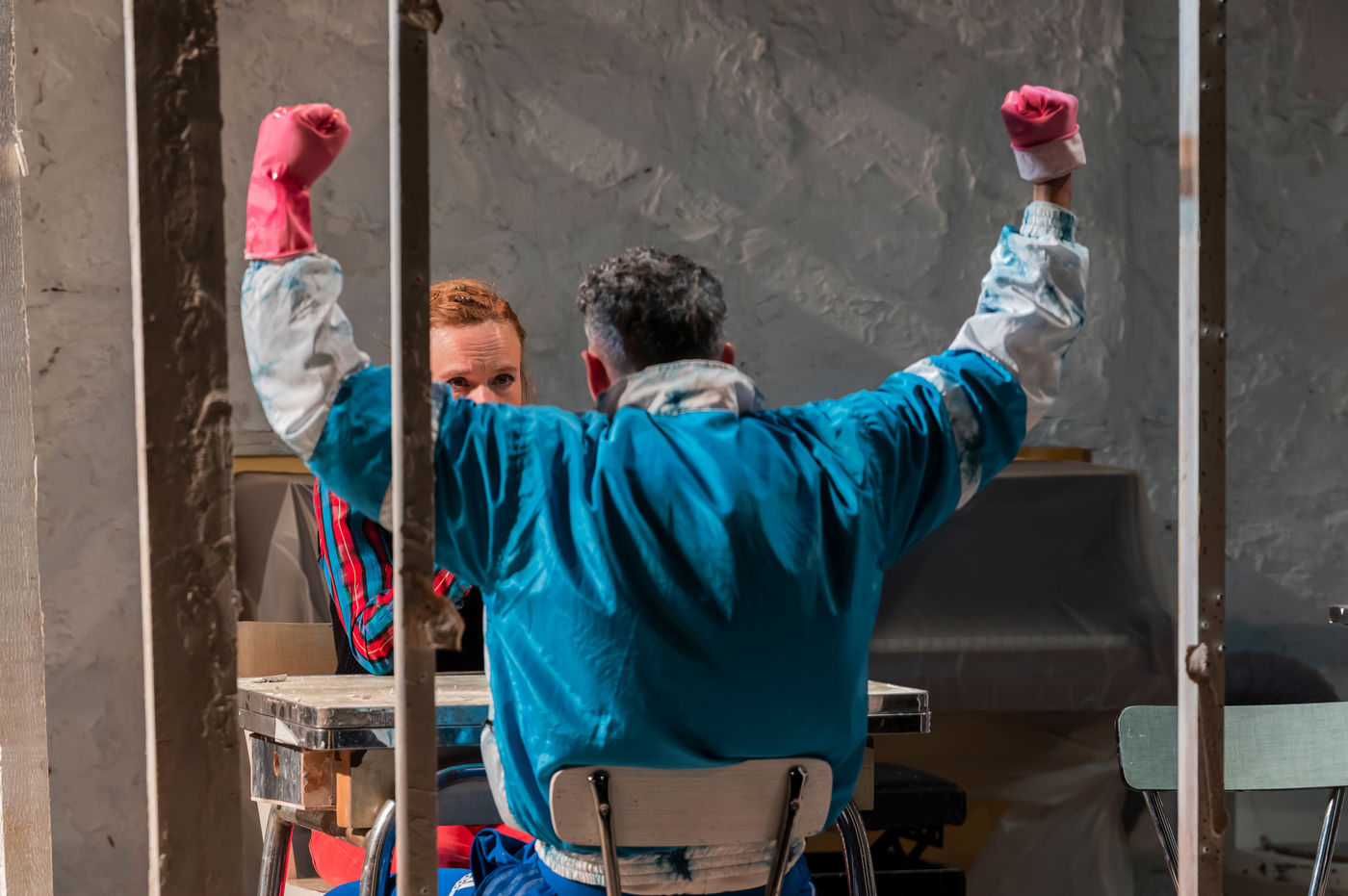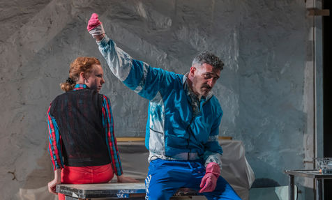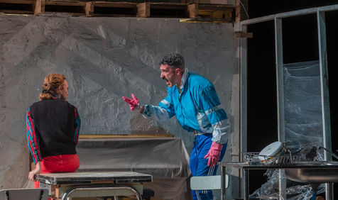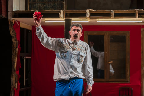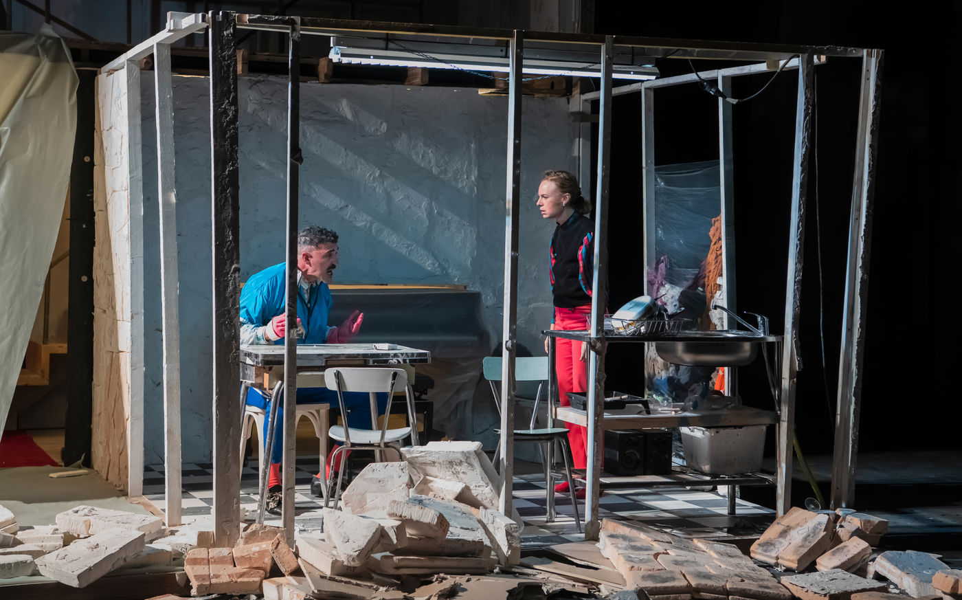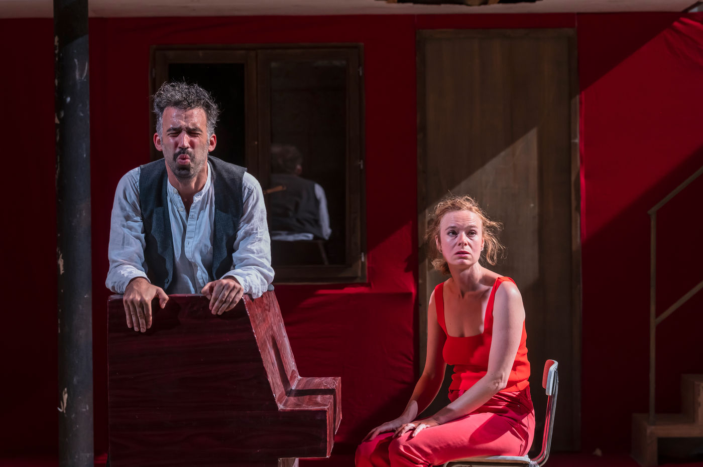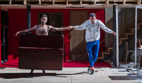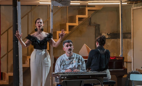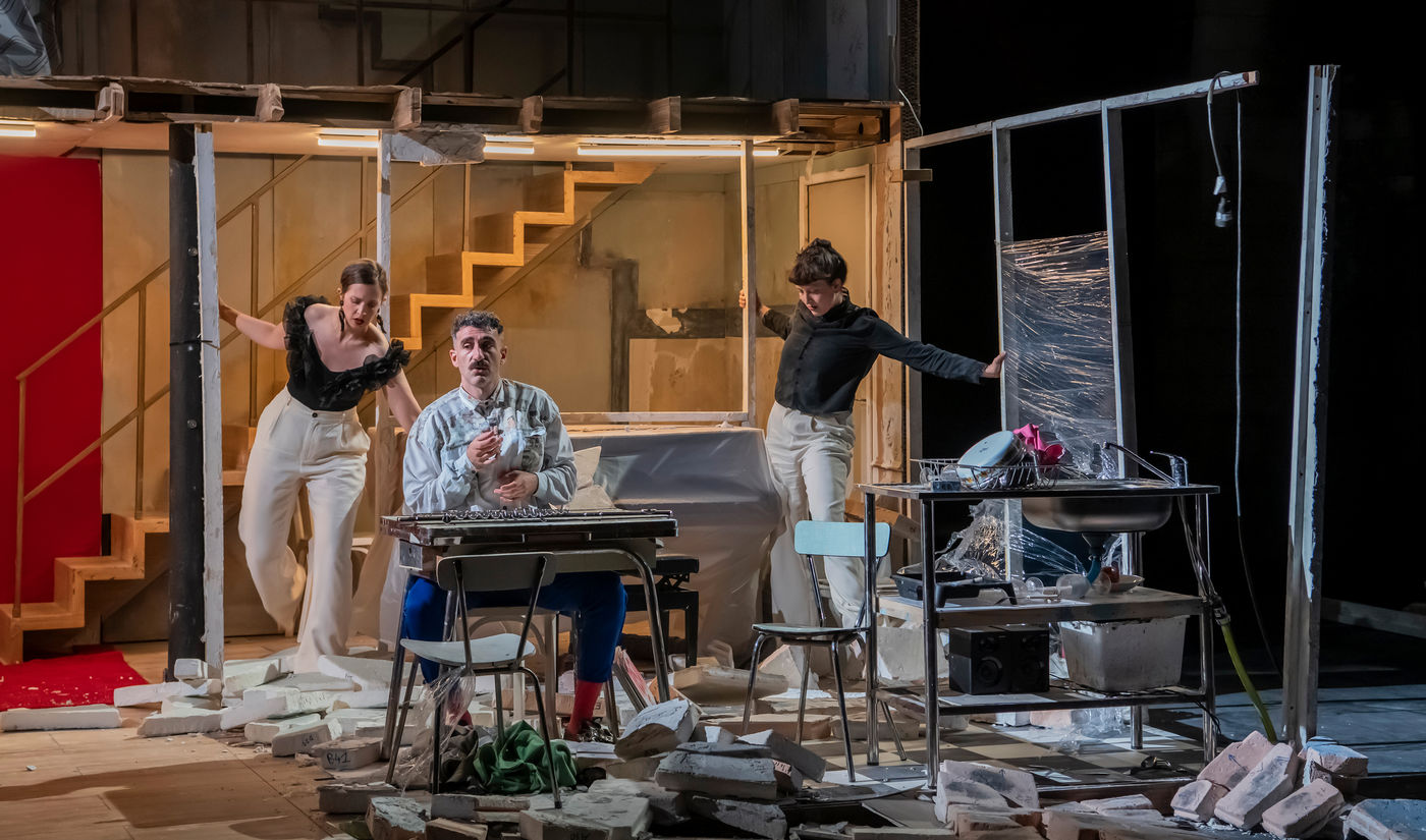 SANS TAMBOUR directed by Samuel Achache with Gulrim Choi, Lionel Dray, Antonin-Tri Hang, Florent Hubert, Sebastien Innocenti, Sarah La Picard, Leo-Antonin Lutinier, Agathe Peyrat and Eve Rissier at the Cloitre des Carmes Festival d Avignon 2022. Photograph by Pascal Gely / Hans Lucas