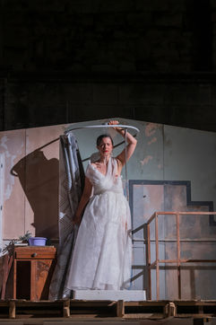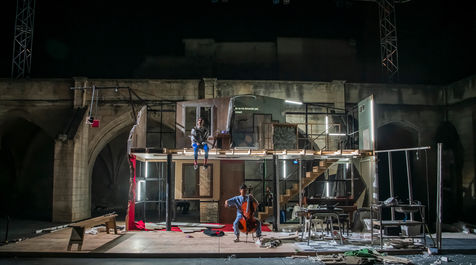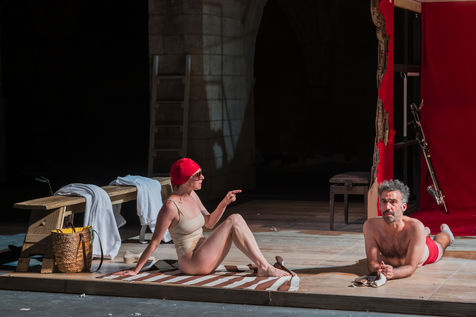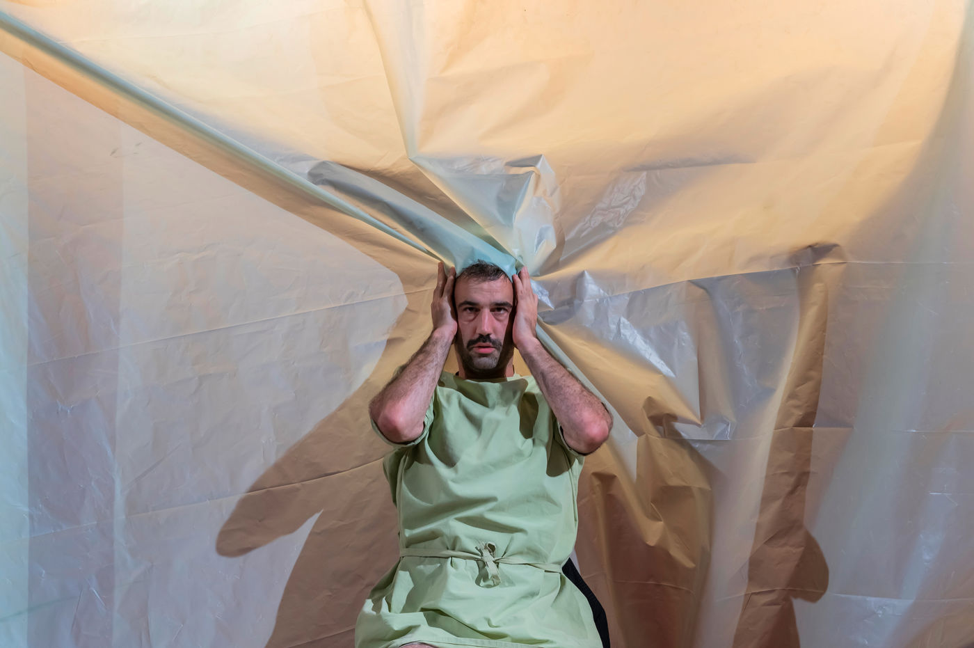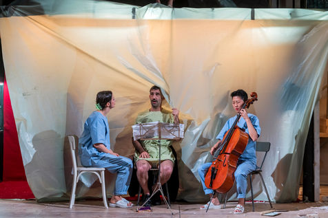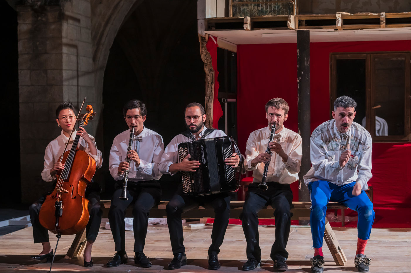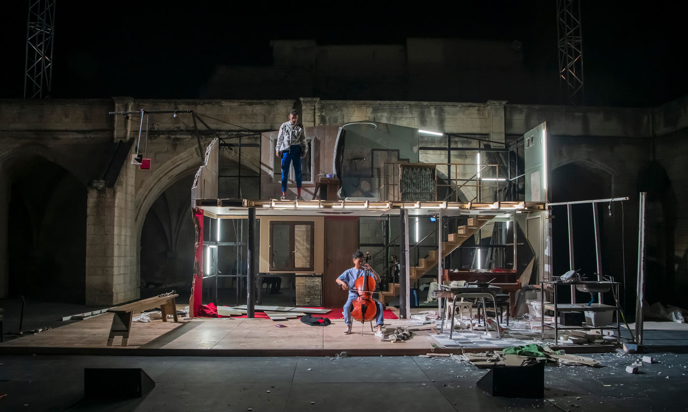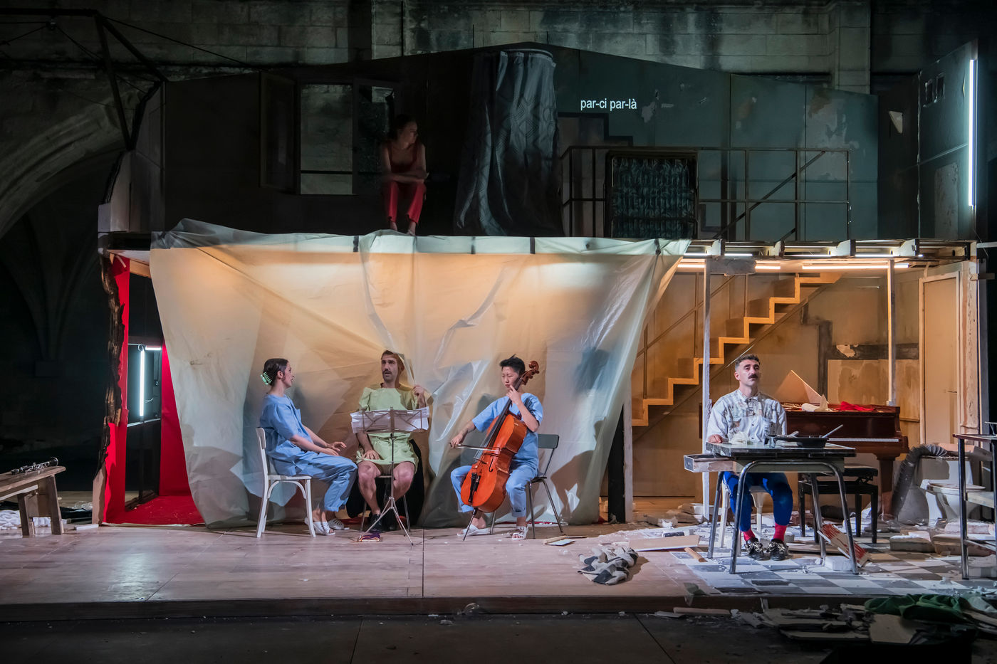 SANS TAMBOUR mise en scene de Samuel Achache avec Gulrim Choi, Lionel Dray, Antonin-Tri Hang, Florent Hubert, Sebastien Innocenti, Sarah La Picard, Leo-Antonin Lutinier, Agathe Peyrat et Eve Rissier au Cloitre des Carmes Festival d Avignon 2022. Photographie de Pascal Gely / Hans Lucas