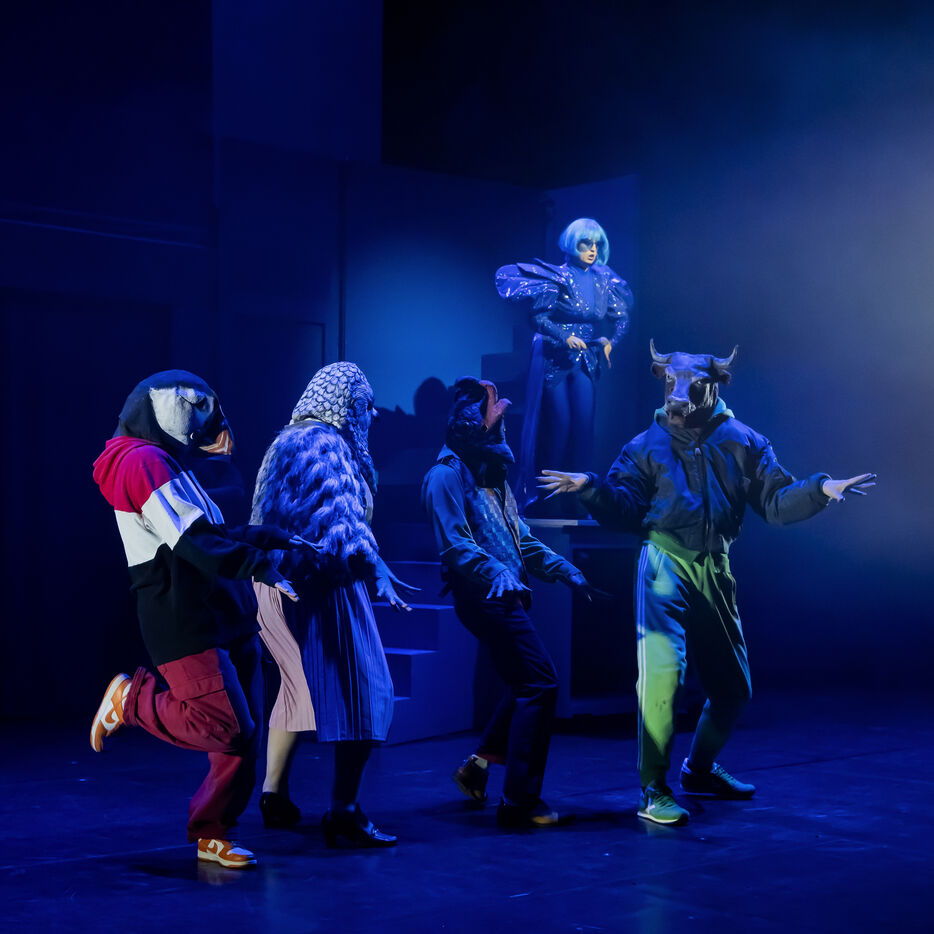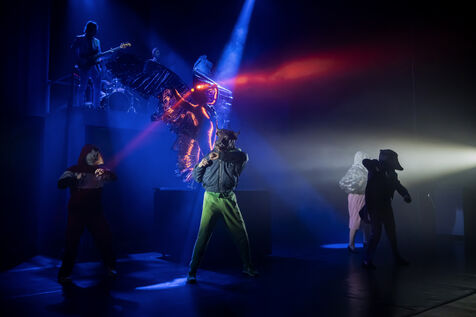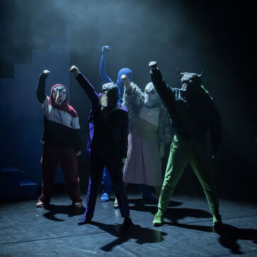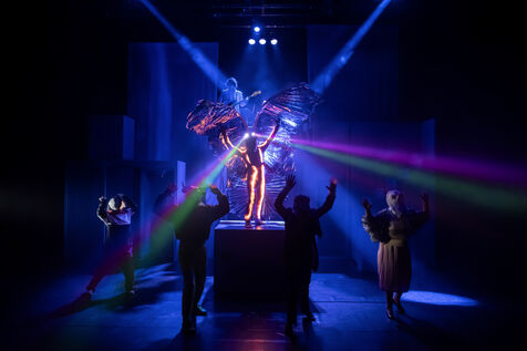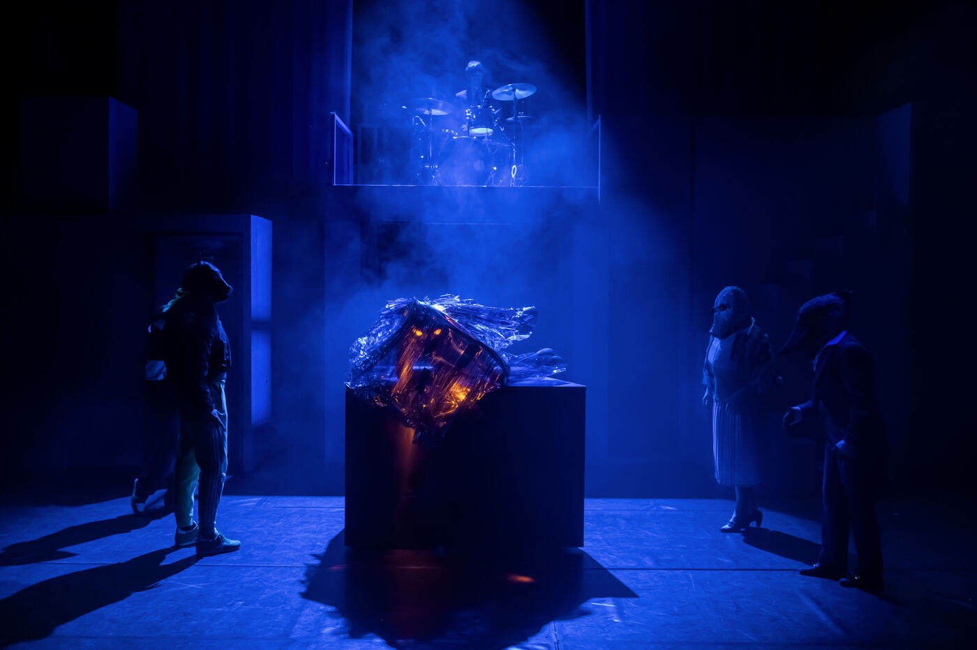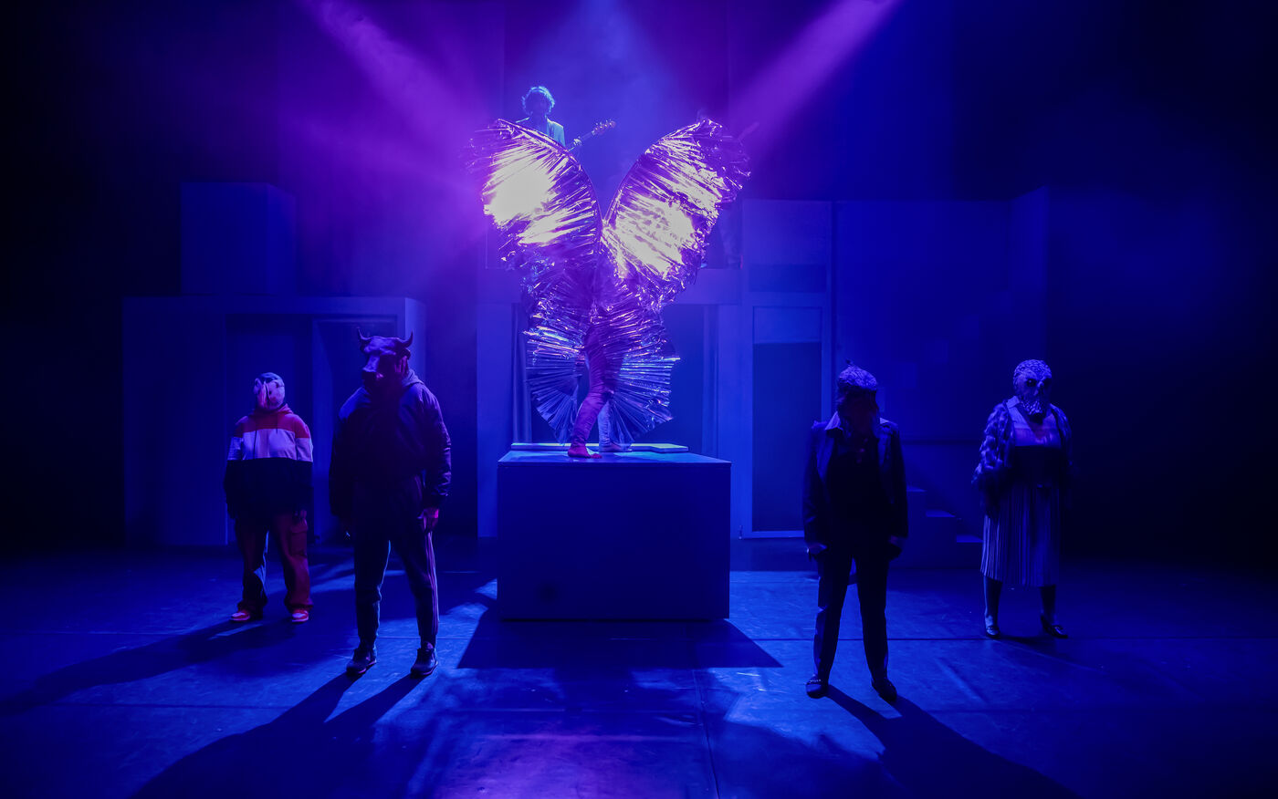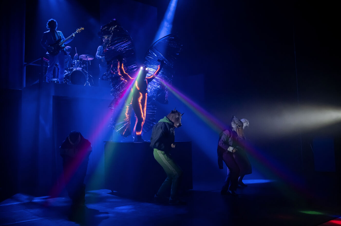 HAPPY APOCALYPSE Creation by FOUIC Company Staging by Clotilde Morgieve and Jean-Christophe Dolle with Sol Espeche, Yann de Monterno, Geraldine Roguez, Clotilde Morgieve and Jean-Christophe Dolle Music by Noe Dolle, Laurent Guillet and Pierre Martin-Danos Scenography and suits by Marie Herve Lights by Simon Demeslay Sound by Georges Hubert at the Theatre Antoine Watteau. Photograph by Pascal Gely / Hans Lucas