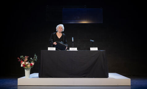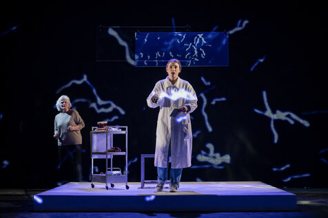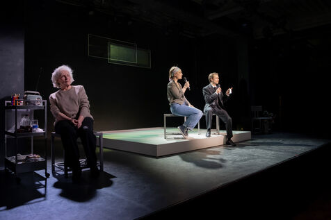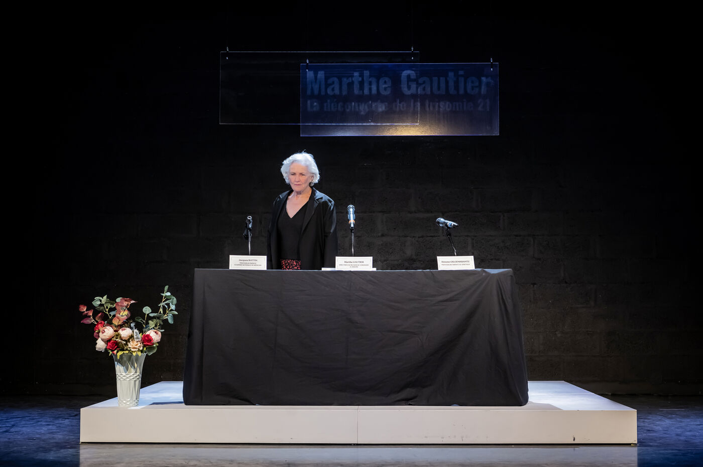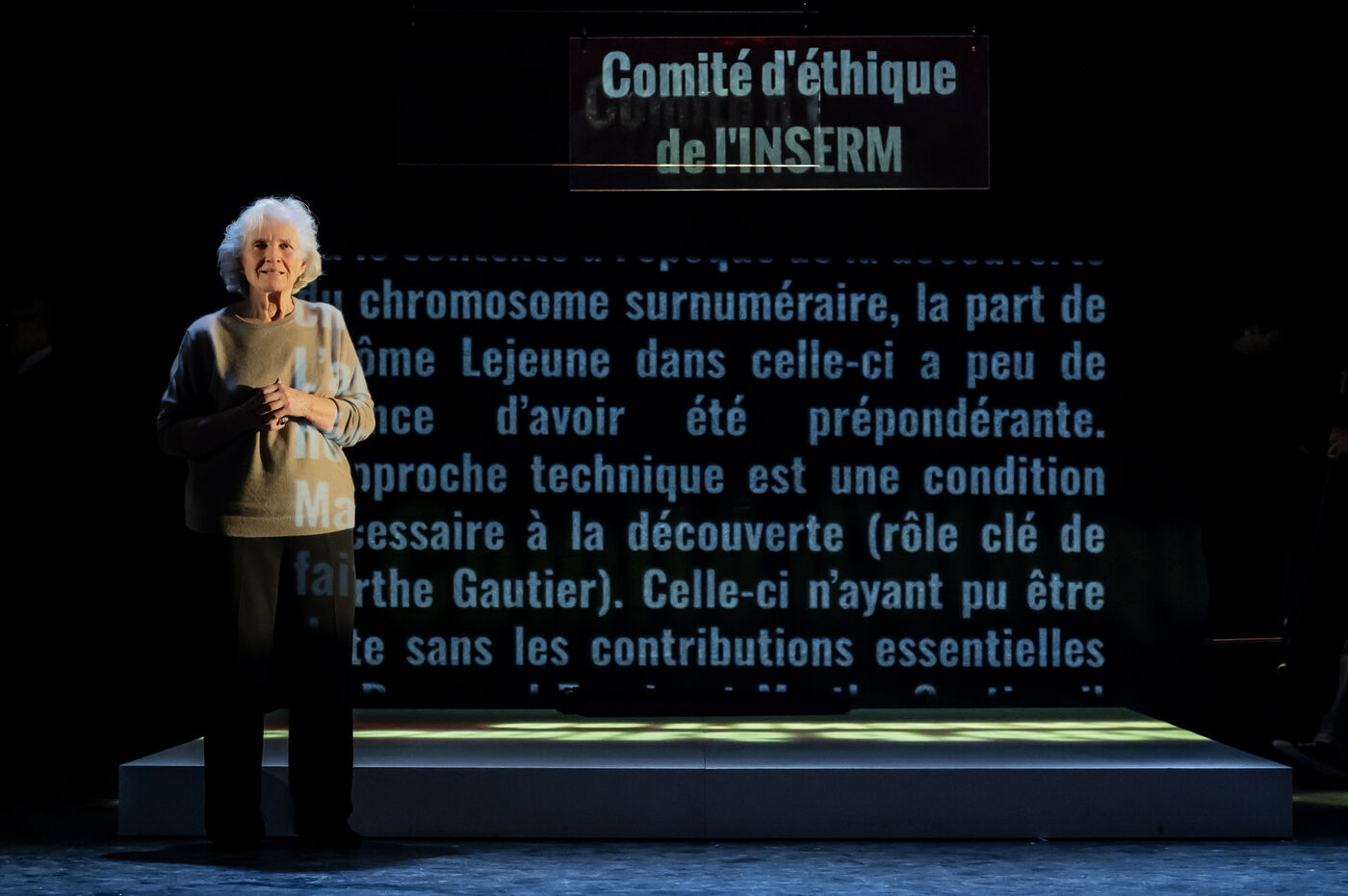 LA DECOUVREUSE OUBLIEE Marthe Gautier et la decouverte de la trisomie 21 Text by Elisabeth Bouchaud Stage Directing Julie Timmerman, Assistant Director Veronique Bret, Scenography by Luca Antonucci, Lighting by Philippe Sazerat, Suit by Muriel Mellet, Sound by Mme Miniature, Video by Thomas Bouvet and Accessories by Olivier Defrocourt with Marie-Christine Barrault, Marie Toscan, Matila Malliarakis and Mathieu Desfemmes at the Theatre de la Reine Blanche. Photograph by Pascal Gely / Hans Lucas