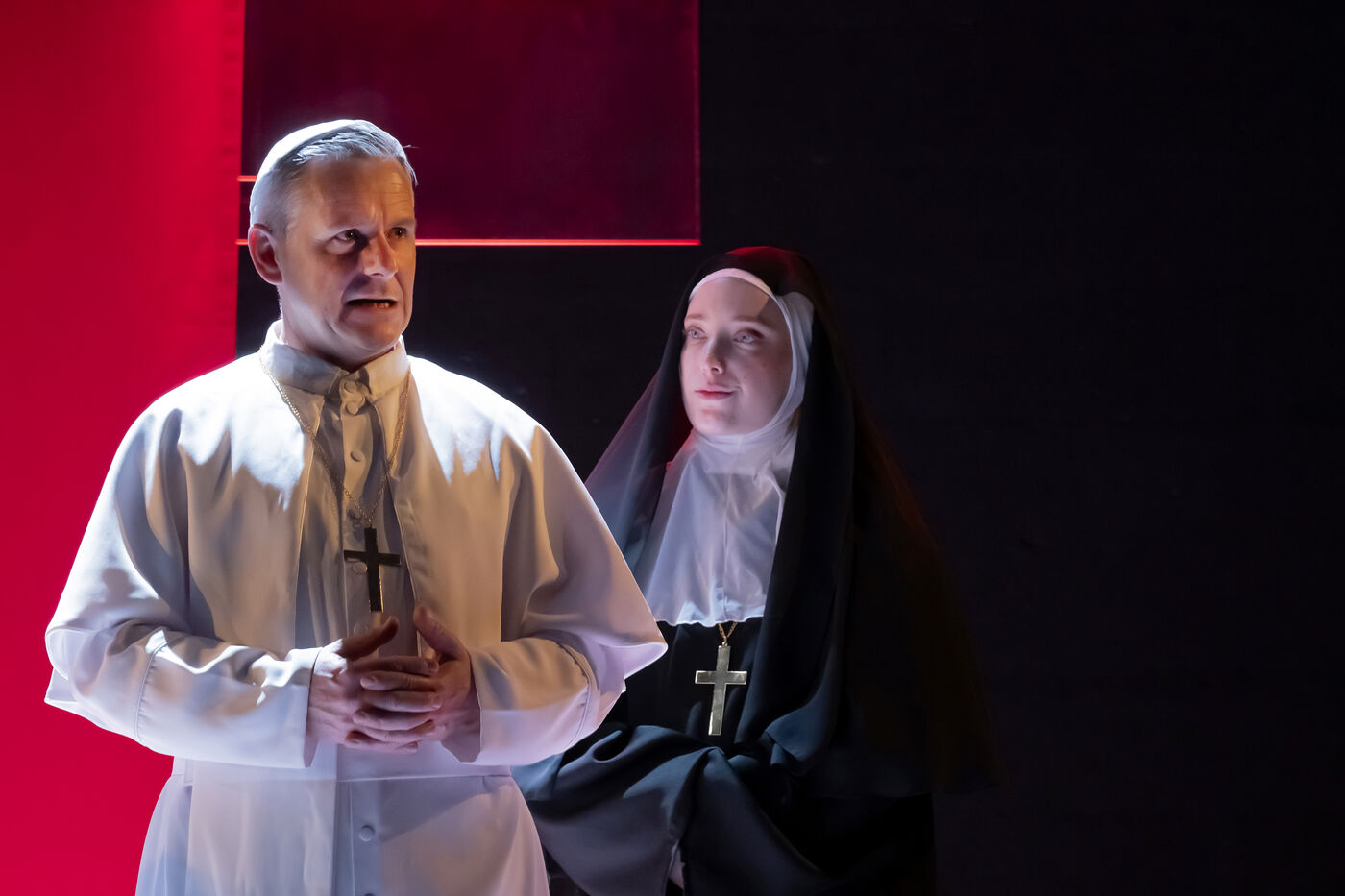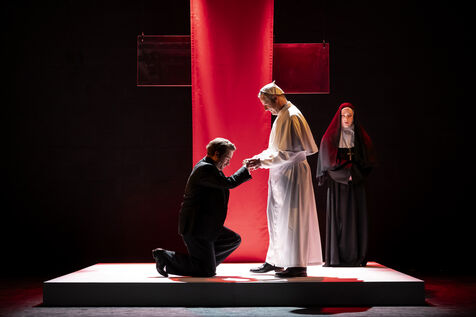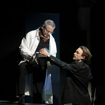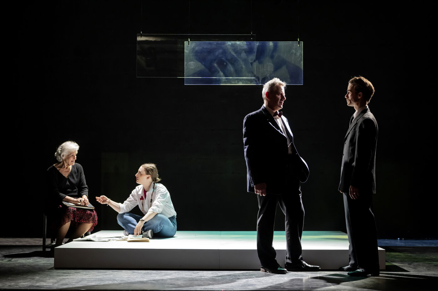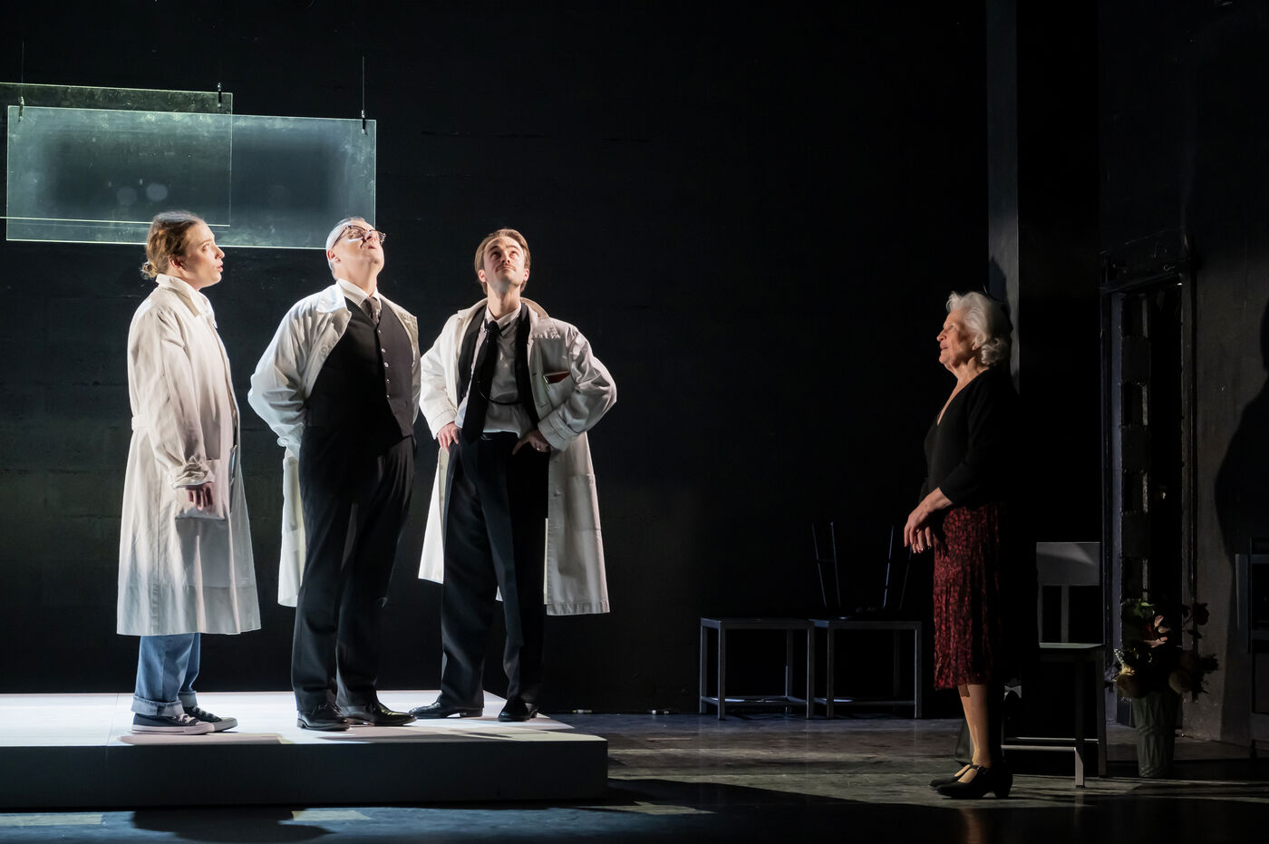 LA DECOUVREUSE OUBLIEE Marthe Gautier et la decouverte de la trisomie 21 Text by Elisabeth Bouchaud Stage Directing Julie Timmerman, Assistant Director Veronique Bret, Scenography by Luca Antonucci, Lighting by Philippe Sazerat, Suit by Muriel Mellet, Sound by Mme Miniature, Video by Thomas Bouvet and Accessories by Olivier Defrocourt with Marie-Christine Barrault, Marie Toscan, Matila Malliarakis and Mathieu Desfemmes at the Theatre de la Reine Blanche. Photograph by Pascal Gely / Hans Lucas