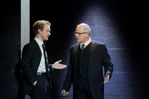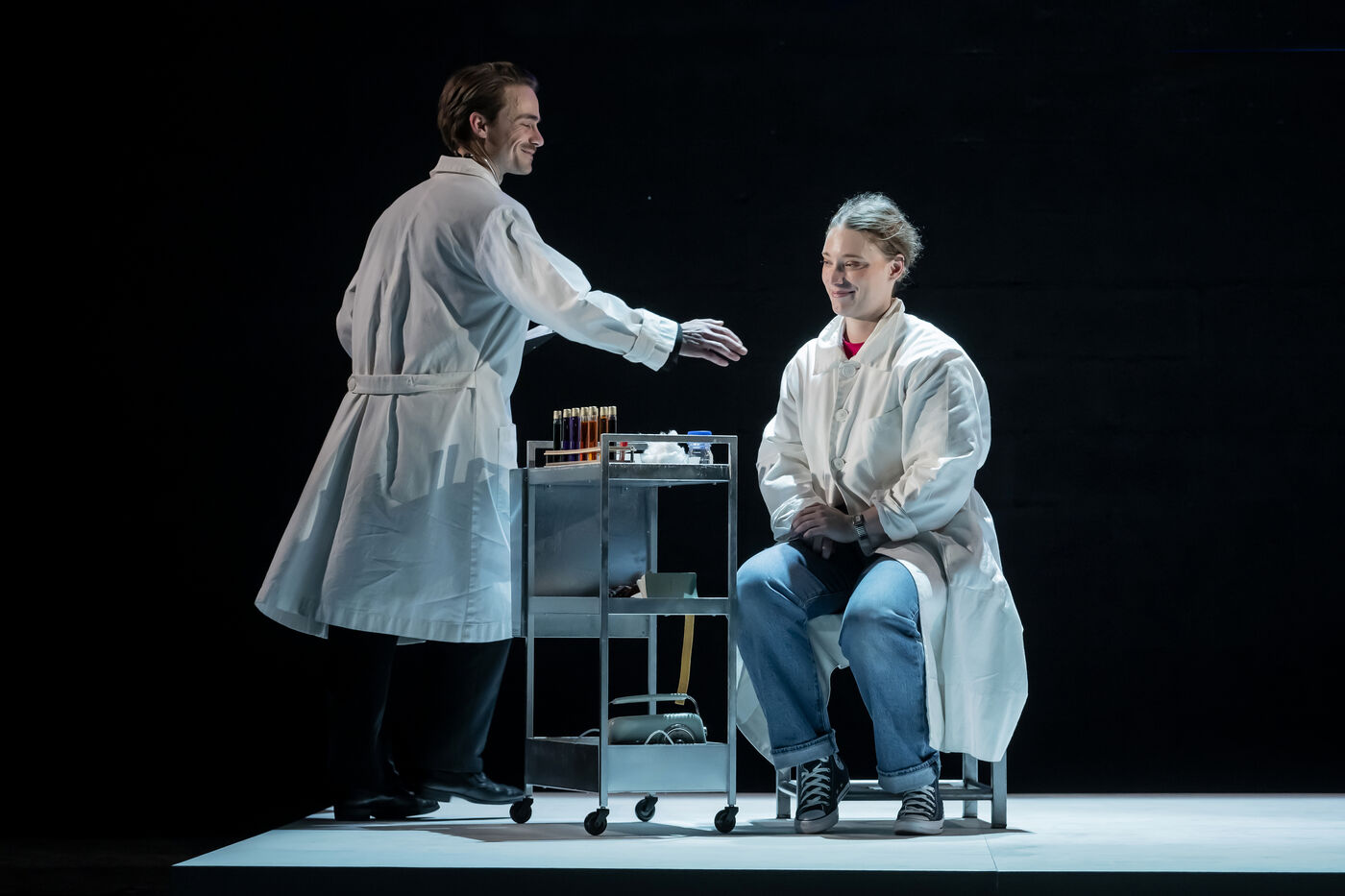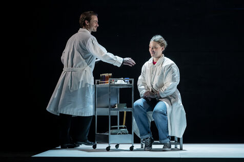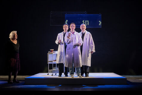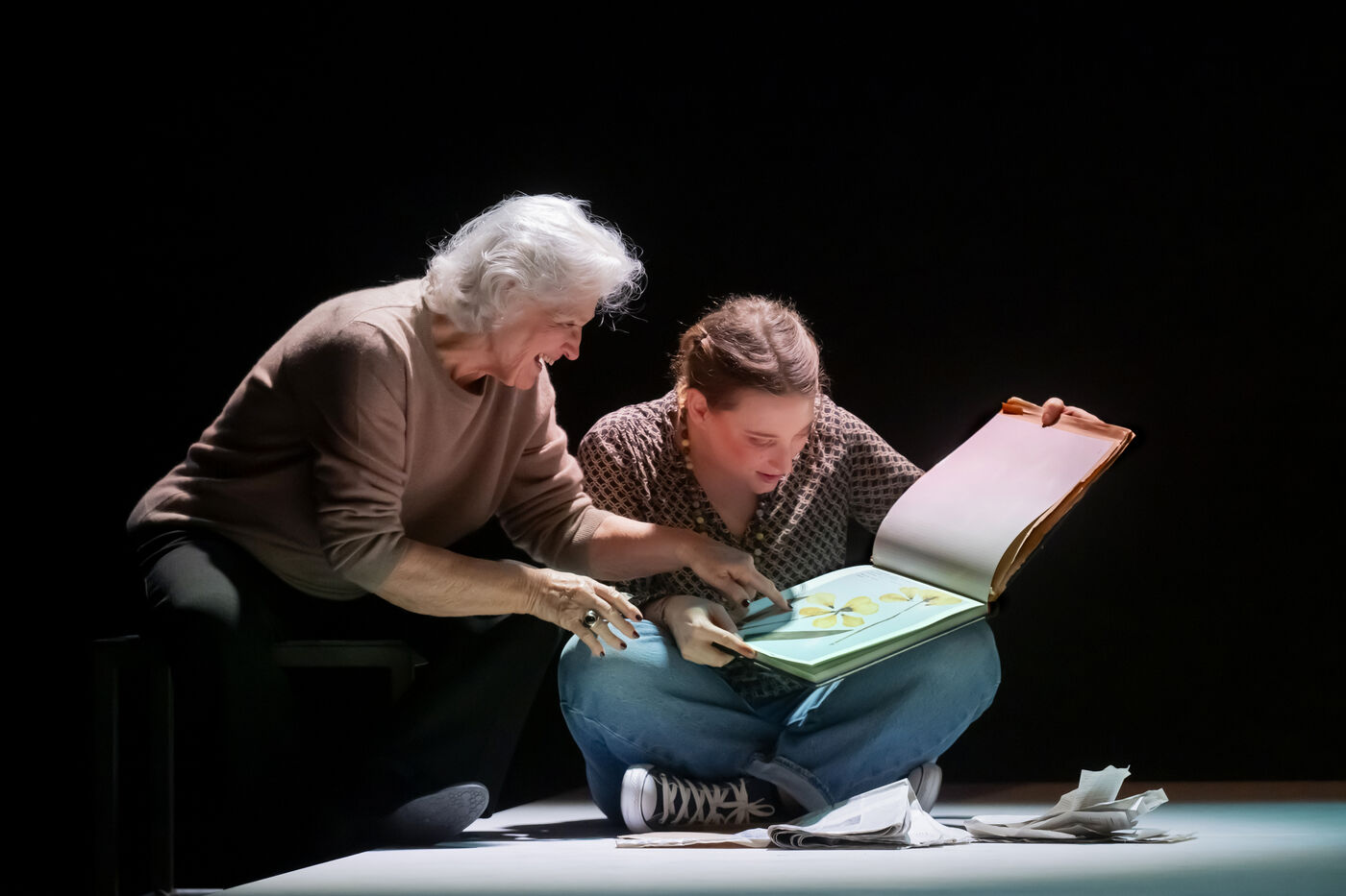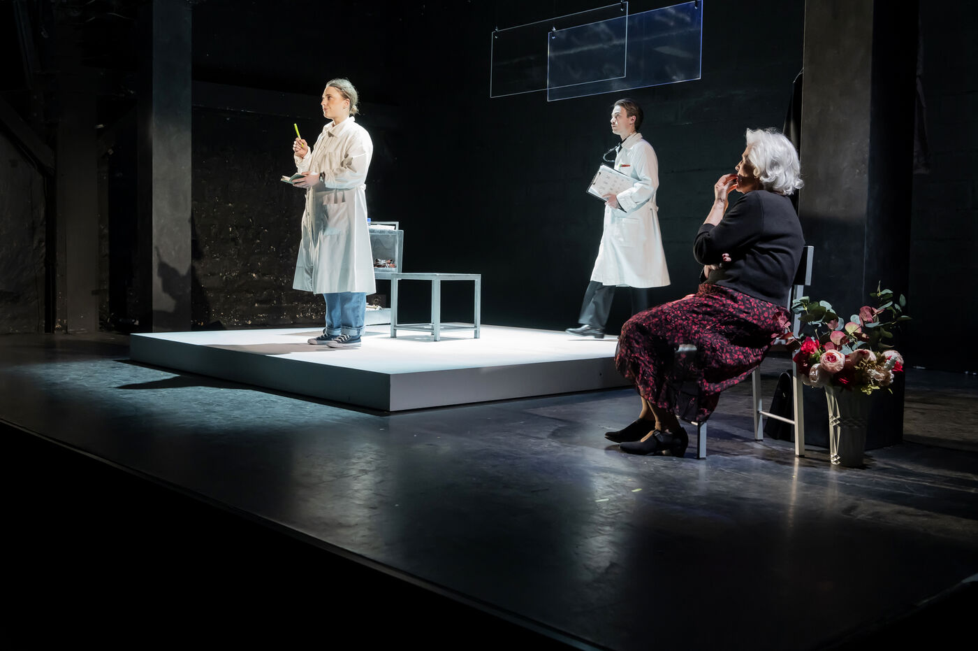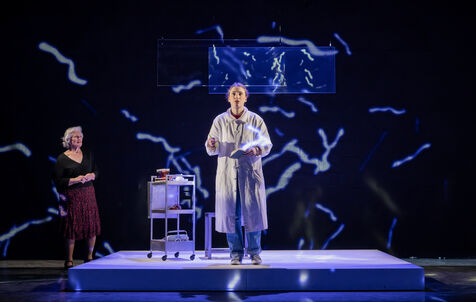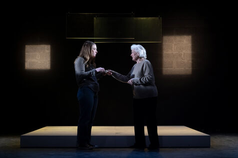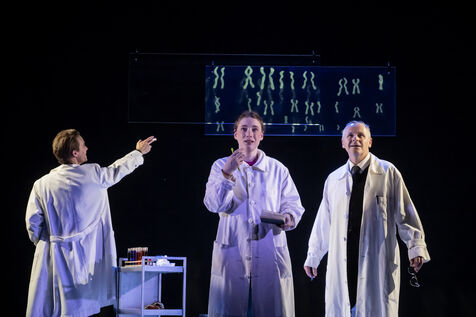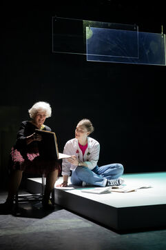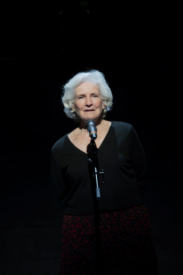 LA DECOUVREUSE OUBLIEE Marthe Gautier et la decouverte de la trisomie 21 Texte de Elisabeth Bouchaud Mise en scene de Julie Timmerman, Assistante Mise en scene Veronique Bret, Scenographie de Luca Antonucci, Lumieres de Philippe Sazerat, Costumes de Muriel Mellet, Son de Mme Miniature, Video de Thomas Bouvet et Accessoires by Olivier Defrocourt, avec Marie-Christine Barrault, Marie Toscan, Matila Malliarakis et Mathieu Desfemmes at the Theatre de la Reine Blanche. Photographie de Pascal Gely / Hans Lucas