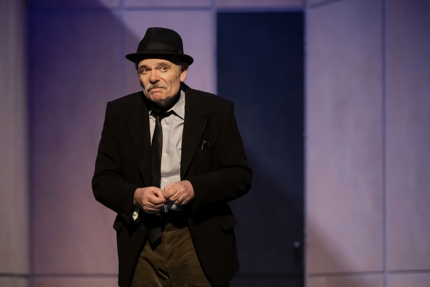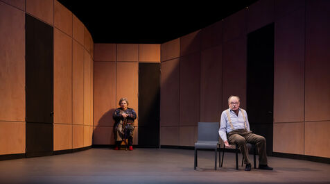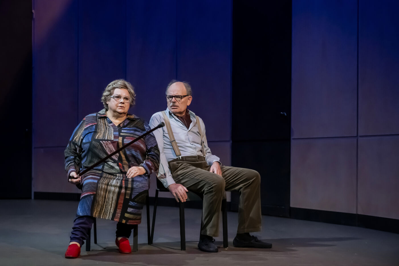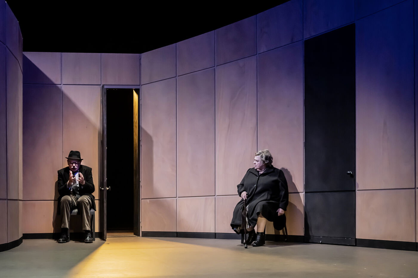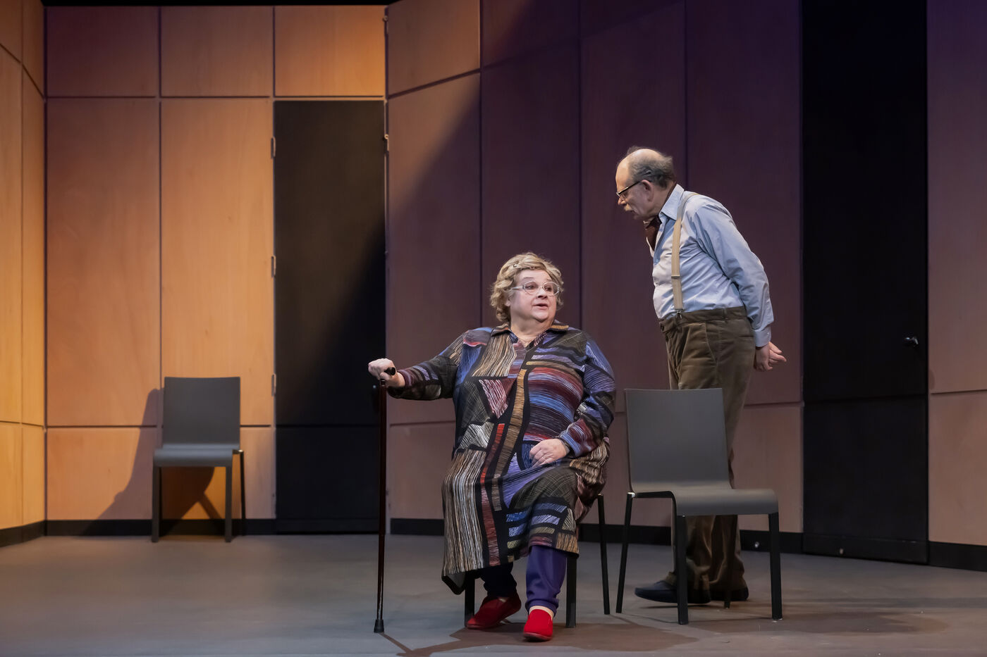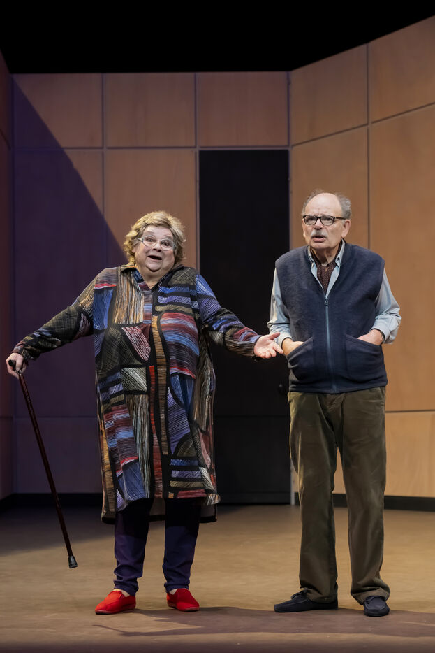 DANS LE COULOIR Text Jean-Claude Grumberg Stage directing Charles Tordjman Assistant director Pauline MASSON Set design Vincent Tordjman Lighting Christian Pinaud Suits Anne Yarmola Music Vicnet with Christine Murillo and Jean-Pierre Darroussin at the Theatre Hebertot. Photograph by Pascal Gely / Hans Lucas