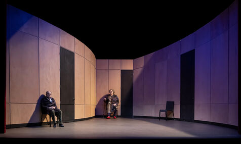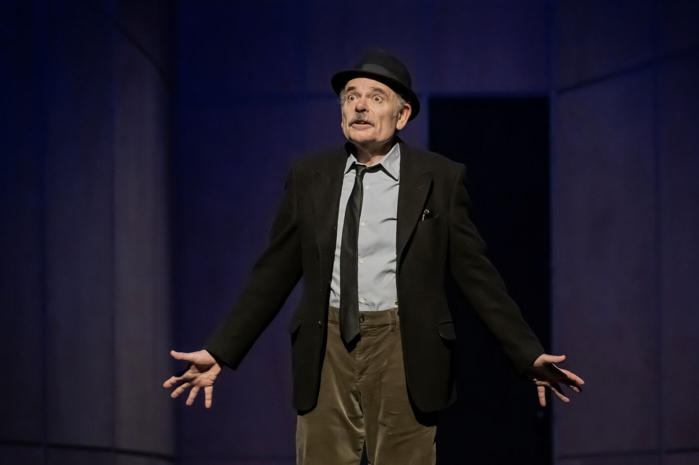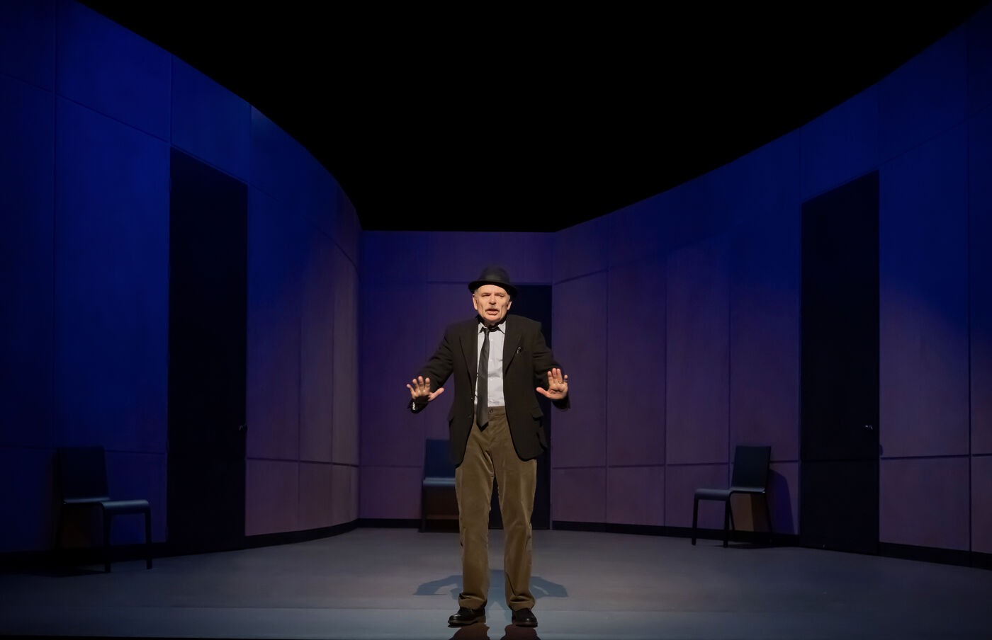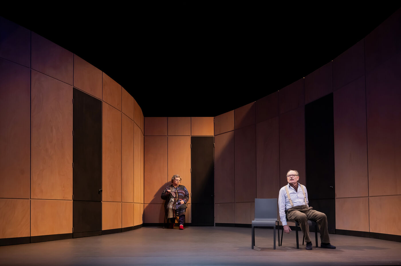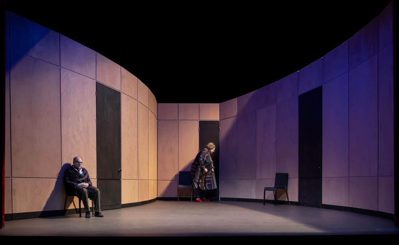 DANS LE COULOIR Text Jean-Claude Grumberg Stage directing Charles Tordjman Assistant director Pauline MASSON Set design Vincent Tordjman Lighting Christian Pinaud Suits Anne Yarmola Music Vicnet with Christine Murillo and Jean-Pierre Darroussin at the Theatre Hebertot. Photograph by Pascal Gely / Hans Lucas