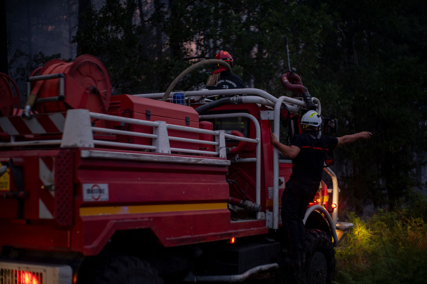 Les pompiers tentent de contenir les feux avant la tombee de la nuit à Guillos.