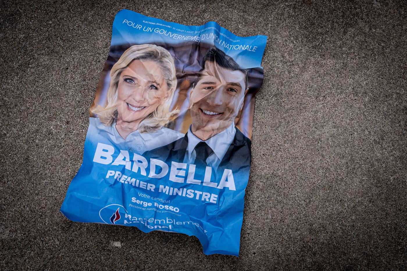 Rassemblement National candidate's, Jordan Bardella, crumpled electoral leaflet.
