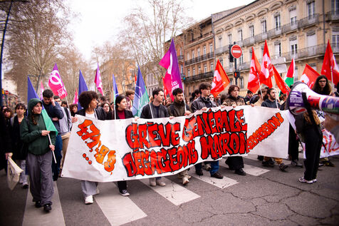 Manifestation étudiante contre les politiques d'austérité et les coupes budgétaires menées par le gouvernement d'Emmanuel Macron notamment dans la recherche et le supérieur, et mises en regard des fonds annoncés pour financer l'armée. Toulouse, le 13 mars 2025.